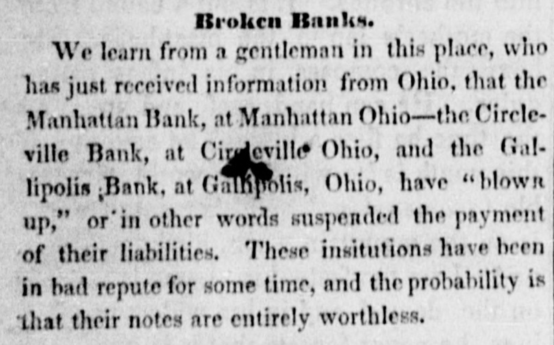 Broken Banks. We learn from a gentleman in this place, who has just received information from Ohio, that the Manhattan Bank, at Manhattan Ohio-the Circleville Bank, at Circleville Ohio, and the Gallipolis Bank, at Galhpolis, Ohio, have "blowr up," or in other words suspended the payment of their liabilities. These insitutions have been in bad repute for some time, and the probability is that their notes are entirely worthless.