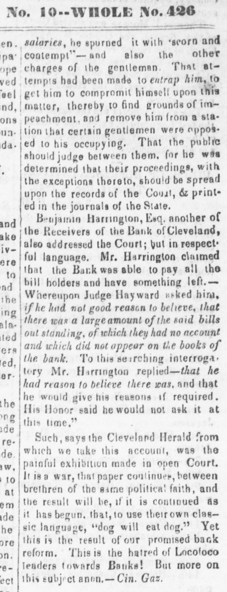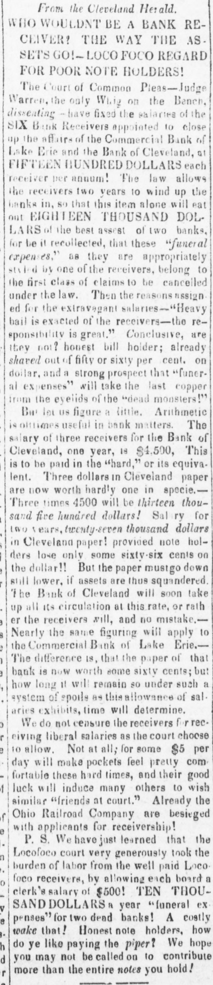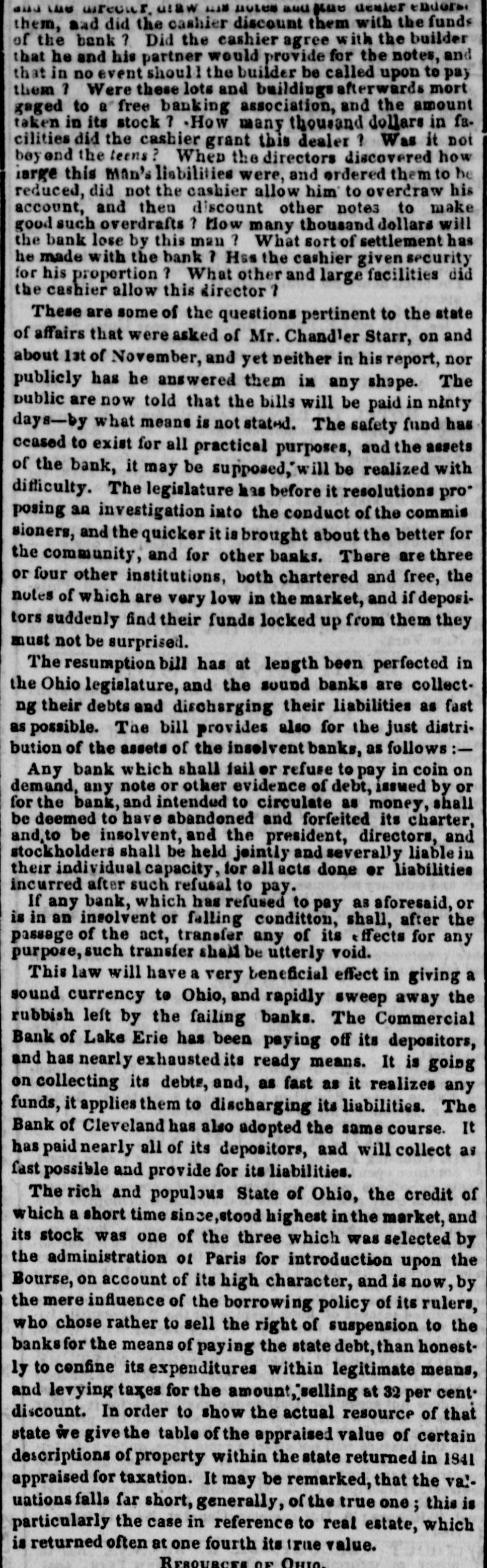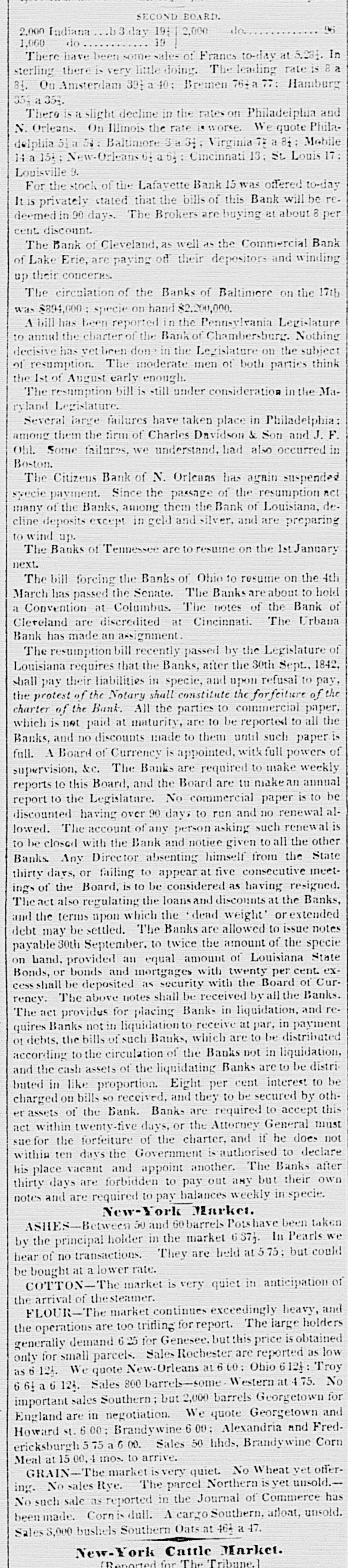 # SECOND BOARD. 1,000 Illinois.... 18 4,000 do..s 10 days 20 1,000 Indianas8 days 19 8,000 do... Thursday 19 2,000 do.... 19 2,000 dob 3 days 19 There has not been much change in Inland Bills. We quote- Philadelphia 7 a 71; Baltimore 3 a 31: Virginia 9 a 94; N. Carolina 5 a 51: Charleston 11 a 14; Savannah 24 a 2; Au- gusta 24 a 24; Macon 14; Columbus 15: Mobile 12 a 123: Montgomery 131; New-Orleans 6 a 61; Nashville 14 a 15; Louisville 9 a 10; Cincinnati a 16; Indiana 15 a 19; Illi- nois 25. We see by an advertisement that R. M. Blatchford, Esq. Receiver of the Commercial Bank, instead of paying thirty per cent dividend to the creditors of that institution to-day will to-morrow pay forty-four per cent. When will Gov. Marcy be prepared to pay a dividend to the creditors of the City Bank of Buffalo? He was appointed receiver some two years since and nothing has been heard of him since. The Express of yesterday says: The new Comptroller, Mr. Flagg, has sent a letter to the several banks of this city to whom the State of New-York is indebted, stating that the temporary loan borrowed of the banks, amounting to one million two hundred and five thousand dollars, and due on the 1st of March, will not be paid until the Comptrolier can raise money on new stocks, which are authorized to be issued. This is the first act of the new Comptroller, and a most se- rious one it is. The banks hereafter will be exceedingly cautious how they lend money even to the great and power- ful State of New-York, when it is in the hands of those who pay so little regard to its obligations. The Assembly of New-Jersey have passed the bill requir- ing the Banks to pay specie for $5 notes and under on the 4th of July next, and for all notes on the 1st October. The bill which passed the Council requires all notes to be paid in specie on the 4th of July. Should the Philadelphia Banks resume before the 1st October, the West Jersey Banks are required by the Assembly to do so also. The Cincinnati Gazette of the 3d says: 'The excitement among the people has become distressing. Whatever notes are held, they send to the broker's office to sell-the discount is not considered-what one sells another will buy. The banks yesterday determined, that if required to pay specie on the 4th of March, they must begin to prepare to protect themselves. They have determined that they would not that day receive the following notes-Urbana Bank, Com- mercial Bank of Lake Erie, Bank of Cleveland, Merchants' and Mechanics' Bank of Wheeling.' It has been stated that the Chillicothe Bank owned $75,- 000 of the stock of the Gerard Bank. This is now denied. The Chillicothe Gazette states that there are no rumors there to the discredit of that or the Lancaster Bank.