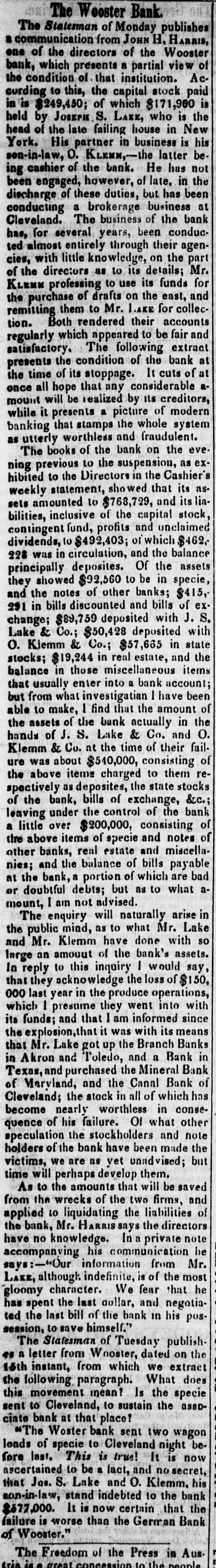 Bank. Wooster of The Monday Statesman publishes H. from JOHN of the the of one Wooster directors view which partial presents that Acinstitution. to stock paid of who the bank, condition this, of the which capital $171,900 is the is of head His curding in is $249,450; S. LAKE, house in New his York, partner O. the latter held by the JOSEPH late failing in business is be Kleum, He has not bank. in the discharge son-in-law, cashier of the however, of but late. has been at brokerage conducting of the The ing been engage hese of duties, business bank business been for has, years, conducClevelandeveral their ted agenthrough almost entirely on the with little part cies, wledge, to as its Mr. the of details; directors to its for use funds KLENN of on the and east, professing the purchase to for Mr. lake collectheir tion. accounts and which following remitting Both them rendered nppeared to be extract fair at bank presents of the time stoppage. all satisfactory. regularly condition The of the It cuts of at that any hope once considerable its by creditors, mount of it modern while picture presents the that whole stamps system banking and worthless fraudulent. utlerly on the of the bank evebooks exthe to suspensions and ning The previous the Directors to she wed in the that its its lia- ashibited weekly statement, 10 $768,729, capital stock, bilities, seis amounted inclusive fund, profits of the of and which unclaimed $462, dividends, contingen was in to circulation, $492,403; and of the the in balance specie, assets of bills they principally 223 showed notes deposites. $92,560 other to and banks; be $415, of J. ex- S. and 291 the in bills $89,759 discounted $50,428 deposited deposited with in state with & and into change; o. Lake Kiemm $19,244 Co.; & Co.; in real $57,685 estate, items the miscellaneouscount; have stocks; in those bank been to able of the balance that usually what enter investigation amount the of the assets J. S. of Co. Like hands but from make, 1 find bank that actually and in O. at of the & Co. time their fail. Klemm of was ure about consisting $540,000, to them items above charged the state stocks deposites, &C.: as bills of exchange, of the bank of a little of items above specie the spectively of the bank, under the control consisting notes of and real estate leaving ove: $200,000, and miscellabills payable other the nies; and banks, bank, the a balance portion but of of as which to what are bad mount, in will arise or at the doubtful ain debts; not advised. naturally Mr. Lake the public Mr. have and Klemm of The enquiry mind, as to what done with so the assets. bank's In would say, reply that they acknowledge in the last year produce large an amount to this inquiry the loss operations, of $150, into with went they since which 000 I presume and that am informed with its means its funds; explosion. that it up was the Branch Bank Banks in the Mr. Lake got Tuledo, and a Bank Akron Bank that in and and purchased the the Canal Mineral has of become of his Texas, of Maryland, the and stock worthless in all of in which conse- other quence the Clevelandearly failure. Of what and note stockholders the been made time speculation of the bank have yet unadvised; but holders we are as them. and victims, will perhaps develop that will be saved As to the wrecks amounts of the two liabilities firms, of from the liquidating the the directors applied 10 Mr. HARRIS says In private note accompanying have the bank, no knowledge. his communication munication from Mr. he information is of the most says: although indefinite, We fear that he negotiaLake, gloomy has spent last character. the bill last of gollar, the bank and in his publish posa the es letter session, ted the to save himself." of Tuesday dated on from 15th instant, The Statesman from Wooster, which we extract What does paragraph. Is the specie sent to at that place? the this following. movement Cleveland, mean? to sustain the assowagon to is ciate The bank Woster bank Cleveland seni two night now beloads of specie This is true! and It no secret, that stand son-in-law, It is now certain fore ascertained last. Jos. S. to Lake be indebted and fact, O. 10 Klemm. the that bank the his $677,000. is than the worse Bank failure German of Wooster." The Aus Freedom of the Press in