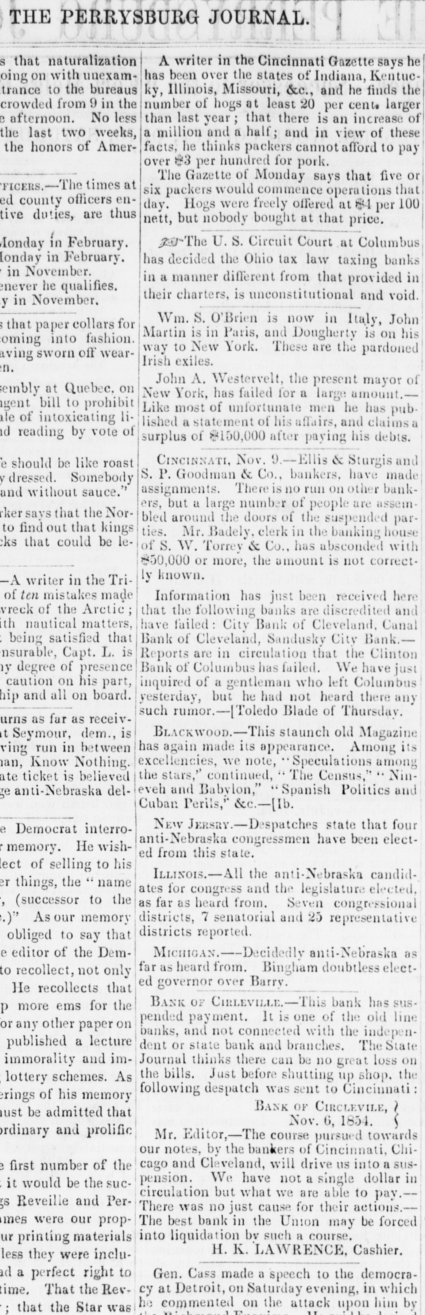 THE PERRYSBURG JOURNAL. that naturalization A writer in the Cincinnati Gazette says he on with unexamhas been over the states of Indiana, Kentucto the bureaus ky, Illinois, Missouri, &c., and he finds the crowded from 9 in the number of hogs at least 20 per cent. larger No less afternoon. than last year; that there is an increase of a million and a half; and in view of these the last two weeks, the honors of Amerfacts, he thinks packers cannot afford to pay over $3 per hundred for pork. The Gazette of Monday says that five or times at six packers would commence operations that county officers enday. Hogs were freely offered at $4 per 100 duties, are thus nett, but nobody bought at that price. The U.S. Circuit Court at Columbus Ionday in February. londay in February. has decided the Ohio tax law taxing banks November. in in a manner different from that provided in he qualifies. their charters, is unconstitutional and void. in November. Wm. S. O'Brien is now in Italy, John that paper collars for Martin is in Paris, and Dougherty is on his oming into fashion. way to New York. These are the pardoned sworn off wearIrish exiles. John A. Westervelt, the present mayor of embly at Quebec. on New York, has failed for a large amount.bill to prohibit Like most of unfortunate men he has pubof intoxicating lilished a statement of his affairs, and claims a reading by vote of surplus of $150,000 after paying his debts. CINCINNATI, Nov. 9.-Ellis & Sturgis and should be like roast S. P. Goodman & Co., bankers, have made dressed. Somebody assignments. There is no run on other bankand without sauce." ers, but a large number of people are assemsays that the Norbled around the doors of the suspended parto find out that kings ties. Mr. Badely, clerk in the banking house that could be leof S. W. Torrey & Co., has absconded with $50,000 or more, the amount is not correctly known. writer in the Triof ten mistakes made Information has just been received here vreck of the Arctic; that the following banks are discredited and nautical matters, have failed: City Bank of Cleveland, Canal being satisfied that Bank of Cleveland, Sandusky City Bank.nsurable, Capt. L. is Reports are in circulation that the Clinton degree of presence Bank of Columbus has failed. We have just caution on his part, inquired of a gentleman who left Columbus and all on board. yesterday, but he had not heard there any such rumor.-[Toledo Blade of Thursday. as far as receivBLACKWOOD.-This staunch old Magazine Seymour, dem., is run in between has again made its appearance. Among its excellencies, we note, Speculations among Know Nothing. ticket is believed the stars," continued, The Census," Ninanti-Nebraska deleveh and Babylon," Spanish Politics and Cuban Perils," &c.-[Ib. NEW JERSRY.-Despatches state that four Democrat interroanti-Nebraska congressmen have been electmemory. He wished from this state. of selling to his ILLINOIS.-All the anti-Nebraska candidthings, the " name ates for congress and the legislature elected, (successor to the as far as heard from. Seven congressional districts, 7 senatorial and 25 representative As our memory districts reported. obliged to say that editor of the DemMICHIGAN.--Decidedly anti-Nebraska as far as heard from. Bingham doubtless electrecollect, not only ed governor over Barry. He recollects that BANK OF CIRLEVILLE.-This bank has susmore ems for the pended payment. It is one of the old line any other paper on banks, and not connected with the indepenpublished a lecture dent or state bank and branches. The State immorality and imJournal thinks there can be no great loss on the bills. Just before shutting up shop, the lottery schemes. As following despatch was sent to Cincinnati of his memory BANK OF CIRCLEVILE, be admitted that Nov. 6, 1854. rdinary and prolific Mr. Editor,-The course pursued towards our notes, by the bankers of Cincinnati, Chifirst number of the cago and Cleveland, will drive us into a suspension. We have not a single dollar in it would be the succirculation but what we are able to pay.Reveille and PerThere was no just cause for their actions.were our propThe best bank in the Union may be forced into liquidation by such a course. printing materials H. K. LAWRENCE. Cashier. they were inclua perfect right to Gen. Cass made a speech to the democraThat the Revcy at Detroit, on Saturday evening, in which he commented on the attack upon him by that the Star was