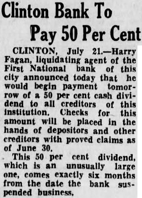 Newspaper accounts report an unexpected run on the First National Bank of Clinton on Jan 22, 1931; directors closed the bank 'temporarily ... for the protection of its depositors.' By July 1931 a liquidating agent (Harry Fagan) was paying a 50% dividend to creditors, indicating the bank remained closed and entered liquidation. Cause of the initial run is not specified in the articles (no concrete rumor or scandal described). OCR errors in Article 1 (garbled words) were corrected when extracting quotes.