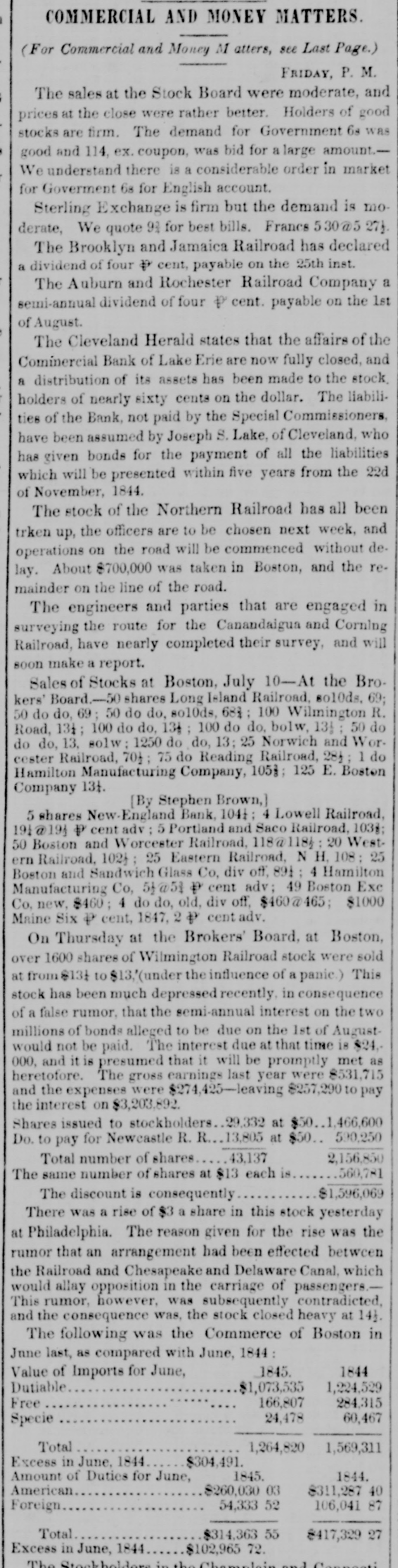 COMMERCIAL AND MONEY MATTERS. (For Commercial and Money M atters, see Last Page.) FRIDAY, P. M. The sales at the Stock Board were moderate, and prices at the close were rather better. Holders of good stocks are firm. The demand for Government 6s was good and 114, ex. coupon, was bid for a large amount.We understand there is a considerable order in market for Goverment 68 for English account. Sterling Exchange is firm but the demand is moderate, We quote 9% for best bills. Francs 530@5 27). The Brooklyn and Jamaica Railroad has declared a dividend of four ₽ cent, payable on the 25th inst. The Auburn and Rochester Railroad Company a semi-annual dividend of four P cent. payable on the 1st of August. The Cleveland Herald states that the affairs of the Cominercial Bank of Lake Erie are now fully closed, and a distribution of its assets has been made to the stock. holders of nearly sixty cents on the dollar. The liabilities of the Bank, not paid by the Special Commissioners, have been assumed by Joseph S. Lake, of Cleveland, who has given bonds for the payment of all the liabilities which will be presented within five years from the 22d of November, 1844. The stock of the Northern Railroad has all been trken up, the officers are to be chosen next week, and operations on the road will be commenced without delay. About $700,000 was taken in Boston, and the remainder on the line of the road. The engineers and parties that are engaged in surveying the route for the Canandaigua and Corning Railroad, have nearly completed their survey, and will soon make a report. Sales of Stocks at Boston, July 10-At the Brokers' Board.-50 shares Long Island Railroad, solOds. 69; 50 do do, 69: 50 do do, 8010ds, 681 : 100 Wilmington R. Road, 131; 100 do do, 13 100 do do, bolw, 13 50 do do do, 13. solw: 1250 do do, 13: 25 Norwich and Worcester Railroad, 701; 75 do Reading Railroad, 281; 1 do Hamilton Manufacturing Company, 105g: 125 E. Boston Company 13t. [By Stephen Brown,] 5 shares New-England Bank, 1041: 4 Lowell Railroad, 191@19} ₽ cent adv 5 Portland and Saco Railroad. 1031; 50 Boston and Worcester Railroad, 118@118} : 20 West. ern Railroad, 102) 25 Eastern Railroad, N H. 108: 25 Boston and Sandwich Glass Co, div off, 891 4 Hamilton Manufacturing Co, 51@51 P cent adv: 49 Boston Exc Co. new. $460; 4 do do, old, div off. $460@465; $1000 Maine Six ₽ cent, 1847, P centadv. On Thursday at the Brokers' Board, at Boston, over 1600 shares of Wilmington Railroad stock were sold at from 8131 to $13,"(under the influence of a panic.) This stock has been much depressed recently, in consequence of a false rumor. that the semi-annual interest on the two millions of bonds alleged to be due on the 1st of Augustwould not be paid. The interest due at that time is $24. 000, and it is presumed that it will be promptly met as heretofore. The gross earnings last year were $531,715 and the expenses were $274,425-leaving $257,290 to pay the interest on $3,203,892. Shares issued to stockholders 29,332 at $50 1,466,600 590,250 Do. to pay for Newcastle R. R 13,805 at $50 43.137 2,156,850 Total number of shares 560,781 The same number of shares at $13 each is $1,596,069 The discount is consequently There was a rise of $3 a share in this stock yesterday at Philadelphia. The reason given for the rise was the rumor that an arrangement had been effected between the Railroad and Chesapeake and Delaware Canal, which would allay opposition in the carriage of passengers.This rumor, however, was subsequently contradicted, and the consequence was, the stock closed heavy at 14}. The following was the Commerce of Boston in June last, as compared with June, 1844: 1844 1845. Value of Imports for June, Dutiable 1,224,529 $1,073,535 166,807 Free 284,315 24,478 60,467 Specie Total 1,264,820 1,569,311 Excess in June, 1844 $304,491. 1845. Amount of Duties for June, 1844. American 8260,030 03 $311,287 40 54,333 52 106,041 8 Foreign Total $314,363 55 $417,329 9 27 $102,965 7 Excess in June, 1844 The