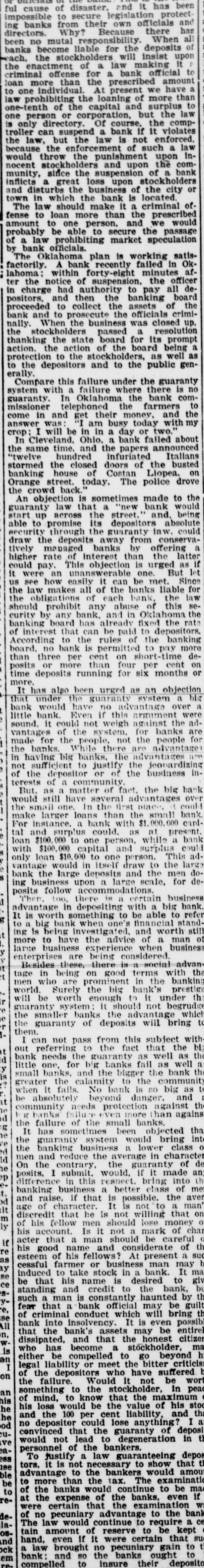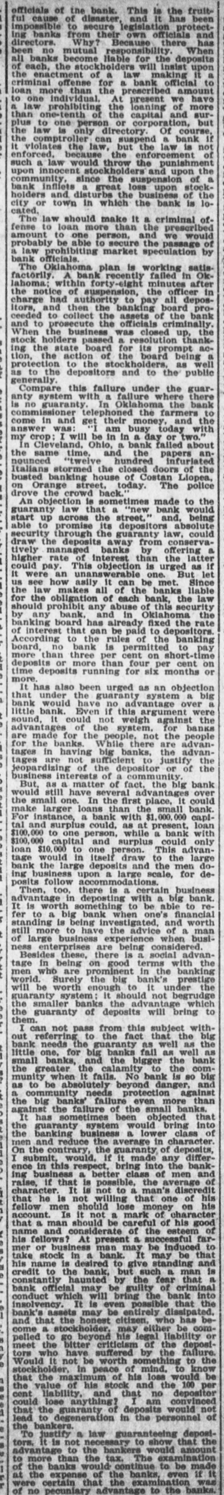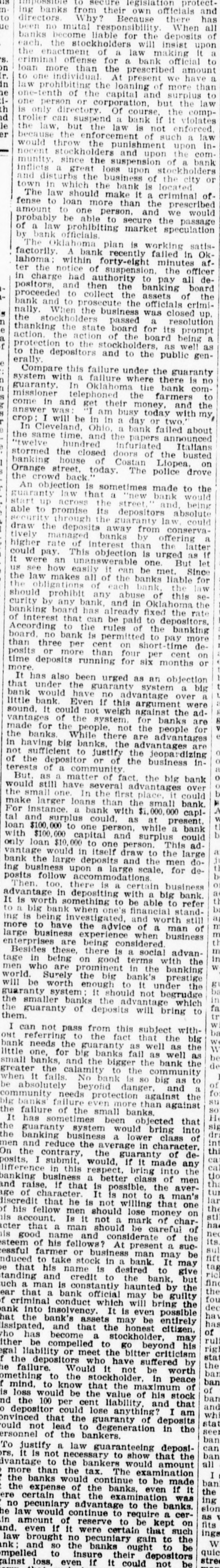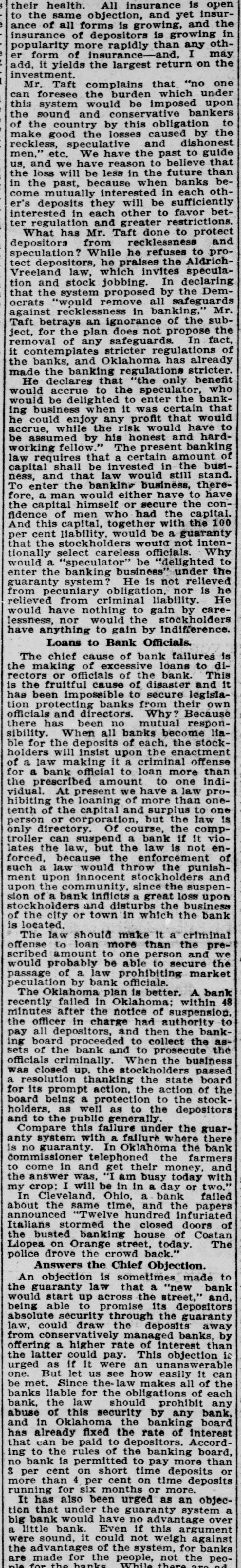 the past, because when banks become mutually responsible for each other's deposits they will be sufficiently interested in each other to favor better regulation and greater restrictions. What has Mr Taft done to protect depositors from and speculation? While he refuses to protect depositors he praises the AldrichVreeland law. which Invites specula. tion and stock jobbing In declaring that the system proposed by the Democrats would remove all safeguards against recklessness in banking, Mr Taft betrays an ignorance of the su3. ject for the plan does not propose the removal of any safeguards. In fact, contemplates stricter regulation of the banks and Oklahoma has already made the banking regulation strictHe declares that the only benefit would accrue to the speculator, who would be deligh ted to enter the bank ing business when it was certain that he could enjoy any profit that would accrue. while the risk would have to be assumed by his honest and hardfellow The working bank present ing law requires that certain amount of capital shall be invested in the busi ness, and that law would still stand, To enter the banking business therefore, a man would either have to have the capital himself or secure the con fidence of men who had the capital And this capital. together with the 100 per cent liability would be a guaranty that the stockholders would not intentionally select careless officials Why would 'speculator' be 'delighted to enter the banking business under the guaranty system? He is not relieved from pecuniary obligation nor he relieved from criminal liability He would have nothing to gain by carelessness nor would the stockhold ers have anything to gain by indif ference The chief cause of bank failures is the making of excessive loans to directors or officials of the bank This it is the fruitful cause of disaster and has been impossible to secure legisla tion protecting banks from their own officials and directors, Why? Be cause there has been no mutual responsibility When all banks become liable for the deposits of each. the stockholders will insist upon the en actment of a law making it criminal offense for a bank official to loan more than the prescribed amount to one Individual At present we have law prohibiting the loaning of more than one-tenth of the capital and surplus to one person or corporation. but the law is only directory. Of course the comptroller can suspend a bank if it violates the law but the law is not enforced because the enforcement of such a law would throw the punishment upon innocent stockholders and upon the community since the suspension of bank inflicts great loss upon stockholders and disturbs the business of the city or town in which the bank is located. The law should make it a criminal offense to loan more than the prescribed amount to one person and we would probably be able to secure the passage of a law prohibiting market speculation by bank officials. A The Oklahoma plan is better. bank recently failed in Oklahoma within forty eight minutes after the In notice of suspension the officer charge had authority to pay all depositors, and then the banking board proceeded to collect the assts of the bank and to prosecute the officials criminally When the business was a closed up, the stockholders passed resolution thanking the State Board for Its prompt action. the action of the Board being a protection to the stockholders as well as to the deposftors and to the public generally Compare this failure under the guar. antv system with a failure where there is no guaranty In Oklahoma the Bank Commissioner telephoned the farmers to come in and get their money, and the answer was. am busy today with my crop I will be in in a day or two In Cleveland. o a bank failed about the same time and the papers announced Twelve hundred infuriated Italians stormed the closed doors of the busted banking house of Costan Liopea on Orange Street today The police drove the crowd back An objection is sometimes made to the guaranty law that a 'new bank would start up across the street. and being able to promise its depositors absolute security through the guaranty law. could draw the deposits away from conservatively managed banks by or. fering a higher rate of interest than the latger could pay This objection is urged as if were an unanswerable one. But let usesee how easily it can be met. Since the law makes all or the banks liable for the obligations of each bank and in Oklahoma the banking board has already fixed the late of interest that can be paid to depositors According to the rules of the Banking Board no bank is permitted to pay more than three per cent on short time deposits or more than four per cent on time deposits running for six months or more It has also been urged as an objectton that under the guaranty system a big bank would have no advantage over a little bank Even if this argument were sound. it could not weigh against the advantages of the system, for banks are made for the people, not the people for the banks. While there are advantages in having big banka, the advantages are not sufficient to justify the jeopardizing of the depositor or of the business interests of a community But as a matter of fact. the hig bank would still have several advantages over the small one In the first place, It could make larger loans than ino small bank For instance a bank with $1,000,000 capital and surplus could, as present loan $100.000 to one person, while a bank with $100 000 capital and surplus could only loan $10,000 to one person. This advantage would in it. self draw to the large bank the large deposits and the men doing business upon a large scale for deposits follow accommodations. Then, too, there is a certain business advantage in depositing with a big bank. It is worth someth to be able to refer to.a big bank when one's finan. clal standing is being vestigated, and worth still more to have the advice of a man of large business experience when business enterprises 