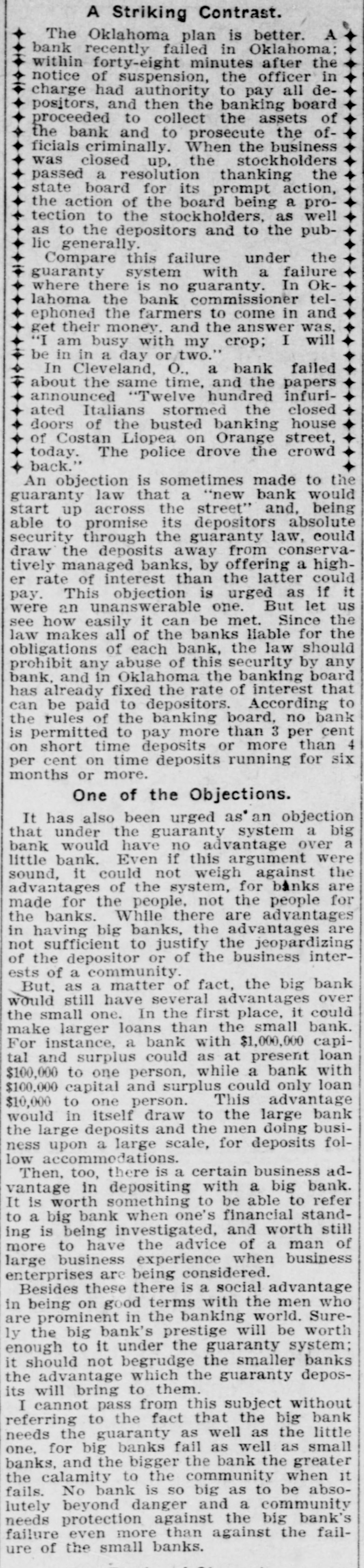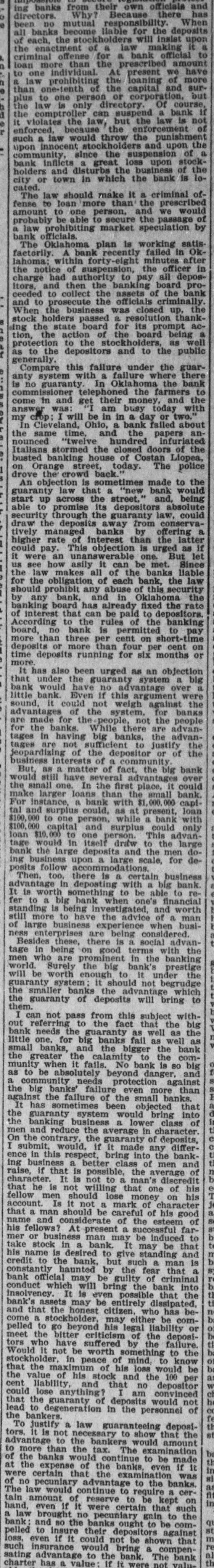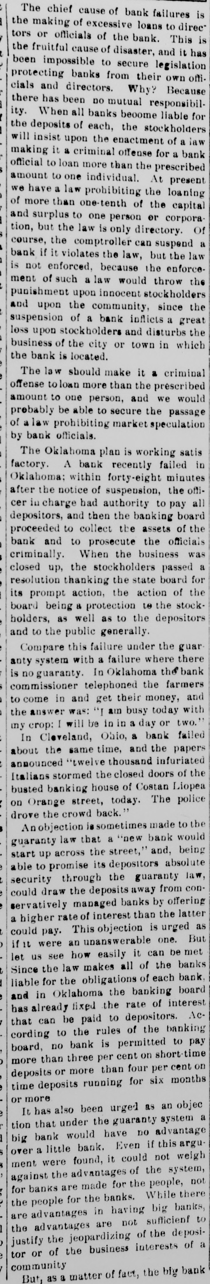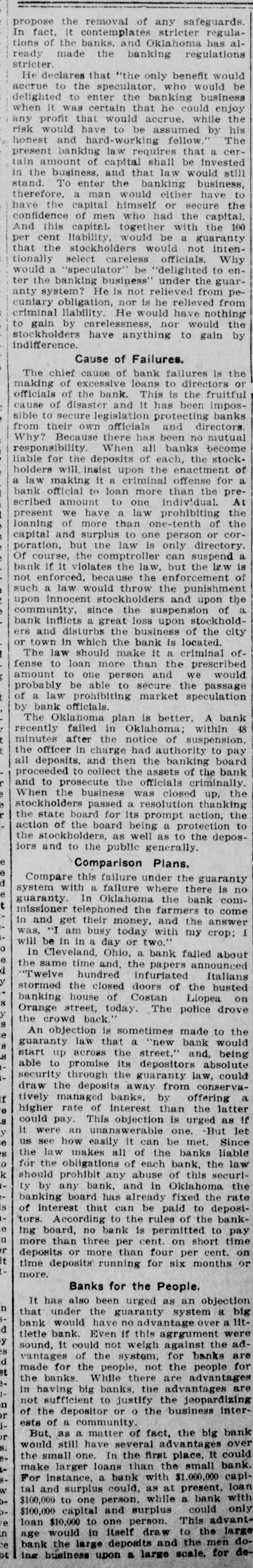 the past, because when banks become mutually responsible for each other's deposits they will be sufficiently interested in each other to favor better regulation and greater restrictions. What has Mr Taft done to protect depositors from and speculation? While he refuses to protect depositors he praises the AldrichVreeland law. which Invites specula. tion and stock jobbing In declaring that the system proposed by the Democrats would remove all safeguards against recklessness in banking, Mr Taft betrays an ignorance of the su3. ject for the plan does not propose the removal of any safeguards. In fact, contemplates stricter regulation of the banks and Oklahoma has already made the banking regulation strictHe declares that the only benefit would accrue to the speculator, who would be deligh ted to enter the bank ing business when it was certain that he could enjoy any profit that would accrue. while the risk would have to be assumed by his honest and hardfellow The working bank present ing law requires that certain amount of capital shall be invested in the busi ness, and that law would still stand, To enter the banking business therefore, a man would either have to have the capital himself or secure the con fidence of men who had the capital And this capital. together with the 100 per cent liability would be a guaranty that the stockholders would not intentionally select careless officials Why would 'speculator' be 'delighted to enter the banking business under the guaranty system? He is not relieved from pecuniary obligation nor he relieved from criminal liability He would have nothing to gain by carelessness nor would the stockhold ers have anything to gain by indif ference The chief cause of bank failures is the making of excessive loans to directors or officials of the bank This it is the fruitful cause of disaster and has been impossible to secure legisla tion protecting banks from their own officials and directors, Why? Be cause there has been no mutual responsibility When all banks become liable for the deposits of each. the stockholders will insist upon the en actment of a law making it criminal offense for a bank official to loan more than the prescribed amount to one Individual At present we have law prohibiting the loaning of more than one-tenth of the capital and surplus to one person or corporation. but the law is only directory. Of course the comptroller can suspend a bank if it violates the law but the law is not enforced because the enforcement of such a law would throw the punishment upon innocent stockholders and upon the community since the suspension of bank inflicts great loss upon stockholders and disturbs the business of the city or town in which the bank is located. The law should make it a criminal offense to loan more than the prescribed amount to one person and we would probably be able to secure the passage of a law prohibiting market speculation by bank officials. A The Oklahoma plan is better. bank recently failed in Oklahoma within forty eight minutes after the In notice of suspension the officer charge had authority to pay all depositors, and then the banking board proceeded to collect the assts of the bank and to prosecute the officials criminally When the business was a closed up, the stockholders passed resolution thanking the State Board for Its prompt action. the action of the Board being a protection to the stockholders as well as to the deposftors and to the public generally Compare this failure under the guar. antv system with a failure where there is no guaranty In Oklahoma the Bank Commissioner telephoned the farmers to come in and get their money, and the answer was. am busy today with my crop I will be in in a day or two In Cleveland. o a bank failed about the same time and the papers announced Twelve hundred infuriated Italians stormed the closed doors of the busted banking house of Costan Liopea on Orange Street today The police drove the crowd back An objection is sometimes made to the guaranty law that a 'new bank would start up across the street. and being able to promise its depositors absolute security through the guaranty law. could draw the deposits away from conservatively managed banks by or. fering a higher rate of interest than the latger could pay This objection is urged as if were an unanswerable one. But let usesee how easily it can be met. Since the law makes all or the banks liable for the obligations of each bank and in Oklahoma the banking board has already fixed the late of interest that can be paid to depositors According to the rules of the Banking Board no bank is permitted to pay more than three per cent on short time deposits or more than four per cent on time deposits running for six months or more It has also been urged as an objectton that under the guaranty system a big bank would have no advantage over a little bank Even if this argument were sound. it could not weigh against the advantages of the system, for banks are made for the people, not the people for the banks. While there are advantages in having big banka, the advantages are not sufficient to justify the jeopardizing of the depositor or of the business interests of a community But as a matter of fact. the hig bank would still have several advantages over the small one In the first place, It could make larger loans than ino small bank For instance a bank with $1,000,000 capital and surplus could, as present loan $100.000 to one person, while a bank with $100 000 capital and surplus could only loan $10,000 to one person. This advantage would in it. self draw to the large bank the large deposits and the men doing business upon a large scale for deposits follow accommodations. Then, too, there is a certain business advantage in depositing with a big bank. It is worth someth to be able to refer to.a big bank when one's finan. clal standing is being vestigated, and worth still more to have the advice of a man of large business experience when business enterprises 