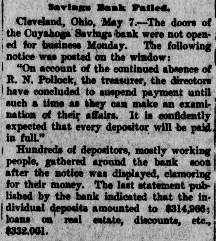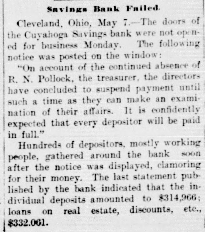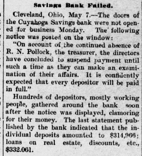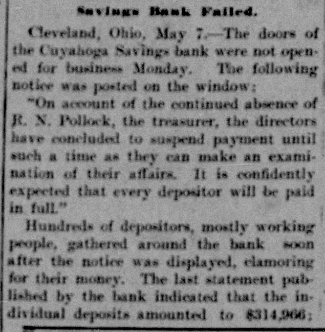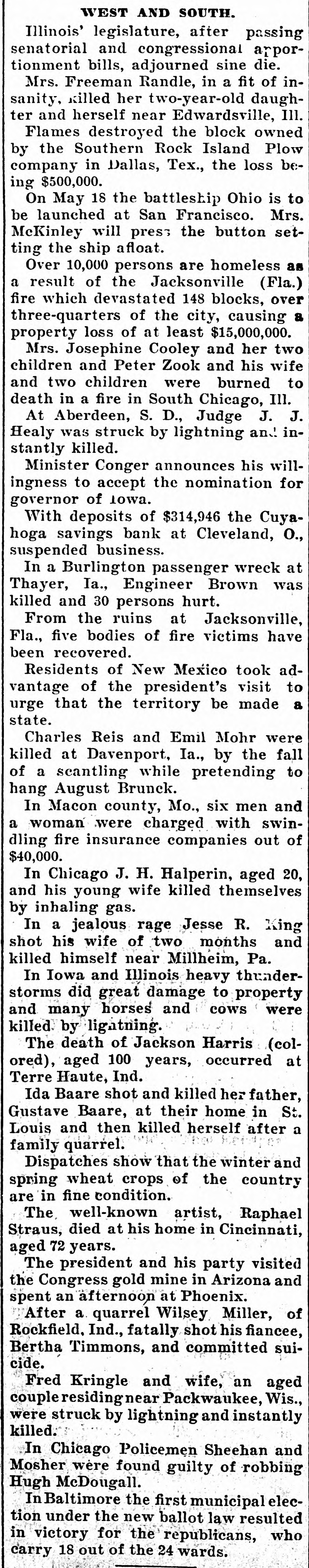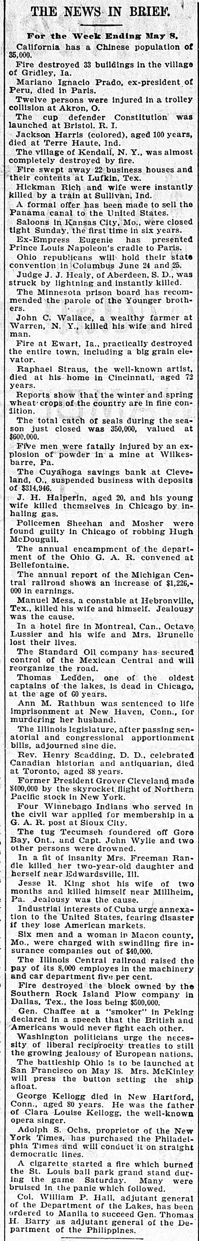THE NEWS IN BRIEF. For the Week Ending May S. California has a Chinese population of 35,000. Fire destroyed 33 buildings in the village of Gridley, Ia. Mariano Ignacio Prado, ex-president of Peru, died in Paris. Twelve persons were injured in a trolley collision at Akron, O. The cup defender Constitution was launched at Bristol. R. I. Jackson Harris (colored), aged 100 years, died at Terre Haute, Ind. The village of Kendall, N. Y., was almost completely destroyed by fire. Fire swept away 22 business houses and their contents at Lufkin, Tex. Hickman Rich and wife were instantly killed by a train at Sullivan, Ind. A formal offer has been made to sell the Panama canal to the United States. Saloons in Kansas City, Mo., were closed tight Sunday, the first time in six years. Ex-Empress Eugenie has presented Prince Louis Napoleon's cradle to Paris. Ohio republicans will hold their state convention in Columbus June 24 and 25. Judge J. J. Healy, of Aberdeen, S. D., was struck by lightning and instantly killed. The Minnesota prison board has recommended the parole of the Younger brothers. John C. Wallace, a wealthy farmer at Warren, N. Y., killed his wife and hired man. Fire at Ewart, Ia., practically destroyed the entire town, including a big grain ele* vator. Raphael Straus, the well-known artist, died at his home in Cincinnati, aged 72 years. Reports show that the winter and spring wheat crops of the country are in fine condition. The total catch of seals during the season just closed was 350,000, valued at $600,000. Five men were fatally injured by an explosion of powder in a mine at Wilkesbarre, Pa. The Cuyahoga savings bank at Cleveland, O., suspended business with deposits of $314,946. J. H. Halperin, aged 20, and his young wife killed themselves in Chicago by inhaling gas. Policemen Sheehan and Mosher were found guilty in Chicago of robbing Hugh McDougall. The annual encampment of the department of the Ohio G. A. R. convened at Bellefontaine. The annual report of the Michigan Central railroad shows an increase of $1,226,000 in earnings. Manuel Mess, a constable at Hebronville, Tex., killed his wife and himself. Jealousy was the cause. In a hotel fire in Montreal, Can., Octave Lussier and his wife and Mrs. Brunelle lost their lives. The Standard Oil company has secured control of the Mexican Central and will reorganize the road. Thomas Ledden, one of the oldest captains of the lakes, is dead in Chicago, at the age of GO years. Ann M. Rathbun was sentenced to life imprisonment at New Haven, Conn., for murdering her husband. The Illinois legislature, after passing senatorial and congressional apportionment bills, adjourned sine die. Rev. Henry Scadding. D. D., celebrated Canadian historian and antiquarian, died at Toronto, aged 88 years. Former President Grover Cleveland made $400,000 by the skyrocket flight of Northern Pacific stock in New York. Four Winnebago Indians who served in the civil war applied for membership in a G. A. R. post at Sioux City. The tug Tecumseh foundered off Gore Bay, Ont., and Capt. John Wylie and two other persons were drowned. In a fit of insanity Mrs. Freeman Randle killed her two-year-old daughter and herself near Edwardsville, III. Jesse R. King shot his wife of two months and killed himself near Millheim, Pa. Jealousy was the cause. Industrial interests of Cuba urge annexation to the United States, fearing disaster if they lose American markets. Six men and a woman in Macon county, Mo., were charged with swindling fire insurance companies out of $40,000. The Illinois Central railroad raised the pay of its 8,000 employes in the machinery