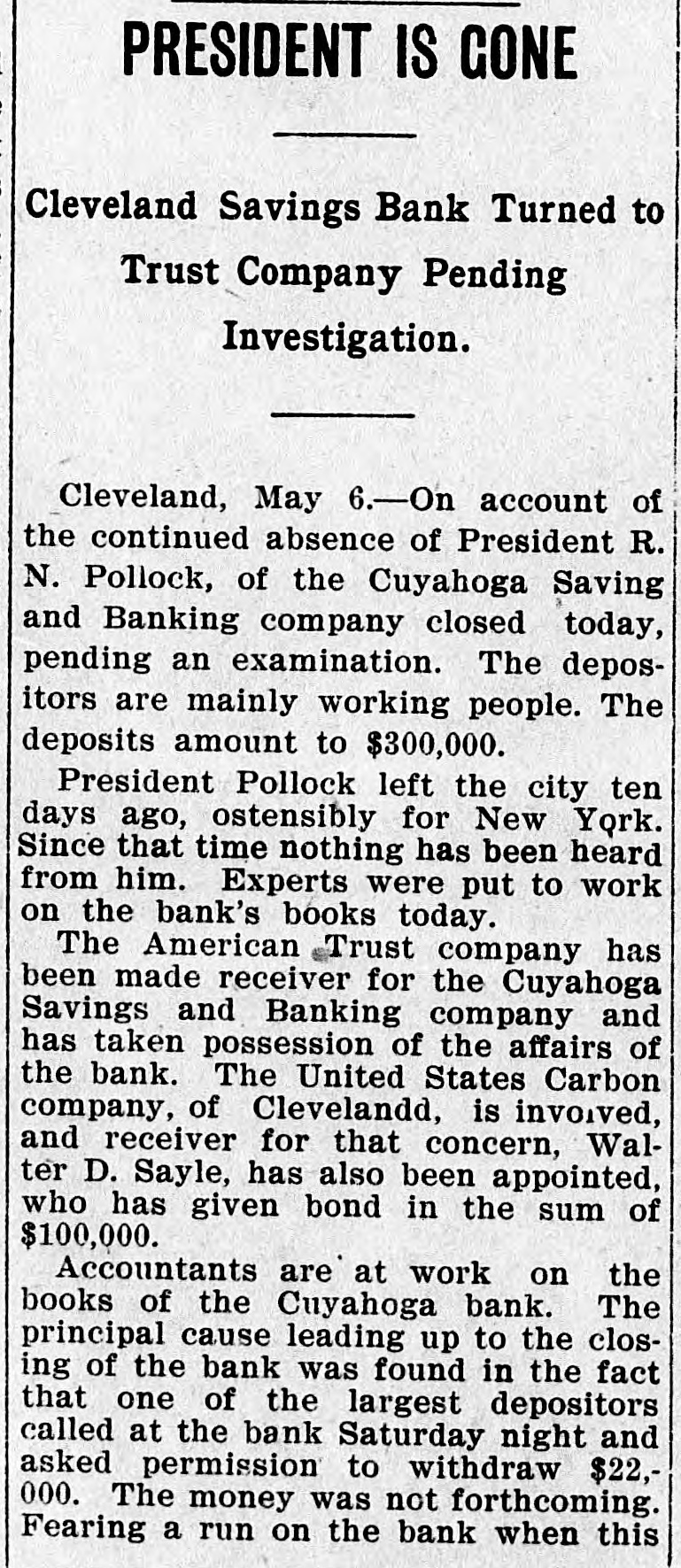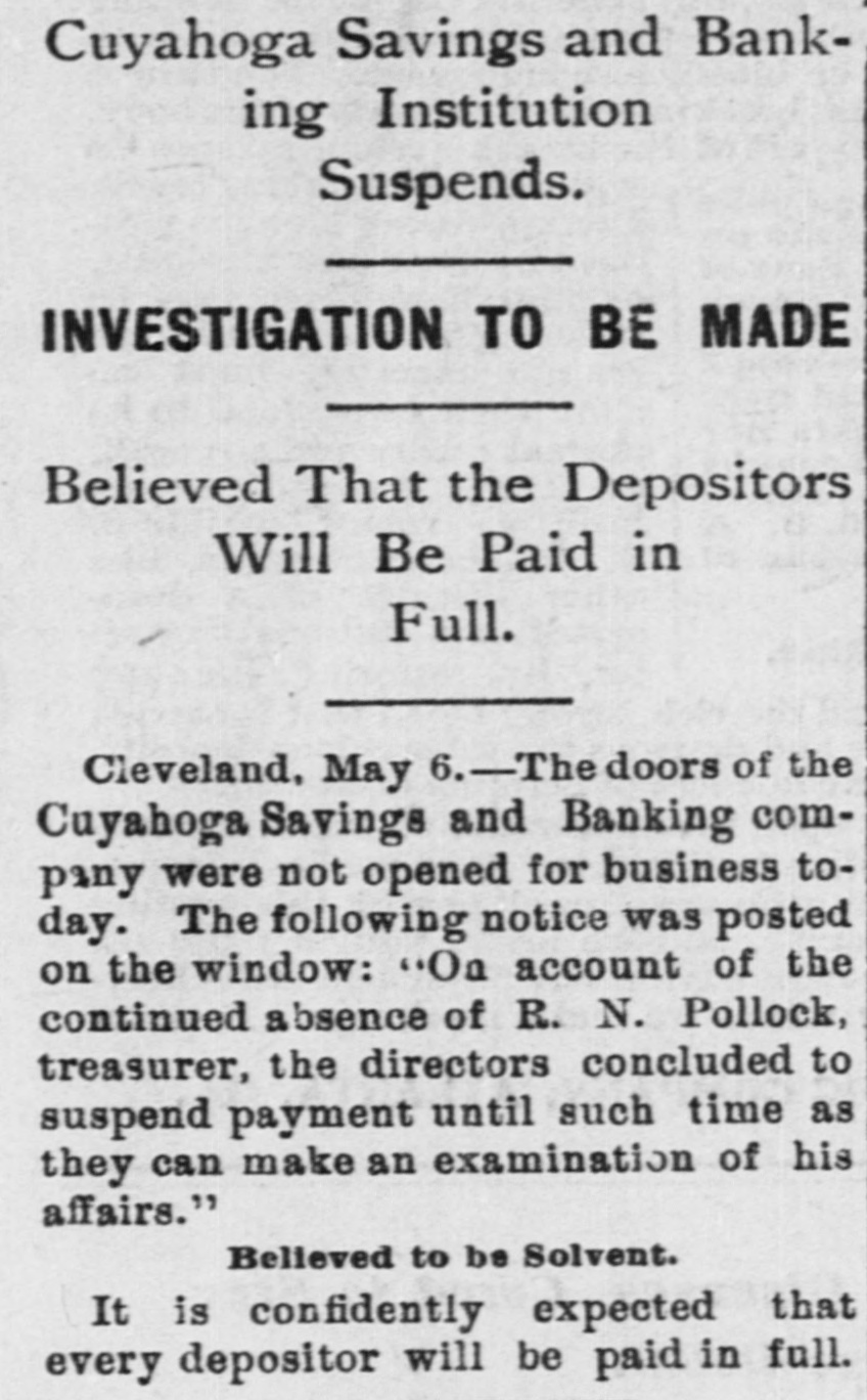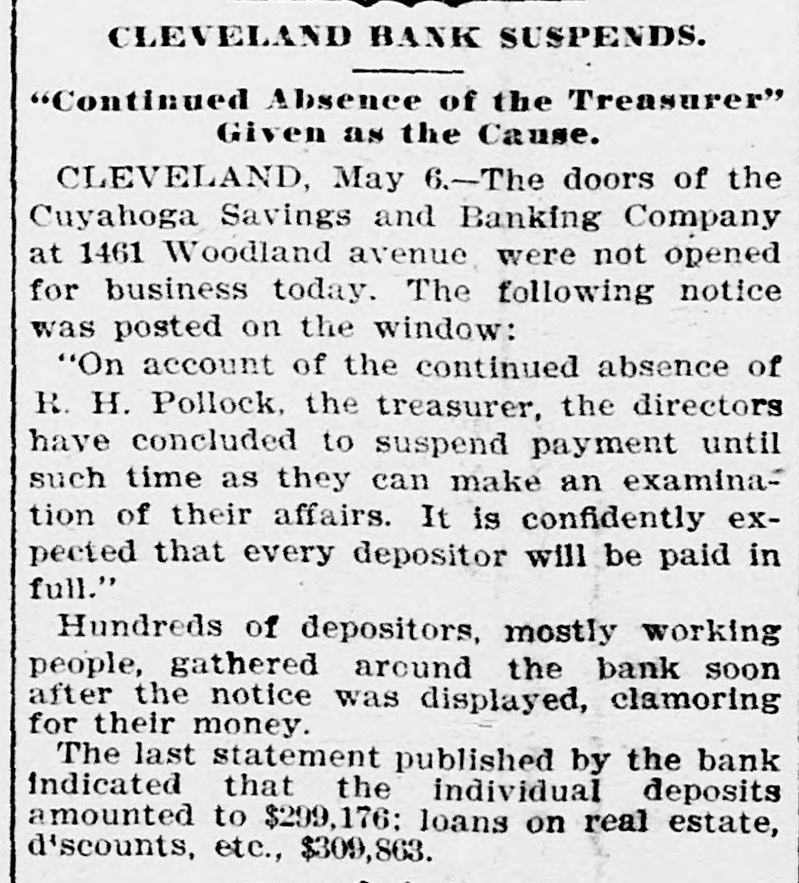 CLEVELAND BANK SUSPENDS. "Continued Absence of the Treasurer" Given as the Cause. CLEVELAND, May 6.-The doors of the Cuyahoga Savings and Banking Company at 1461 Woodland avenue were not opened for business today. The following notice was posted on the window: "On account of the continued absence of R. H. Pollock, the treasurer, the directors have concluded to suspend payment until such time as they can make an examination of their affairs. It is confidently expected that every depositor will be paid in full." Hundreds of depositors, mostly working people, gathered around the bank soon after the notice was displayed, clamoring for their money. The last statement published by the bank indicated that the individual deposits amounted to $299,176: loans on real estate, d'scounts, etc., $309,863.