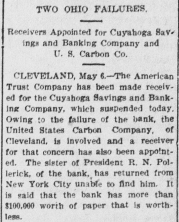 TWO OHIO FAILURES. Receivers Appointed for Cuyahoga Savings and Banking Company and U. S. Carbon Co. CLEVELAND, May 6.-The American Trust Company has been made received for the Cuyahoga Savings and Banking Company, which suspended today. Owing to the failure of the bank, the United States Carbon Company, of Cleveland, is involved and a receiver for that concern has also been appointed. The sister of President R. N. Pollerick, of the bank, has returned from New York City unable to find him. It is said that the bank has more than $100,000 worth of paper that is worthless.
