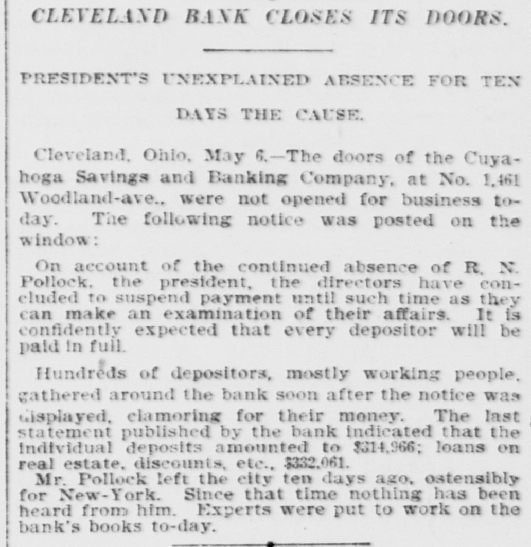 CLEVELAND BANK CLOSES ITS DOORS. PRESIDENT'S UNEXPLAINED AESENCE FOR TEN DAYS THE CAUSE. Cleveland, Ohio, May -The doors of the Cuyahoga Savings and Banking Company, at No. 1,461 Woodland-ave.. were not opened for business today. The following notice was posted on the window: On account of the continued absence of R. N. Pollock. the president, the directors have concluded to suspend payment until such time as they can make an examination of their affairs. It is confidently expected that every depositor will be paid in full Hundreds of depositors, mostly working people. gathered around the bank soon after the notice was displayed, elamoring for their money. The last statement published by the bank indicated that the individual deposits amounted to $314,966; loans on real estate, discounts, etc., $332,061. Mr. Pollock left the city ten days ago, ostensibly for New-York. Since that time nothing has been heard from him. Experts were put to work on the bank's books to-day.