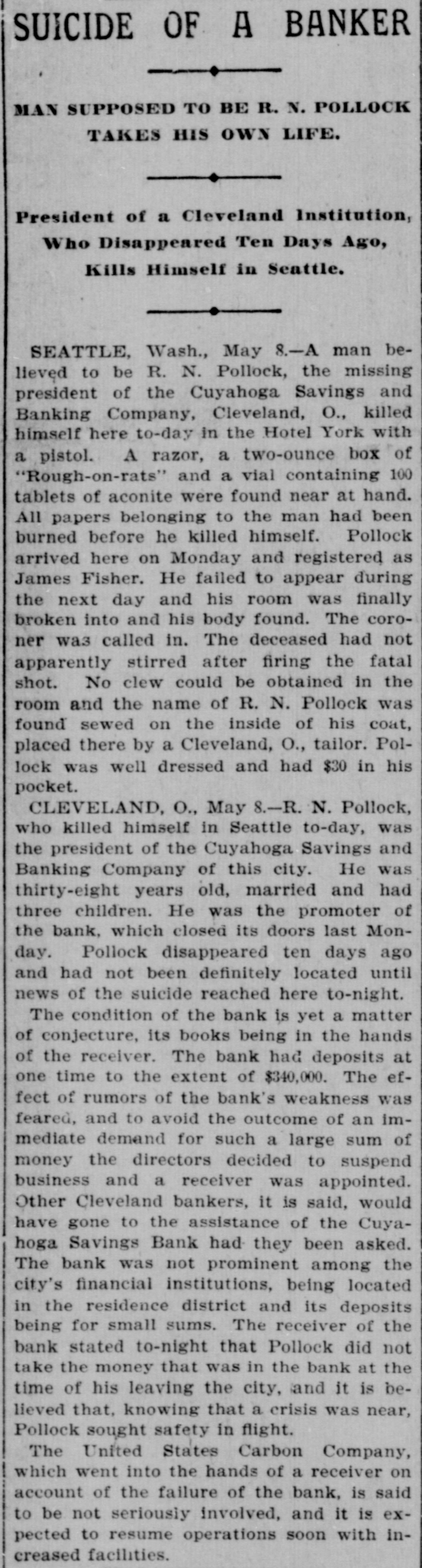 SUICIDE OF A BANKER MAN SUPPOSED TO BE R. N. POLLOCK TAKES HIS OWN LIFE. President of a Cleveland Institution, Who Disappeared Ten Days Ago, Kills Himself in Seattle. SEATTLE, Wash., May 8.-A man believed to be R. N. Pollock, the missing president of the Cuyahoga Savings and Banking Company, Cleveland, O., killed himself here to-day in the Hotel York with a pistol. A razor, a two-ounce box of "Rough-on-rats" and a vial containing 100 tablets of aconite were found near at hand. All papers belonging to the man had been burned before he killed himself. Pollock arrived here on Monday and registered as James Fisher. He failed to appear during the next day and his room was finally broken into and his body found. The coroner was called in. The deceased had not apparently stirred after firing the fatal shot. No clew could be obtained in the room and the name of R. N. Pollock was found sewed on the inside of his coat, placed there by a Cleveland, O., tailor. Pollock was well dressed and had $30 in his pocket. CLEVELAND, O., May 8.-R. N. Pollock, who killed himself in Seattle to-day, was the president of the Cuyahoga Savings and Banking Company of this city. He was thirty-eight years old, married and had three children. He was the promoter of the bank, which closed its doors last Monday. Pollock disappeared ten days ago and had not been definitely located until news of the suicide reached here to-night. The condition of the bank is yet a matter of conjecture, its books being in the hands of the receiver. The bank had deposits at one time to the extent of $340,000. The effect of rumors of the bank's weakness was feared, and to avoid the outcome of an immediate demand for such a large sum of money the directors decided to suspend business and a receiver was appointed. Other Cleveland bankers, it is said, would have gone to the assistance of the Cuyahoga Savings Bank had they been asked. The bank was not prominent among the city's financial institutions, being located in the residence district and its deposits being for small sums. The receiver of the bank stated to-night that Pollock did not take the money that was in the bank at the time of his leaving the city, and it is believed that, knowing that a crisis was near, Pollock sought safety in flight. The United States Carbon Company, which went into the hands of a receiver on account of the failure of the bank, is said to be not seriously involved, and it is expected to resume operations soon with increased facilities.