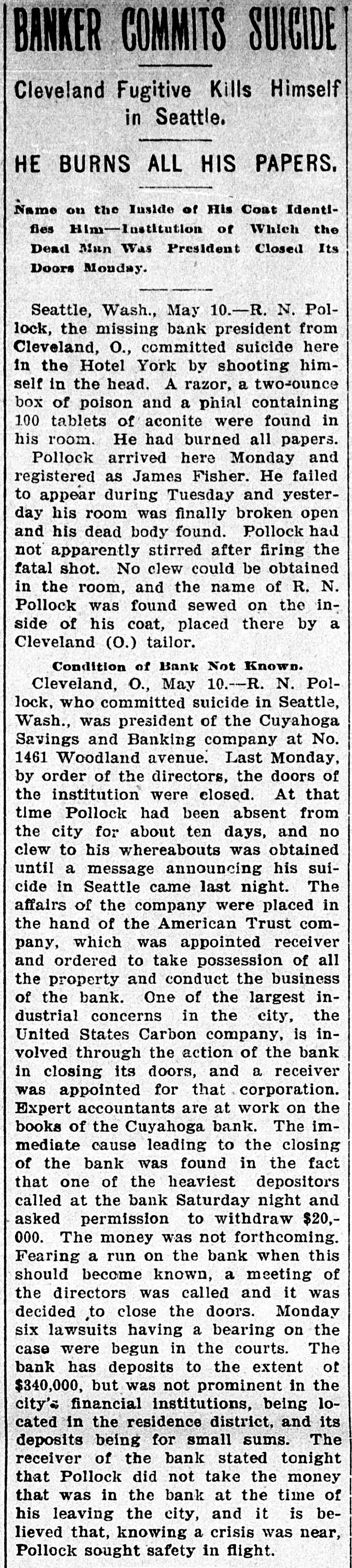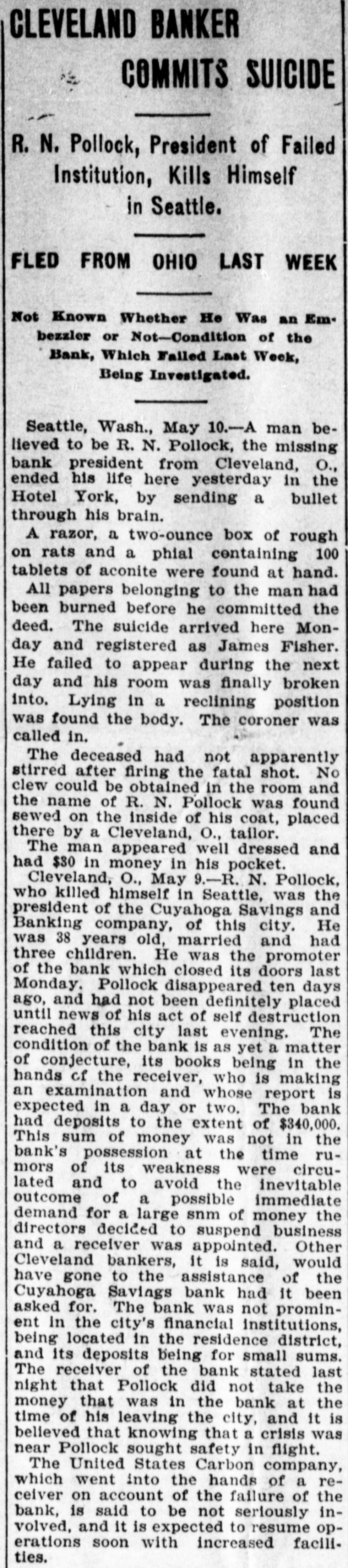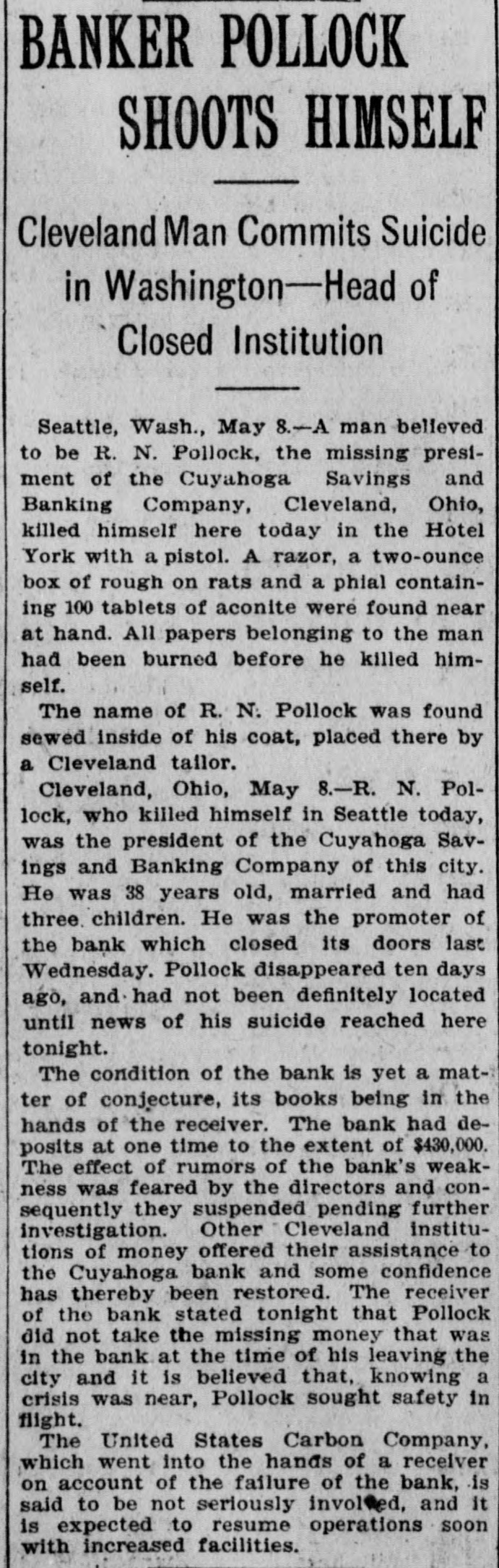 BANKER POLLOCK SHOOTS HIMSELF Cleveland Man Commits Suicide in Washington-Head of Closed Institution / Seattle, Wash., May 8.-A man believed to be R. N. Pollock, the missing prestment of the Cuyahoga Savings and Banking Company, Cleveland, Ohio, killed himself here today in the Hotel York with a pistol. A razor, a two-ounce box of rough on rats and a phial containing 100 tablets of aconite were found near at hand. All papers belonging to the man had been burned before he killed himself. The name of R. N. Pollock was found sewed inside of his coat, placed there by a Cleveland tailor. Cleveland, Ohio, May 8.-R. N. Pollock, who killed himself in Seattle today, was the president of the Cuyahoga Savings and Banking Company of this city. He was 38 years old, married and had three. children. He was the promoter of the bank which closed its doors last Wednesday. Pollock disappeared ten days ago, and had not been definitely located until news of his suicide reached here tonight. The condition of the bank is yet a matter of conjecture, its books being in the hands of the receiver. The bank had deposits at one time to the extent of $430,000. The effect of rumors of the bank's weakness was feared by the directors and consequently they suspended pending further investigation. Other Cleveland institutions of money offered their assistance to the Cuyahoga bank and some confidence has thereby been restored. The receiver of the bank stated tonight that Pollock did not take the missing money that was in the bank at the time of his leaving the city and it is believed that, knowing a crisis was near, Pollock sought safety in flight. The United States Carbon Company, which went into the hands of a receiver on account of the failure of the bank, is said to be not seriously involved, and it is expected to resume operations soon with increased facilities.