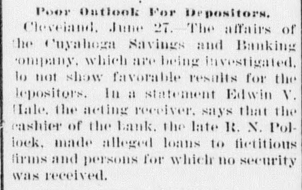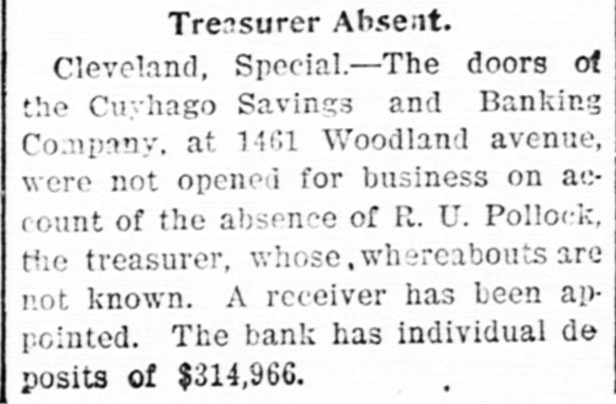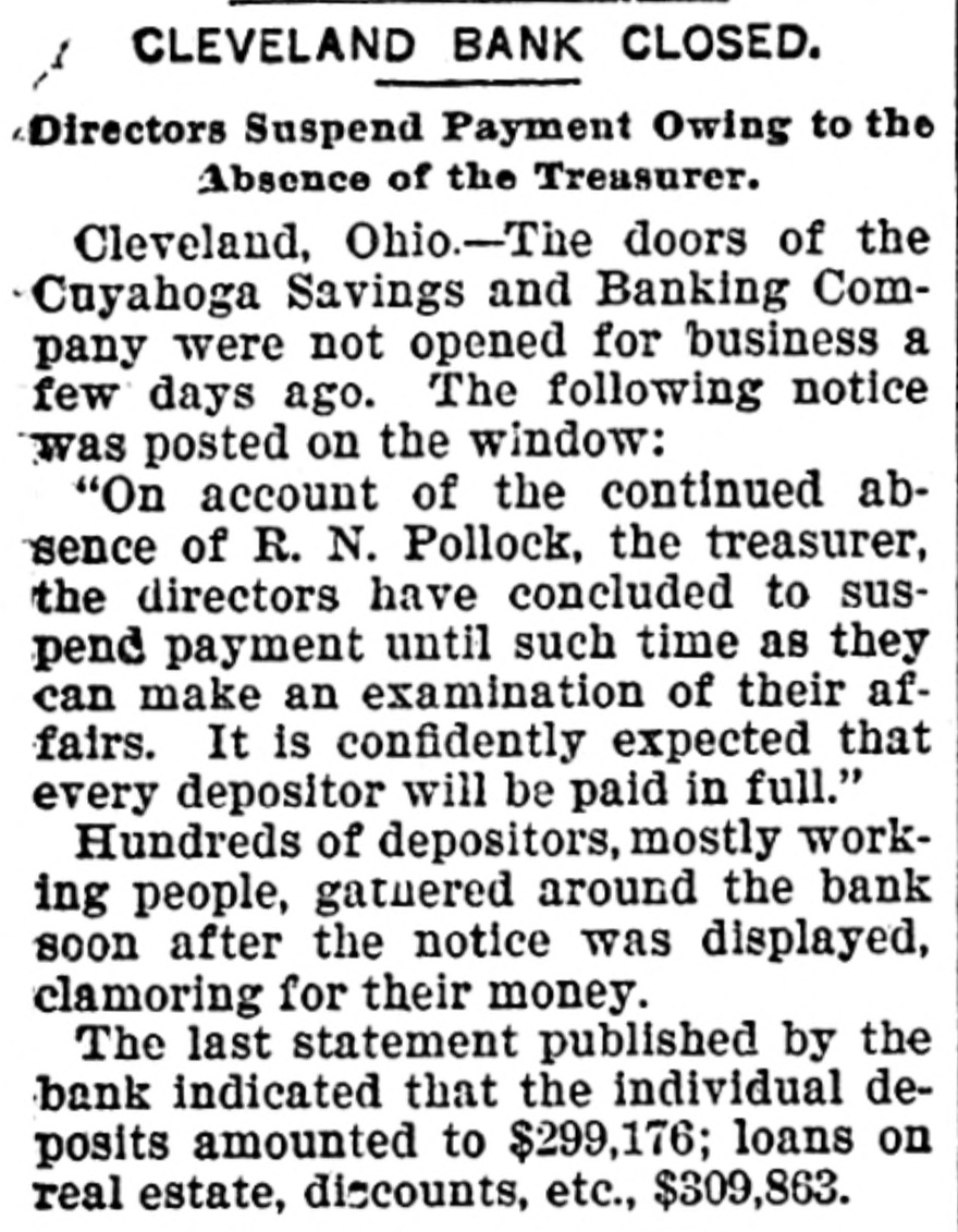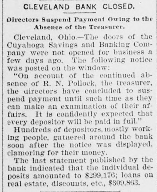 CLEVELAND BANK CLOSED. Directors Suspend Payment Owing to the Absence of the Treasurer. Cleveland, Ohio.-The doors of the Cuyahoga Savings and Banking Company were not opened for business a few days ago. The following notice was posted on the window: "On account of the continued absence of R. N. Pollock, the treasurer, the directors have concluded to suspend payment until such time as they can make an examination of their affairs. It is confidently expected that every depositor will be paid in full." Hundreds of depositors, mostly working people, gathered around the bank soon after the notice was displayed, clamoring for their money. The last statement published by the bank indicated that the individual deposits amounted to $299,176; loans on real estate, discounts, etc., $309,863.