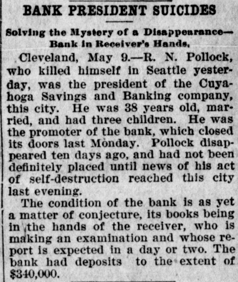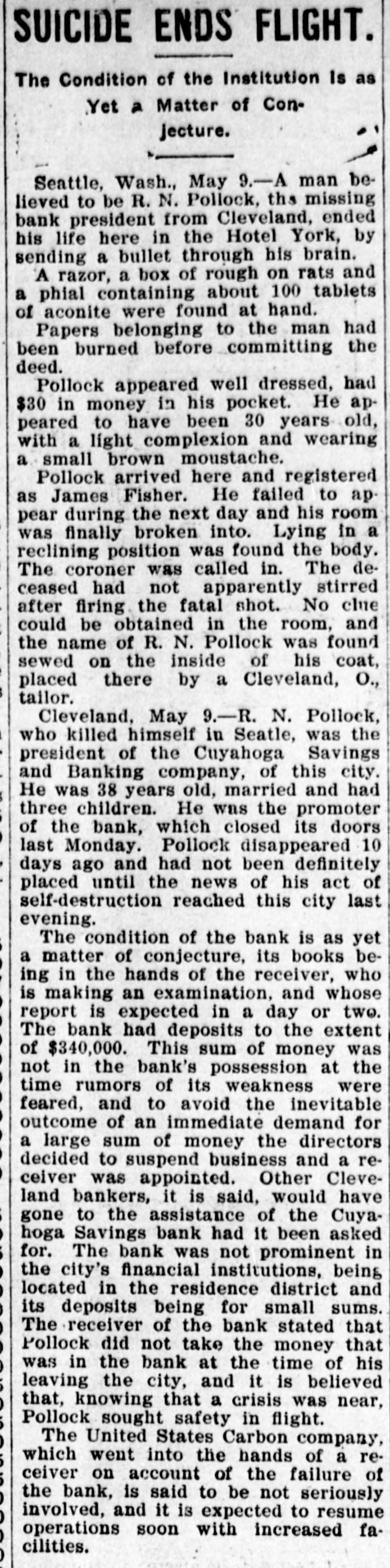 SUICIDE ENDS FLIGHT. The Condition of the Institution Is as Yet a Matter of Conjecture. Seattle, Wash., May 9.-A man believed to be R. N. Pollock, the missing bank president from Cleveland, ended his life here in the Hotel York, by sending a bullet through his brain. A razor, a box of rough on rats and a phial containing about 100 tablets of aconite were found at hand. Papers belonging to the man had been burned before committing the deed. Pollock appeared well dressed, had $30 in money in his pocket. He appeared to have been 30 years old, with a light complexion and wearing a small brown moustache. Pollock arrived here and registered as James Fisher. He failed to appear during the next day and his room was finally broken into. Lying in a reclining position was found the body. The coroner was called in. The deceased had not apparently stirred after firing the fatal shot. No clue could be obtained in the room, and the name of R. N. Pollock was found sewed on the inside of his coat, placed there by a Cleveland, O., tailor. Cleveland, May 9.-R. N. Pollock, who killed himself in Seatle, was the president of the Cuyahoga Savings and Banking company, of this city. He was 38 years old, married and had three children. He was the promoter of the bank, which closed its doors last Monday. Pollock disappeared 10 days ago and had not been definitely placed until the news of his act of self-destruction reached this city last evening. The condition of the bank is as yet a matter of conjecture, its books being in the hands of the receiver, who is making an examination, and whose report is expected in a day or two. The bank had deposits to the extent of $340,000. This sum of money was not in the bank's possession at the time rumors of its weakness were feared, and to avoid the inevitable outcome of an immediate demand for a large sum of money the directors decided to suspend business and a receiver was appointed. Other Cleveland bankers, it is said, would have gone to the assistance of the Cuyahoga Savings bank had it been asked for. The bank was not prominent in the city's financial institutions, being located in the residence district and its deposits being for small sums. The receiver of the bank stated that Pollock did not take the money that was in the bank at the time of his leaving the city, and it is believed that, knowing that a crisis was near, Pollock sought safety in flight. The United States Carbon company, which went into the hands of a receiver on account of the failure of the bank, is said to be not seriously involved, and it is expected to resume operations soon with increased facilities.