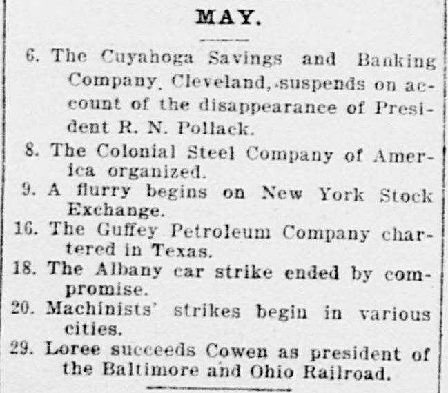 MAY. 6. The Cuyahoga Savings and Banking Company. Cleveland, suspends on account of the disappearance of President R. N. Pollack. 8. The Colonial Steel Company of America organized. 9. A flurry begins on New York Stock Exchange. 16. The Guffey Petroleum Company chartered in Texas. 18. The Albany car strike ended by compromise. 20. Machinists' strikes begin in various cities. 29. Loree succeeds Cowen as president of the Baltimore and Ohio Railroad.