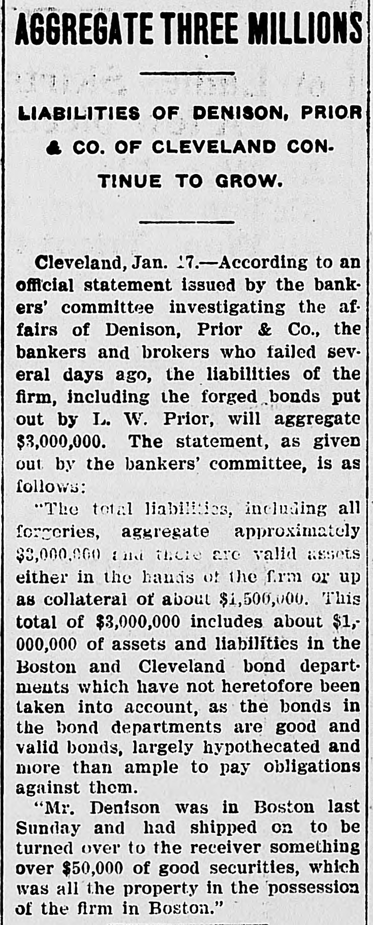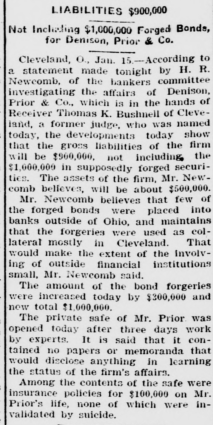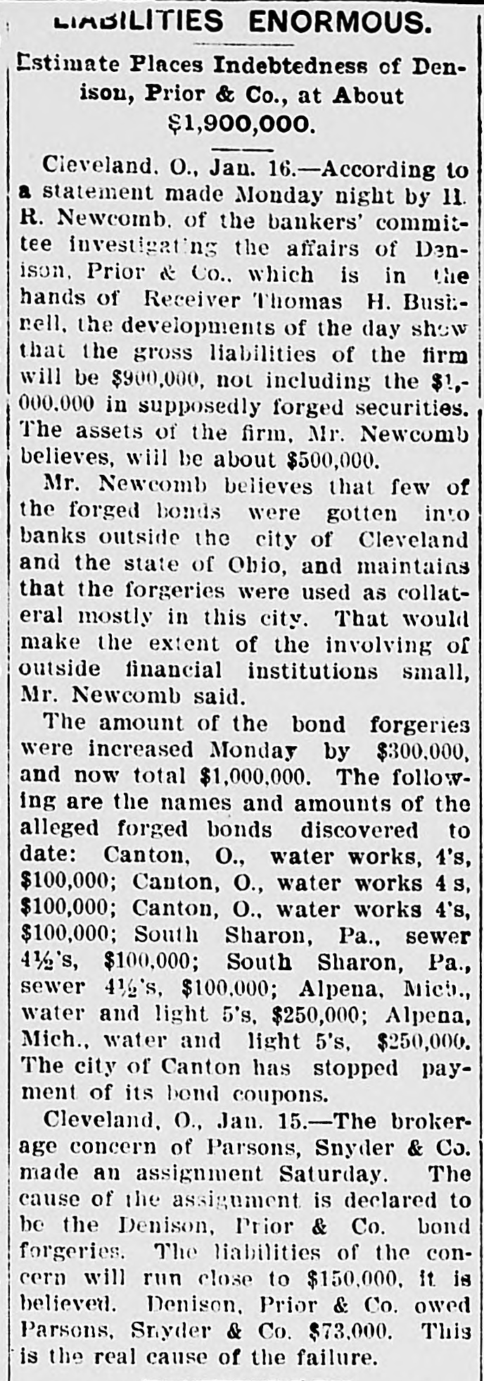 If the Prior Series Are Not Returned the City Water Works Extension Bonds May be Withdrawn. Failure of the Demand May Meet With a Suit for Their Recovery. Local Officials in Conference. Cleveland, O., Jan. 16.-The city all of Canton has demanded the recurn of the torged Canton bonds that L. not W. Prior put out. If the bonds are in within a short time, withdraw the water WORKS turned may and exten- accity isbonds from the market, series. bonds not be sion sue spurious a refunding returned, Should the the also BUS for their recovery. the Johnson, attorney committee, and also w.y bankers' H. may H. for for bonds, the of the spurious Canton Ashbrook, and Wm. Day, & of holders met Canton, Armstrong city city Miller auditor attorat the offices of Hayden, ney, Co., Monday arternoon and promised them that the bonds would all be turned in by Feb. 15, when the next pay1 ment of interest is due. the meantime Kountze & Co., of have been ordered to of interest New the In payment York, of water stop This h e works extension bonds of Canton. e order may be extended to other series susif there should later arise any picion that there had been additional e torgeries. ( The bankers' committee which has been handling the affairs of Denison, rePrior & Co., since the firm failed of g tired Tuesday morning in favor apThomas H. Bushnell, the receiver Monh e pointed in United States court day. Accompanying the committee's relinquishment of the bankrupt firm's authaffairs, the following-statement, out orized by the bankers, was given by Chairman H. R. Newcomb: investigating committee had this morning and a returns possible made to fullest "The meeting had having them. the feeling is, a receiver in the to and matters turned over been Their court, appointed United States that him, that it is due to the public they make the following statement: all "The total liabilities, including forgeries, aggregate approximately asthree million, and there are valid sets either in the hands of the firm, or a as collateral, of about one and mils half up million. This total of three t includes about one million of asliabilities in the bond sets lion Cleveland and departments, Boston taken which into and have not heretofore been deaccount, as the bonds in the bond partments are good and valid bonds than largely hypothecated, and more against n ample to pay obligations f them." , "Mr. Dennison was in Boston last £aturday and had shipped on, to be y over to the receiver, something d of good t, all the property in the over turned was $50,000 securities, possession which h o of the firm in Boston. In one particular the above state ment differs from an estimate of as- by and liabilities furnished Newcomb At the time he put n le Chairman noon. sets Monday the after- gross forgn r liabilities, including $1,000,000 of good ed bonds at $1,900,000, and the 5 assets at approximately $500,000, leavd ing a deficit of $1,400,000. If, as was dee possible, another $100,000 forgery be 1 veloped, the gross liabilities would aso $2,000,000, or about four times the sets, said Newcomb. y Tuesday's statement adds $1,000,000 and e the previous estimate of assets r to the same amount to the Habilities. 11 The explanation given by Newcomb r for this addition is that it covers good o bonds on which loans have been negoThe bonds will suffice to cover but are not on debts of the firm, except tiated. general the loans available careful the for 3. equities which, with ought to be over amounts of the loans. above small handling the left, These and will go into the general asn but they cannot amount equities sets to much. much e It was with the idea of saving as h possible in these and similar affairs equitd as ies by closing up the firm's y slowly, that the bankers' committee was asked to act. re With liabilities of $2,000,000, includthe notes given by Prior to holding of his forgeries, and apparent the available ers assets of $500,000 for general creditors, it is apparent that k, y, the latter will get about 25 cents on h I- the dollar, if no further additions are made to the debts by the discovery of e more forgeries, or other transactions unknown up to this time. An involuntary petition in bank- court was filed in the federal of Tuesday ruptcy against C. E. Dealson. to Denison, Prior & Company The plata at it tiffs are the Cleveland Building com93 g pany, company. and the Western Union the United States, Telephone Tel-