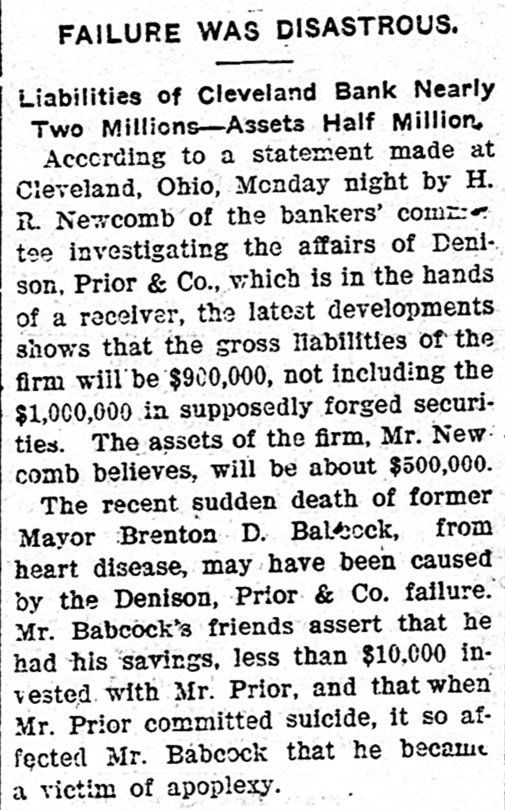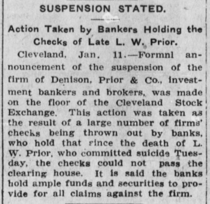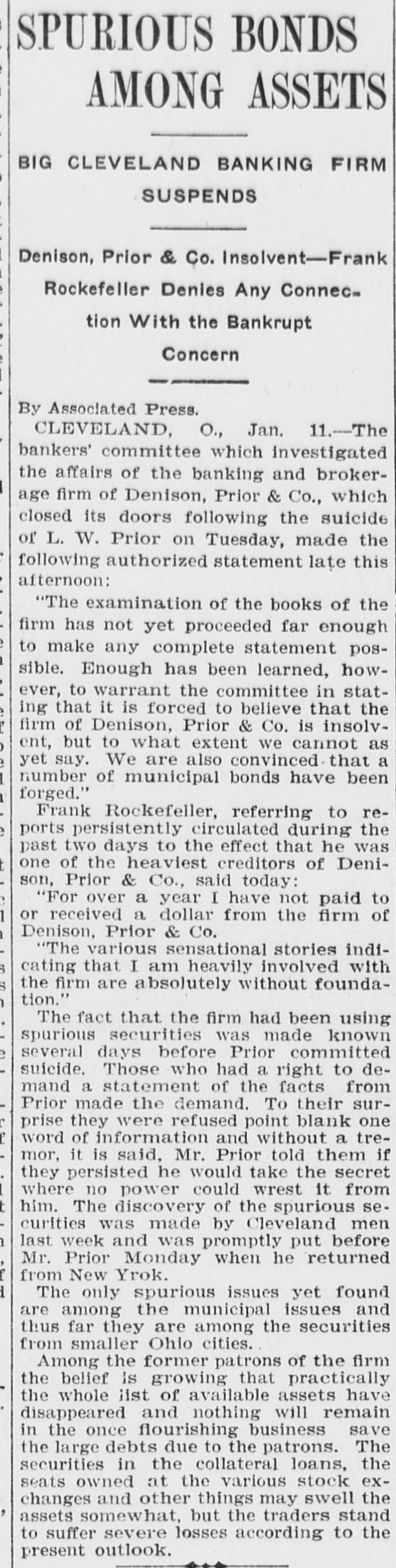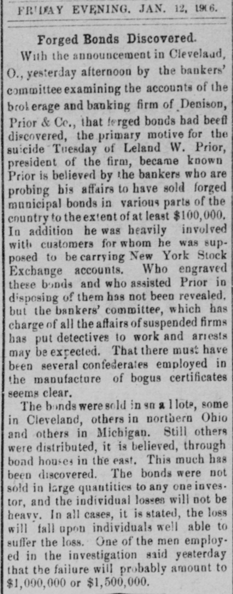 If the Prior Series Are Not Returned the City Water Works Extension Bonds May be Withdrawn. Failure of the Demand May Meet With a Suit for Their Recovery. Local Officials in Conference. Cleveland, O., Jan. 16.-The city all of Canton has demanded the recurn of the torged Canton bonds that L. not W. Prior put out. If the bonds are in within a short time, withdraw the water WORKS turned may and exten- accity isbonds from the market, series. bonds not be sion sue spurious a refunding returned, Should the the also BUS for their recovery. the Johnson, attorney committee, and also w.y bankers' H. may H. for for bonds, the of the spurious Canton Ashbrook, and Wm. Day, & of holders met Canton, Armstrong city city Miller auditor attorat the offices of Hayden, ney, Co., Monday arternoon and promised them that the bonds would all be turned in by Feb. 15, when the next pay1 ment of interest is due. the meantime Kountze & Co., of have been ordered to of interest New the In payment York, of water stop This h e works extension bonds of Canton. e order may be extended to other series susif there should later arise any picion that there had been additional e torgeries. ( The bankers' committee which has been handling the affairs of Denison, rePrior & Co., since the firm failed of g tired Tuesday morning in favor apThomas H. Bushnell, the receiver Monh e pointed in United States court day. Accompanying the committee's relinquishment of the bankrupt firm's authaffairs, the following-statement, out orized by the bankers, was given by Chairman H. R. Newcomb: investigating committee had this morning and a returns possible made to fullest "The meeting had having them. the feeling is, a receiver in the to and matters turned over been Their court, appointed United States that him, that it is due to the public they make the following statement: all "The total liabilities, including forgeries, aggregate approximately asthree million, and there are valid sets either in the hands of the firm, or a as collateral, of about one and mils half up million. This total of three t includes about one million of asliabilities in the bond sets lion Cleveland and departments, Boston taken which into and have not heretofore been deaccount, as the bonds in the bond partments are good and valid bonds than largely hypothecated, and more against n ample to pay obligations f them." , "Mr. Dennison was in Boston last £aturday and had shipped on, to be y over to the receiver, something d of good t, all the property in the over turned was $50,000 securities, possession which h o of the firm in Boston. In one particular the above state ment differs from an estimate of as- by and liabilities furnished Newcomb At the time he put n le Chairman noon. sets Monday the after- gross forgn r liabilities, including $1,000,000 of good ed bonds at $1,900,000, and the 5 assets at approximately $500,000, leavd ing a deficit of $1,400,000. If, as was dee possible, another $100,000 forgery be 1 veloped, the gross liabilities would aso $2,000,000, or about four times the sets, said Newcomb. y Tuesday's statement adds $1,000,000 and e the previous estimate of assets r to the same amount to the Habilities. 11 The explanation given by Newcomb r for this addition is that it covers good o bonds on which loans have been negoThe bonds will suffice to cover but are not on debts of the firm, except tiated. general the loans available careful the for 3. equities which, with ought to be over amounts of the loans. above small handling the left, These and will go into the general asn but they cannot amount equities sets to much. much e It was with the idea of saving as h possible in these and similar affairs equitd as ies by closing up the firm's y slowly, that the bankers' committee was asked to act. re With liabilities of $2,000,000, includthe notes given by Prior to holding of his forgeries, and apparent the available ers assets of $500,000 for general creditors, it is apparent that k, y, the latter will get about 25 cents on h I- the dollar, if no further additions are made to the debts by the discovery of e more forgeries, or other transactions unknown up to this time. An involuntary petition in bank- court was filed in the federal of Tuesday ruptcy against C. E. Dealson. to Denison, Prior & Company The plata at it tiffs are the Cleveland Building com93 g pany, company. and the Western Union the United States, Telephone Tel-