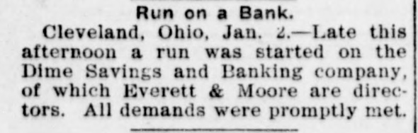 Run on a Bank. Cleveland, Ohio, Jan. 2.-Late this afternoon a run was started on the Dime Savings and Banking company, of which Everett & Moore are directors. All demands were promptly met.