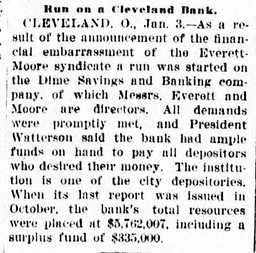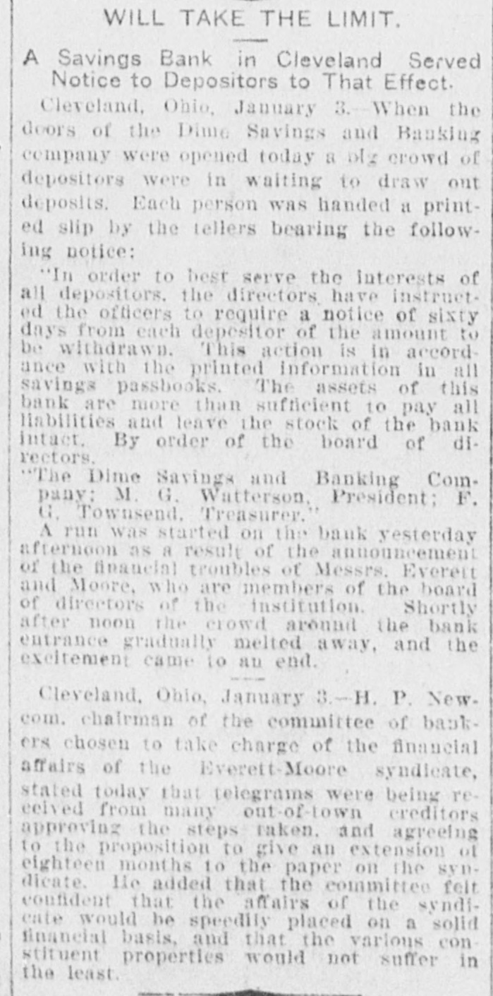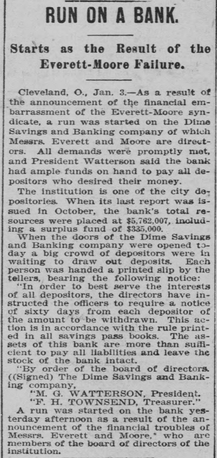 RUN ON A BANK. Starts as the Result of the Everett-Moore Failure. Cleveland, O., Jan. 3.-As a result of the announcement of the financial embarrassment of the Everett-Moore syndicate, a run was started on the Dime Savings and Banking company of which Messrs. Everett and Moore are directors. All demands were promptly met, and President Watterson said the bank had ample funds on hand to pay all depositors who desired their money. The institution is one of the city depositories. When its last report was issued in October, the bank's total resources were placed at $5,762,007, including a surplus fund of $335,000. When the doors of the Dime Savings and Banking company were opened today a big crowd of depositors were in waiting to draw out deposits. Each person was handed a printed slip by the tellers, bearing the following notice: "In order to best serve the interests of all depositors, the directors have instructed the officers to require a notice of sixty days from each depositor of the amount to be withdrawn. This action is in accordance with the rule printed in all savings pass books. The assets of this bank are more than suificient to pay all liabilities and leave the stock of the bank intact. "By order of the board of directors. ((Signed) The Dime Savings and Banking company, "M. G. WATTERSON, President. "F. H. TOWNSEND, Treasurer." A run was started on the bank yesterday afternoon as a result of the announcement of the financial troubles of Messrs. Everett and Moore, who are members of the board of directors of the institution.