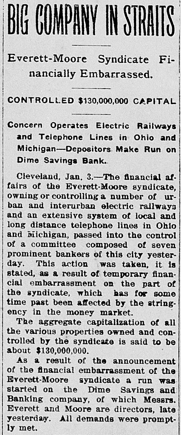 BIG COMPANY IN STRAITS Everett-Moore Syndicate Financially Embarrassed. CONTROLLED $130,000,000 CAPITAL Concern Operates Electric Railways and Telephone Lines in Ohio and Michigan-Depositors Make Run on Dime Savings Bank. Cleveland, Jan. 3.-The financial affairs of the Everett-Moore syndicate, owning or controlling a number of urban and interurban electric railways and an extensive system of local and long distance telephone lines in Ohio and Michigan, passed into the control of a committee composed of seven prominent bankers of this city yesterday. This action was taken, it is stated, as a result of temporary financial embarrassment on the part of the syndicate, which has for some time past been affected by the stringency in the money market. The aggregate capitalization of all the various properties owned and controlled by the syndicate is said to be about $130,000,000. As a result of the announcement of the financial embarrassment of the Everett-Moore syndicate a run was started on the Dime Savings and Banking company, of which Messrs. Everett and Moore are directors, late yesterday. All demands were promptly met.