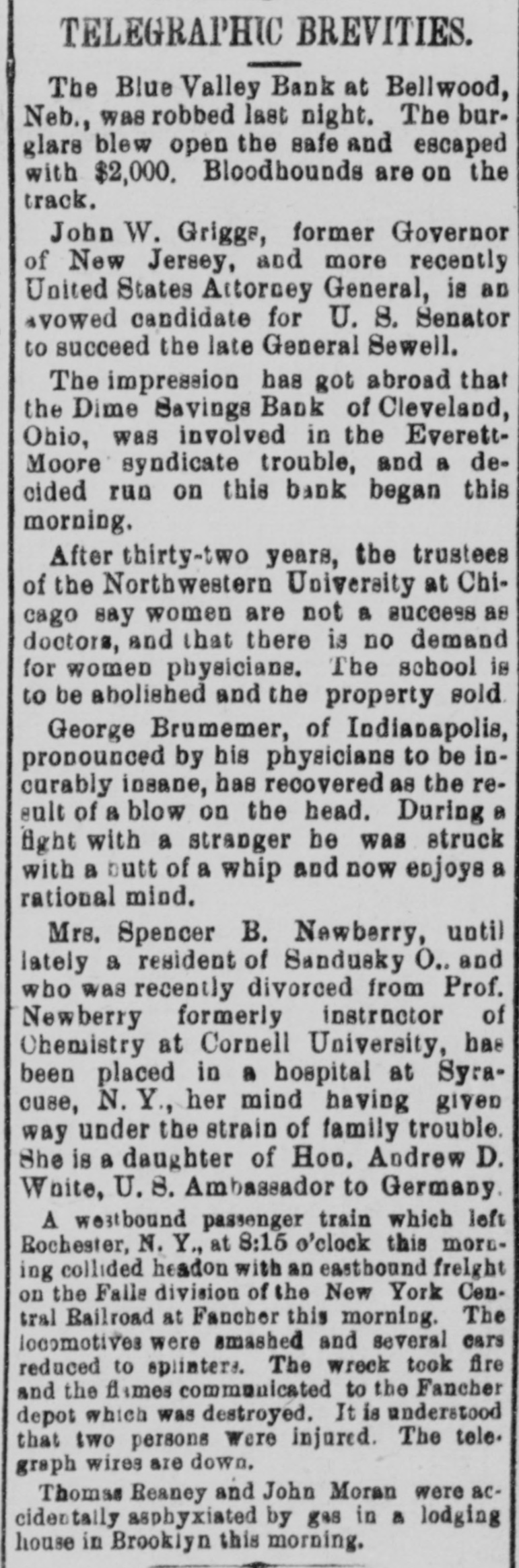 TELEGRAPHIC BREVITIES. The Blue Valley Bank at Bellwood, Neb., was robbed last night. The burglars blew open the safe and escaped with $2,000. Bloodhounds are on the track. John W. Griggs, former Governor of New Jersey, and more recently United States Attorney General, is an vowed candidate for U. S. Senator to succeed the late General Sewell. The impression has got abroad that the Dime Savings Bank of Cleveland, Ohio, was involved in the EverettMoore syndicate trouble, and a decided run on this bank began this morning. After thirty-two years, the trustees of the Northwestern University at Chicago say women are not a success as doctors, and that there is no demand for women physicians. The school is to be abolished and the property sold. George Brumemer, of Indianapolis, pronounced by his physicians to be incurably insane, has recovered as the result of a blow on the head. During a fight with a stranger be was struck with a butt of a whip and now enjoys a rational mind. Mrs. Spencer B. Newberry, until lately a resident of Sandusky O.. and who was recently divorced from Prof. Newberry formerly instructor of Ohemistry at Cornell University, has been placed in a hospital at Syracuse, N. Y., her mind having given way under the strain of family trouble. She is a daughter of Hoo. Andrew D. White, U.S. Ambassador to Germany. A westbound passenger train which left Rochester, N. Y., at 8:15 o'clock this morning collided headon with an eastbound frelght on the Falls division of the New York Central Railroad at Fancher this morning. The locomotives were smashed and several cars reduced to splinters. The wreck took fire and the filmes communicated to the Fancher depot which was destroyed. It is understood that two persons were injured. The tele. graph wires are down. Thomas Reaney and John Moran were accidentally asphyxiated by gas in a lodging house in Brooklyn this morning.