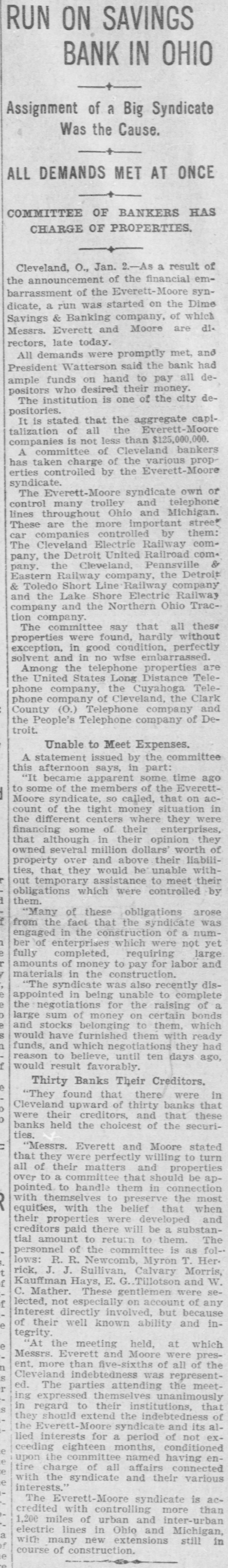 RUN ON SAVINGS BANK IN OHIO Assignment of a Big Syndicate Was the Cause. ALL DEMANDS MET AT ONCE COMMITTEE OF BANKERS HAS CHARGE OF PROPERTIES. Cleveland, O., Jan. 2.-As a result of the announcement of the financial embarrassment of the Everett-Moore syndicate, a run was started on the Dime Savings & Banking company, of which Messrs. Everett and Moore are di. rectors, late today. All demands were promptly met, and President Watterson said the bank had ample funds on hand to pay all depositors who desired their money. The institution is one of the city depositories. It is stated that the aggregate capitalization of all the Everett-Moore companies is not less than $125,000,000. A committee of Cleveland bankers has taken charge of the various properties controlled by the Everett-Moore syndicate. The Everett-Moore syndicate own or control many trolley and telephone lines throughout Ohio and Michigan. These are the more important stree* car companies controlled by them: The Cleveland Electric Railway company, the Detroit United Railroad com. pany, the Cleveland, Pennsville & Eastern Railway company, the Detroit & Toledo Short Line Railway company and the Lake Shore Electric Railway company and the Northern Ohio Traction company. The committee say that all these properties were found, hardly without exception, in good condition, perfectly solvent and in no wise embarrassed. Among the telephone properties are the United States Long Distance Telephone company, the Cuyahoga Telephone company of Cleveland, the Clark County (0.) Telephone company and the People's Telephone company of Detroit. Unable to Meet Expenses. A statement issued by the committee this afternoon says, in part: "It became apparent some time ago to some of the members of the EverettMoore syndicate, SO called, that on account of the tight money situation in the different centers where they were financing some of their enterprises, that although in their opinion they owned several million dollars' worth of property over and above their liabilities, that they would be unable without temporary assistance to meet their obligations which were controlled by them. "Many of these obligations arose from the fact that the syndicate was engaged in the construction of a number of enterprises which were not yet fully completed, requiring large amounts of money to pay for labor and materials in the construction. "The syndicate was also recently disappointed in being unable to complete the negotiations for the raising of a large sum of money on certain bonds and stocks belonging to them, which would have furnished them with ready funds, and which negotiations they had reason to believe, until ten days ago, would result favorably. Thirty Banks Their Creditors. "They found that there were in Cleveland upward of thirty banks that were their creditors, and that these banks held the choicest of the securities. "Messrs. Everett and Moore stated that they were perfectly willing to turn all of their matters and properties over to a committee that should be appointed to handle them in connection with themselves to preserve the most equities, with the belief that when their properties were developed and creditors paid there will be a substantial amount to return to them. The personnel of the committee is as fol-lows: R. R. Newcomb, Myron T. Her. rick, J. J. Sullivan, Calvary Morris, Kauffman Hays, E. G. Tillotson and W. C. Mather. These gentlemen were sef lected, not especially on account of any interest directly involved, but because of their well known ability and integrity. "At the meeting held. at which Messrs. Everett and Moore were present, more than five-sixths of all of the Cleveland indebtedness was represented. The parties attending the meeting expressed themselves unanimously in regard to their institutions, that they should extend the indebtedness of the Everett-Moore syndicate and its allied interests for a period of not ex-