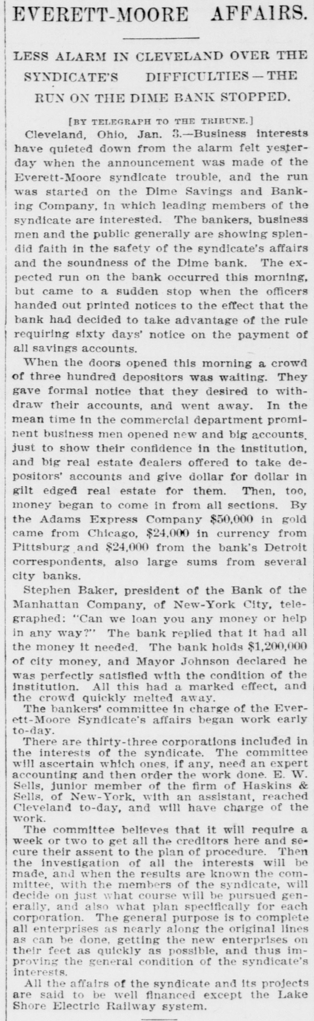 EVERETT-MOORE AFFAIRS. LESS ALARM IN CLEVELAND OVER THE SYNDICATE'S DIFFICULTIES-THE RUN ON THE DIME BANK STOPPED. [BY TELEGRAPH TO THE TRIBUNE.] Cleveland, Ohio, Jan. 3.-Business interests have quieted down from the alarm felt yesterday when the announcement was made of the Everett-Moore syndicate trouble, and the run was started on the Dime Savings and Banking Company, in which leading members of the syndicate are interested. The bankers, business men and the public generally are showing splendid faith in the safety of the syndicate's affairs and the soundness of the Dime bank. The expected run on the bank occurred this morning, but came to a sudden stop when the officers handed out printed notices to the effect that the bank had decided to take advantage of the rule requiring sixty days' notice on the payment of all savings accounts. When the doors opened this morning a crowd of three hundred depositors was waiting. They gave formal notice that they desired to withdraw their accounts, and went away. In the mean time in the commercial department prominent business men opened new and big accounts. just to show their confidence in the institution, and big real estate dealers offered to take depositors' accounts and give dollar for dollar in gilt edged real estate for them. Then, too, money began to come in from all sections. By the Adams Express Company $50,000 in gold came from Chicago, $24,000 in currency from Pittsburg and $24,000 from the bank's Detroit correspondents, also large sums from several city banks. Stephen Baker, president of the Bank of the Manhattan Company, of New-York City, telegraphed: "Can we loan you any money or help in any way?" The bank replied that it had all the money it needed. The bank holds $1,200,000 of city money, and Mayor Johnson declared he was perfectly satisfied with the condition of the institution. All this had a marked effect, and the crowd quickly melted away. The bankers' committee in charge of the Everett-Moore Syndicate's affairs began work early to-day. There are thirty-three corporations included in the interests of the syndicate. The committee will ascertain which ones, if any, need an expert accounting and then order the work done. E. W. Sells, junior member of the firm of Haskins & Sells, of New-York, with an assistant, reached Cleveland to-day, and will have charge of the work. The committee believes that it will require a week or two to get all the creditors here and secure their assent to the plan of procedure. Then the investigation of all the interests will be made, and when the results are known the committee, with the members of the syndicate, will decide on just what course will be pursued generally, and also what plan specifically for each corporation. The general purpose is to complete all enterprises as nearly along the original lines as can be done, getting the new enterprises on their feet as quickly as possible, and thus improving the general condition of the syndicate's interests. All the affairs of the syndicate and its projects are said to be well financed except the Lake Shore Electric Railway system.
