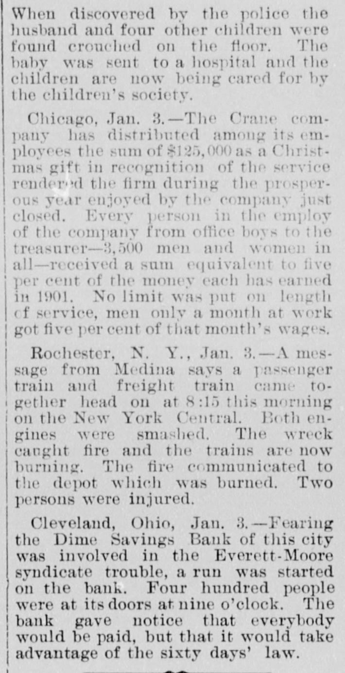 When discovered by the police the husband and four other children were found crouched on the floor. The baby was sent to a hospital and the children are now being cared for by the children's society. Chicago, Jan. 3.-The Crane company has distributed among its employees the sum of $125,000 as a Christmas gift in recognition of the service rendered the firm during the prosperous year enjoyed by the company just closed. Every person in the employ of the company from office boys to the treasurer-3,500 men and women in all-received a sum equivalent to five per cent of the money each has earned in 1901. No limit was put on length of service, men only a month at work got five per cent of that month's wages. Rochester, N. Y., Jan. 3.-A message from Medina says a passenger train and freight train came together head on at 8:15 this morning on the New York Central. Both engines were smashed. The wreck caught fire and the trains are now burning. The fire communicated to the depot which was burned. Two persons were injured. Cleveland, Ohio, Jan. 3.-Fearing the Dime Savings Bank of this city was involved in the Everett-Moore syndicate trouble, a run was started on the bank. Four hundred people were at its doors at nine o'clock. The bank gave notice that everybody would be paid, but that it would take advantage of the sixty days' law.