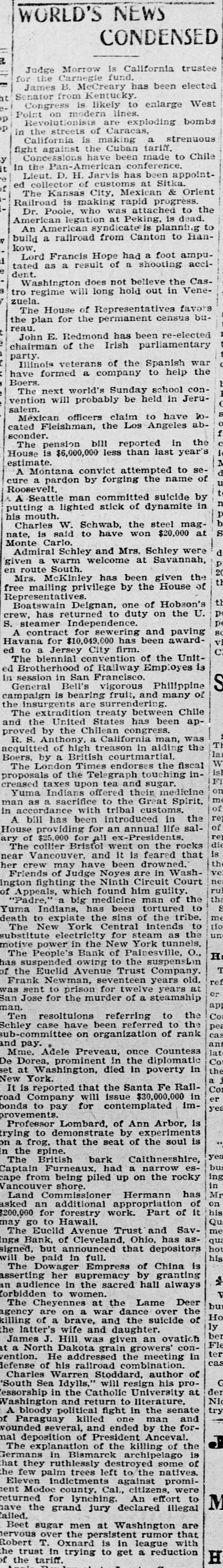NEWS CONDENSED Ige Morrow is California trustee he nes B. Carnegie McCreary fund. has been elected or gress from is likely Kentucky. to enlarge West on volutionists modern are lines. exploding bombs streets of Caracas, e ifornia is making a strenuous the Cuban tariff. against cessions have been made to Chile e Pan-American conference. ut. D. H. Jarvis has been Sitka. appointof customs at llector Kansas City, Mexican & Orient oad is making rapid progrèss. Poole, who was attached to dead. the legation at Peking, is Ican American syndicate is planning Han- to a railroad from Canton to a Francis Hope had a foot ampu- accias a result of a shooting shington does not believe in the Vene- Casgime will long hold out lan for the House of Representatives.favors 1 E. Redmond has been re-elected nan of the Irish parliamentary veterans of the Spanish the war ois formed a company to help next world's Sunday school Jeru- conn will probably be held in S officers claim to have ab- VoI ican Fleishman, the Los Angeles 0 I er. pension bill reported in year's the is $6,000,000 less than last V p te. ontana convict attempted to se- of n . pardon by forging the name 1 u velt. eattle man committed suicide in by d g a lighted stick of dynamite q uth. W. Schwab, the steel mag- at S is les said to have won $20,000 Carlo. p iral Schley and Mrs. Schley Savannah, were di a warm welcome at te South. 20 11 McKinley has been given the of ailing privilege by the House 17 d swain entatives. Deignan, one of the U. Hobson's has returned to duty on d os A amer ntract for Independence. sewering and award- paving a for $10,049,000 has been 0 Jersey City firm. Unita biennial convention of the is therhood of Railway Employes ion in San Francisco. S TO a THE a e United States has been by the Chilean congress. IL Anthony, a California man, the was la ed of high treason in aiding M a British courtmartial. [S] by London Times endorses the in- fiscal M als of the Telegraph touching on 1 taxes upon tea and sugar. us a Indians offered their Spirit, medicine JO 8 a sacrifice to the Great re ordance with tribal customs. JO 11 has been introduced in sal- the re providing for an annual life pip $25,000 for all ex-Presidents. sp collier Bristol went on the that rocks ancouver, and it is feared 47 ve may have been drowned. ne ew ds of Judge Noyes are in Wash- Court n. fighting the Ninth Circuit an eals, which found him guilty. in 01 the JO usui medicine Siq B " me Indians, has been tortured tribe. on explate the sins of the to un to New York Central intends the ute electricity for steam as tunnels. power in the New York O., H People's Bank of Painesville, L spended owing to the suspension Euclid Avenue Trust Company. old, ref k Newman, seventeen years at JO prison for twelve years