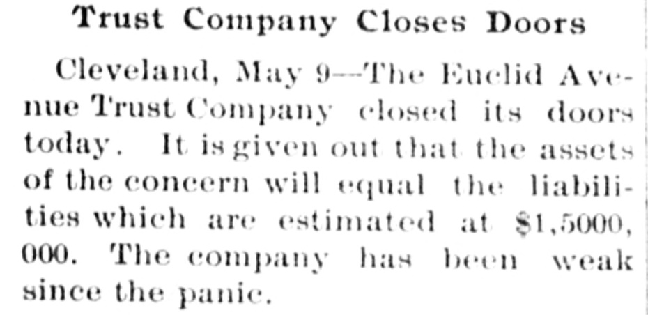 Trust Company Closes Doors Cleveland, May 9-The Euclid Avenue Trust Company closed its doors today. It is given out that the assets of the concern will equal the liabilities which are estimated at $1,5000, 000. The company has been weak since the panic.