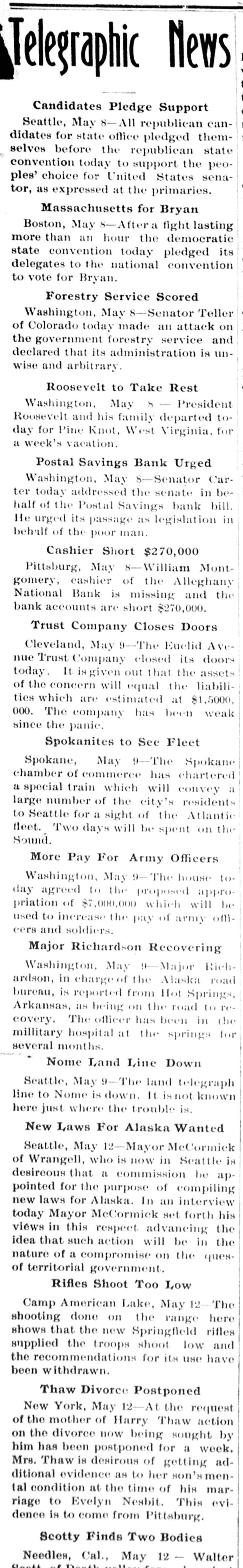 Telegraphic News Candidates Pledge Support Seattle, May 8- All republican candidates for state office pledged themselves before the republican state convention today to support the peoples' choice for United States senator, as expressed at the primaries. Massachusetts for Bryan Boston, May 8-After a fight lasting more than an hour the democratic state convention today pledged its delegates to the national convention to vote for Bryan. Forestry Service Scored Washington, May 8-Senator Teller of Colorado today made an attack on the government forestry service and declared that its administration is unwise and arbitrary. Roosevelt to Take Rest Washington, May 8 - President Roosevelt and his family departed today for Pine Knot, West Virginia. for a week's vacation. Postal Savings Bank Urged Washington, May 8-Senator Carter today addressed the senate in behalf of the Postal Savings bank bill. He urged its passage as legislation in behalf of the poor man. Cashier Short $270,000 Pittsburg, May 8-William Montgomery, cashier of the Alleghany National Bank is missing and the bank accounts are short $270,000. Trust Company Closes Doors Cleveland, May 9-The Euclid Avenue Trust Company closed its doors today. It given out that the assets of the concern will equal the liabilities which are estimated at $1,5000, 000. The company has been weak since the panic. Spokanites to See Fleet Spokane, May 9-The Spokane a a large chamber special number of train commerce of which the city's will has chartered convey residents to Seattle for a sight of the Atlantic fleet. Two days will be spent on the Sound. More Pay For Army Officers Washington, May The house today agreed to the proposed appropriation of $7,000,000 which will be used to increase the pay of army officers and soldiers. Major Richardson Recovering Washington, May 9-Major Richardson, in charge of the Alaska road bureau, is reported from Hot Springs, Arkansas, as being on the road to recovery. The officer has been in the millitary hospital at the springs for several months. Nome Land Line Down Seattle, May 9-The land telegraph line to Nome is down. It not known here just where the trouble is. New Laws For Alaska Wanted Seattle, May 12-Mayor McCormick of Wrangell, who is now in Seattle is desireous that a commission be appointed for the purpose of compiling new laws for Alaska. In an interview today Mayor McCormick set forth his views in this respect advancing the idea that such action will be in the nature of a compromise on the quesof territorial government. Rifles Shoot Too Low Camp American Lake, May 12-The shooting done on the range here shows that the new Springfield rifles supplied the troops shoot low and the recommendations for its use have been withdrawn. Thaw Divorce Postponed New York, May 12-At the request of the mother of Harry Thaw action on the divorce now being sought by him has been postponed for a week. Mrs. Thaw is desirous of getting additional evidence as to her son's mental condition at the time of his marriage to Evelyn Nesbit. This evidence is to come from Pittsburg. Scotty Finds Two Bodies Needles, Cal., May 12 - Walter Death