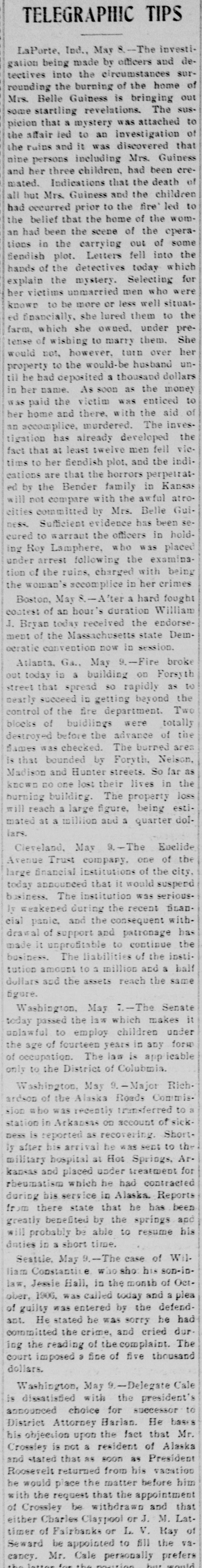 TELEGRAPHIC TIPS LaPorte, Ind., May 8. The investi- degation being made by officers and tectives into the circumstances sur- of the burning of the home Belle Guiness is rounding Mrs. bringing The sus- out some startling revelations. picion that a mystery was attached to the affair led to an investigation of the ruins and it was discovered that nine persons including Mrs. Guiness and her three children, had been ere- of mated. Indications that the death all but Mrs. Guiness and the children had occurred prior to the fire led to the belief that the home of the woman had been the scene of the eperatioos in the carrying out of some fiendish plot. Letters fell into the hands of the detectives today which for explain the mystery. Selecting her victims unmarried men who were known to be more or less well situat- the ed financially, she lured them to farm, which she owned. under pretense of wishing to marry them. She would not, however, turn over her property to the would-be husband until he had deposited 3 thousand dollars in her name. As soon as the money was paid the victim was enticed to her home and there. with the aid of an accomplice, murdered. The inves- the tigation has already developed fact that at least twelve men fell victime to her fiendish plot, and the indications are that the horrors perpetrated by the Bender family in Kansas 18 ill not compare with the swful atro- Guicities committed by Mrs. Belle ness. Sufficient evidence has been secured to warraut the officers in holding Roy Lamphere, who was placed under arrest following the examination of the ruins, charged with being the woman's recomplice in her crimes Boston, May & - After a hard fought coatest of 3D hour's duration William J. Bryan today received the endorse- Demment of the Massachusetts state ocratic convention now in session. Atlanta. Ga., May 9. -Fire broke out today in a building on Forsyth to street that spread so rapidly as the nearly succeed in getting beyond Two control of the fire department. blocks of buillings were totally destroyed before the advance of the flames was checked. The burned area that bounded by Foryth. Nelson, Madison and Hunter streets. So far as DO one lost their known building. lives in the burning The property loss will reach a large figure, being esti- dolmated at a million and a quarter lars. Cieveland, May 2-The Evelide Avenue Trust company. one of the large financial institutions of the city, today announced that it would suspend business. The institution was seriousis weakened during the recent financial panic, and the consequent with- has drawal of support and patronage made it unprofitable to continue the business. The liabilities of the institution amount to a million and a balf dollars and the assets reach the same figure. Washington. May -The Senate it today passed the law which makes uplawful to employ children under forw the age of fourteen years in any of occupation. The las is applicable only to the District of Colubmia. Washington, May 9.-Major Rich ardson of the Alaska Roads Commission abo was recently transferred station in Arkansas 00 account of sickness is reported as recovering. Shortby after his arrival be was sent to Ar. the military hospital at Hot Springs, kansas and placed under treatment for rbeumatism which he had contracted during bis service in Alaska. Reports fr om there state that he has been greatly benefited by the springs and his will probably be able to resume daties in a short time. Seattle, May -The case of Will liam Constantice who sho: his son-inlaw, Jessie Hall, in the month of October, 1906. was called today and a plea of guilty was entered by the defend- had He stated he was sorry he dur committed ant. the crime, and cried The ing the reading of the complaint. court imposed a fine of five thousand dollars. Washington, May -Delegate Cale is dissatisfied with the president's announced choice for successor te District Attorney Harlan. He basis Mr. his objection upon the fact that Crossley is not a resident of Alaska and stated that as soon as President Roosevelt returned from his vacation he would place the matter before him with the request that the appointment that of Crossley be withdrawn and either Charles Claypool or J. M. Latof Fairbanks or L. V. Ray of be appointed to Seward timer fill the prefers vaMr. Cale personally cancy. latter for the the would