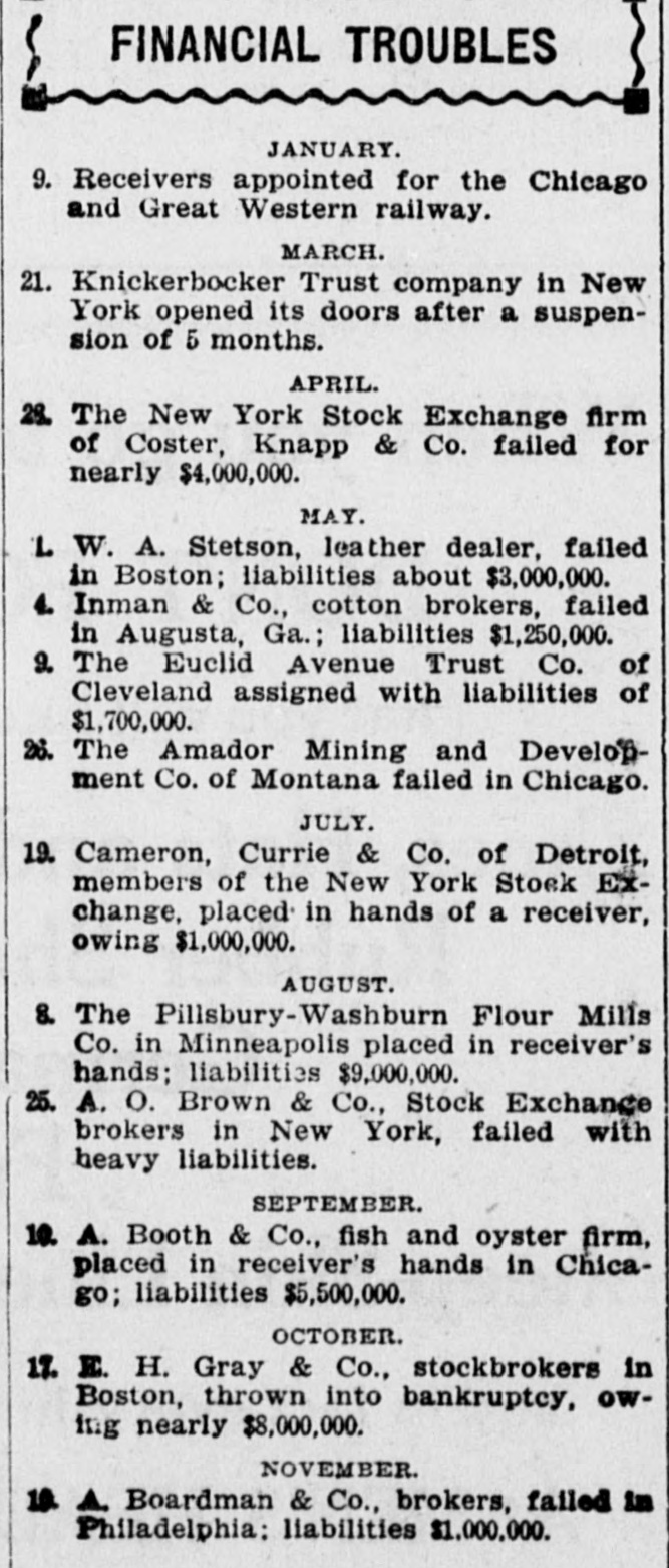 FINANCIAL TROUBLES JANUARY. 9. Receivers appointed for the Chicago and Great Western railway. MARCH. 21. Knickerbocker Trust company in New York opened its doors after a suspension of 5 months. APRIL. 28. The New York Stock Exchange firm of Coster, Knapp & Co. failed for nearly $4,000,000. MAY. L W. A. Stetson, leather dealer, failed in Boston; liabilities about $3,000,000. 4. Inman & Co., cotton brokers, failed in Augusta, Ga.; liabilities $1,250,000. 9. The Euclid Avenue Trust Co. of Cleveland assigned with liabilities of $1,700,000. 26. The Amador Mining and Development Co. of Montana failed in Chicago. JULY. 19. Cameron, Currie & Co. of Detroit, members of the New York Stock Exchange, placed in hands of a receiver, owing $1,000,000. AUGUST. 8. The Pillsbury-Washburn Flour Mills Co. in Minneapolis placed in receiver's hands; liabilities $9,000,000. 25. A. O. Brown & Co., Stock Exchange brokers in New York, failed with heavy liabilities. SEPTEMBER. 10. A. Booth & Co., fish and oyster firm, placed in receiver's hands in Chicago; liabilities $5,500,000. OCTOBER. 17. E. H. Gray & Co., stockbrokers in Boston, thrown into bankruptcy, owing nearly $8,000,000. NOVEMBER. 10. Boardman & Co., brokers, failed in Philadelphia: liabilities $1,000,000.