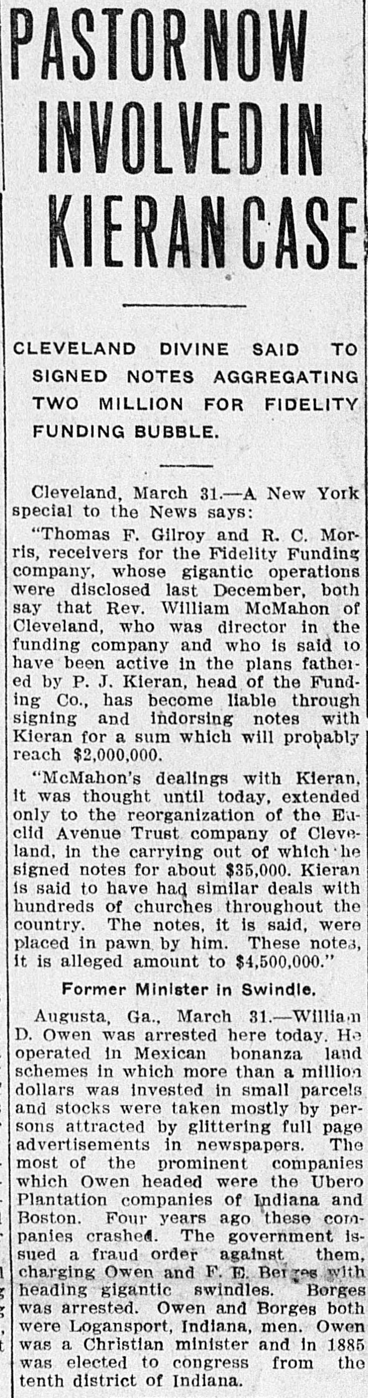 PASTOR NOW INVOLVED IN KIERAN CASE CLEVELAND DIVINE SAID TO SIGNED NOTES AGGREGATING TWO MILLION FOR FIDELITY FUNDING BUBBLE. Cleveland, March 31.-A New York special to the News says: "Thomas F. Gilroy and R. C. Morris, receivers for the Fidelity Funding company, whose gigantic operations were disclosed last December, both say that Rev. William McMahon of Cleveland, who was director in the funding company and who is said to have been active in the plans fathered by P. J. Kieran, head of the Funding Co., has become liable through signing and indorsing notes with Kieran for a sum which will probably reach $2,000,000. "McMahon's dealings with Kieran, it was thought until today, extended only to the reorganization of the Euclid Avenue Trust company of Cleveland, in the carrying out of which he signed notes for about $35,000. Kieran is said to have had similar deals with hundreds of churches throughout the country. The notes, it is said, were placed in pawn by him. These notes, it is alleged amount to $4,500,000." Former Minister in Swindle. Augusta, Ga., March 31.-Willian D. Owen was arrested here today. He operated in Mexican bonanza land schemes in which more than a million dollars was invested in small parcels and stocks were taken mostly by persons attracted by glittering full page advertisements in newspapers. The most of the prominent companies which Owen headed were the Ubero Plantation companies of Indiana and Boston. Four years ago these companies crashed. The government issued a fraud order against them, charging Owen and F. E. Berzes with heading gigantic swindles. Borges was arrested. Owen and Borges both were Logansport, Indiana, men. Owen was a Christian minister and in 1885 was elected to congress from the tenth district of Indiana.