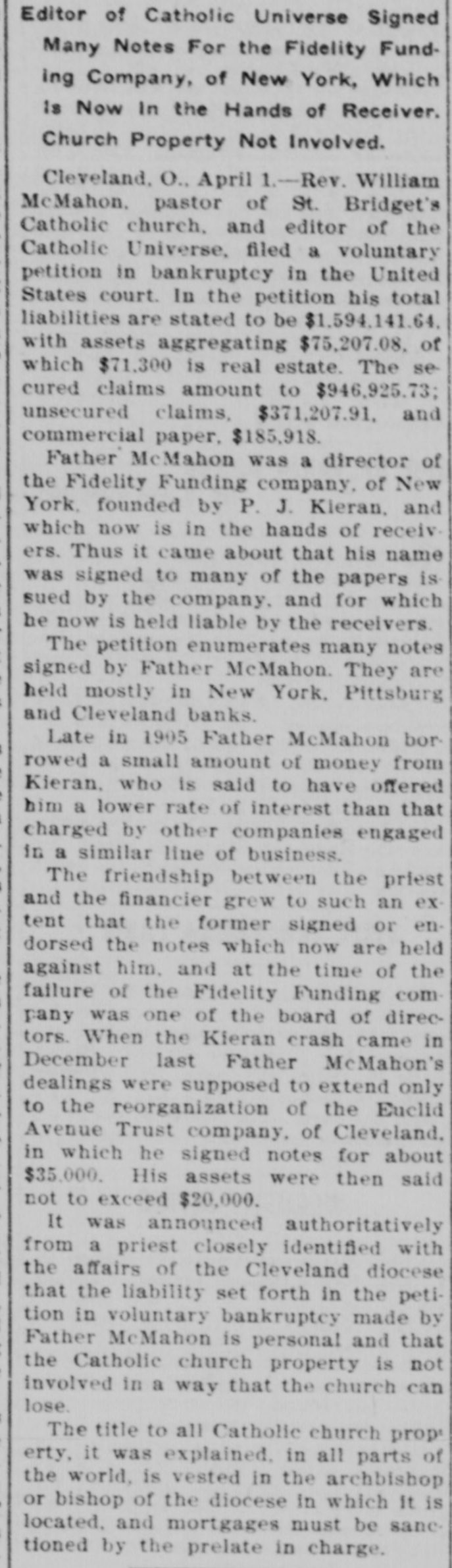 Editor of Catholic Universe Signed Many Notes For the Fidelity Funding Company, of New York, Which is Now In the Hands of Receiver. Church Property Not Involved. Cleveland, O., April 1.-Rev. William McMahon. pastor of St. Bridget's Catholic church, and editor of the Catholic Universe, filed a voluntary petition in bankruptcy in the United States court. In the petition his total liabilities are stated to be $1,594,141.64. with assets aggregating $75,207.08. of which $71,300 is real estate. The secured claims amount to $946,925.73; unsecured claims, $371,207.91. and commercial paper, $185,918. Father McMahon was a director of the Fidelity Funding company, of New York, founded by P. J. Kleran, and which now is in the hands of receivers. Thus it came about that his name was signed to many of the papers is sued by the company, and for which he now is held liable by the receivers. The petition enumerates many notes signed by Father McMahon. They are held mostly in New York, Pittsburg and Cleveland banks. Late in 1905 Father McMahon borrowed a small amount of money from Kieran, who is said to have offered him a lower rate of interest than that charged by other companies engaged in a similar line of business. The friendship between the priest and the financier grew to such an extent that the former signed or endorsed the notes which now are held against him. and at the time of the failure of the Fidelity Funding company was one of the board of directors. When the Kieran crash came in December last Father McMahon's dealings were supposed to extend only to the reorganization of the Euclid Avenue Trust company, of Cleveland. in which he signed notes for about $35,000. His assets were then said not to exceed $20,000. It was announced authoritatively from a priest closely identified with the affairs of the Cleveland diocese that the liability set forth in the petition in voluntary bankruptcy made by Father McMahon is personal and that the Catholic church property is not involved in a way that the church can lose. The title to all Catholic church prop erty, it was explained, in all parts of the world, is vested in the archbishop or bishop of the diocese in which It is located. and mortgages must be sanctioned by the prelate in charge.