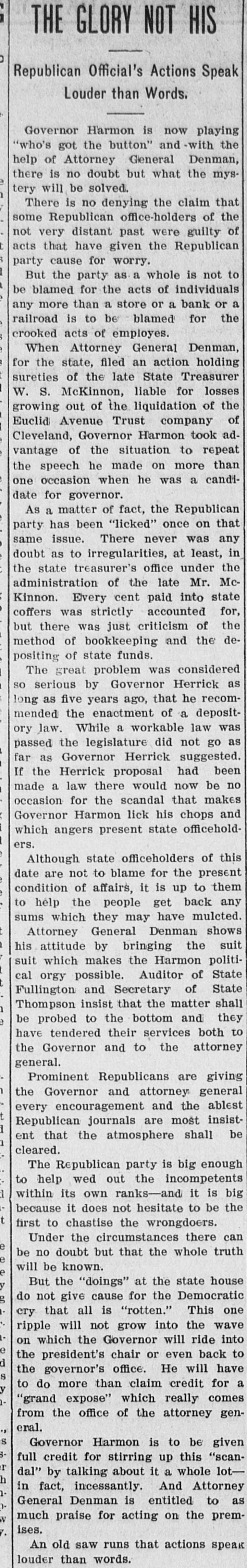# THE GLORY NOT HIS Republican Official's Actions Speak Louder than Words. Governor Harmon is now playing "who's got the button" and with the help of Attorney General Denman, there is no doubt but what the mystery will be solved. There is no denying the claim that some Republican office-holders of the not very distant past were guilty of acts that have given the Republican party cause for worry. But the party as a whole is not to be blamed for the acts of individuals any more than a store or a bank or a railroad is to be blamed for the crooked acts of employes. When Attorney General Denman, for the state, filed an action holding sureties of the late State Treasurer W. S. McKinnon, liable for losses growing out of the liquidation of the Euclid Avenue Trust company of Cleveland, Governor Harmon took advantage of the situation to repeat the speech he made on more than one occasion when he was a candidate for governor. As a matter of fact, the Republican party has been "licked" once on that same issue. There never was any doubt as to irregularities, at least, in the state treasurer's office under the administration of the late Mr. McKinnon. Every cent paid into state coffers was strictly accounted for, but there was just criticism of the method of bookkeeping and the depositing of state funds. The great problem was considered so serious by Governor Herrick as long as five years ago, that he recommended the enactment of a depository law. While a workable law was passed the legislature did not go as far as Governor Herrick suggested. If the Herrick proposal had been made a law there would now be no occasion for the scandal that makes Governor Harmon lick his chops and which angers present state officeholders. Although state officeholders of this date are not to blame for the present condition of affairs, it is up to them to help the people get back any sums which they may have mulcted. Attorney General Denman shows his attitude by bringing the suit suit which makes the Harmon political orgy possible. Auditor of State Fullington and Secretary of State Thompson insist that the matter shall be probed to the bottom and they have tendered their services both to the Governor and to the attorney general. Prominent Republicans are giving the Governor and attorney general every encouragement and the ablest Republican journals are most insistent that the atmosphere shall be cleared. The Republican party is big enough to help wed out the incompetents within its own ranks and it is big because it does not hesitate to be the first to chastise the wrongdoers. Under the circumstances there can be no doubt but that the whole truth will be known. But the "doings" at the state house do not give cause for the Democratic cry that all is "rotten." This one ripple will not grow into the wave on which the Governor will ride into the president's chair or even back to the governor's office. He will have to do more than claim credit for a "grand expose" which really comes from the office of the attorney general. Governor Harmon is to be given full credit for stirring up this "scandal" by talking about it a whole lot in fact, incessantly. And Attorney General Denman is entitled to as much praise for acting on the premises. An old saw runs that actions speak louder than words.