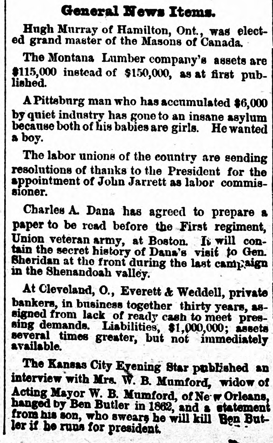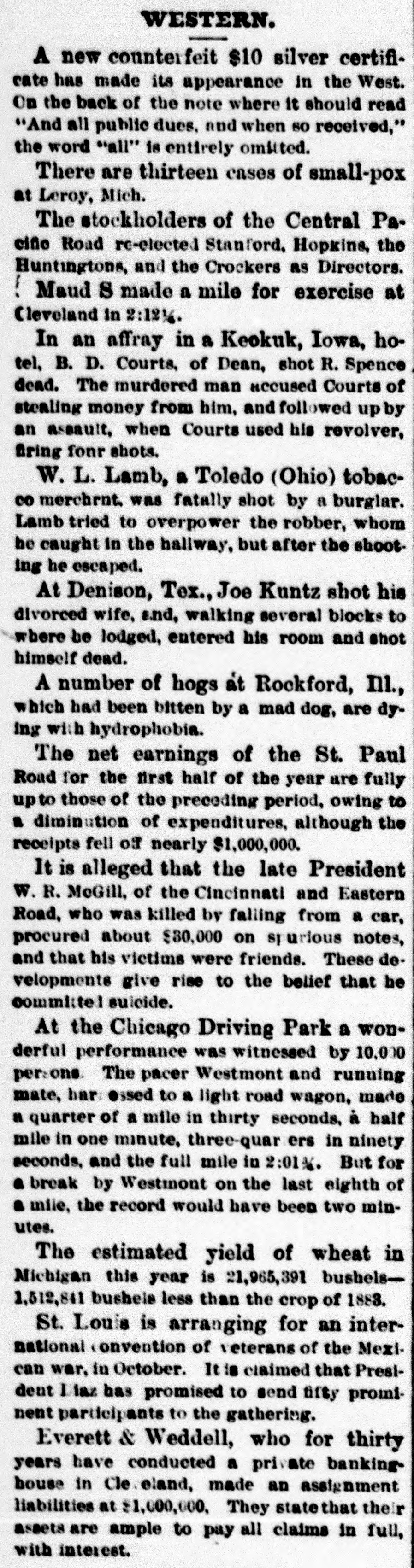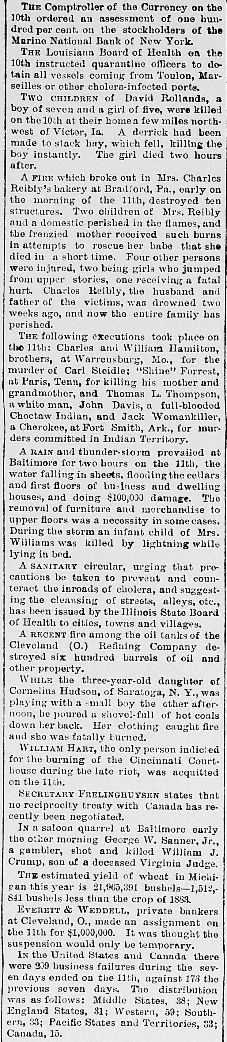 THE Comptroller of the Currency on the 10th ordered an assessment of one hundred per cent. on the stockholders of the Marino National Bank of New York. THE Louisiana Board of Health on the 10th instructed quarantine officers to detain all vessels coming from Toulon, Marseilles or other cholera-infected ports. Two CHILDREN of David Rollands, a boy of seven and a girl of five, were killed on the 10th at their homea few miles northwest of Victor, Ia. A derrick had been made to stack hay, which fell, killing the boy instantly. The girl died two hours after. A FIRE which broke out in Mrs. Charles Reibly's bakery at Bradford, Pa., early on the morning of the 11th, destroyed ten structures. Two children of Mrs. Reibly and a domestic perished in the flames, and the frenzied mother received such burns in attempts to rescue her babe that she died in a short time. Four other persons were injured, two being girls who jumped from upper stories, one receiving a fatal hurt. Charles Reibly, the husband and father of the victims, was drowned two weeks ago, and now the entire family has perished. THE following executions took place on the 11th: Charles and William Hamilton, brothers, at Warrensburg, Mo., for the murder of Carl Steidle: "Shine" Forrest, at Paris, Tenn, for killing his mother and grandmother, and Thomas L. Thompson, a white man, John Davis, a full-blooded Choctaw Indian, and Jack Womankiller, a Cherokee, at Fort Smith, Ark., for murders committed in Indian Territory. A RAIN and thunder-storm prevailed at Baltimore for two hours on the 11th, the water falling in sheets, flooding the cellars and first floors of business and dwelling houses, and doing $100,000 damage. The removal of furniture and merchandise to upper floors was a necessity in some cases. During the storm an infant child of Mrs. Williams was killed by lightning while lying in bed. A SANITARY circular, urging that precautions be taken to prevent and counteract the inroads of cholera, and suggesting the cleansing of streets, alleys, etc., has been issued by the Illinois State Board of Health to cities, towns and villages. A RECENT fire among the oil tanks of the Cleveland (0.) Refining Company destroyed six hundred barrels of oil and other property. WHILE the three-year-old daughter of Cornelius Hudson, of Saratoga, N. Y., was playing with a small boy the other afternoon, he poured a shovel-full of hot coals down her back. Her clothing caught fire and she was fatally burned. WILLIAM HART, the only person indicted for the burning of the Cincinnati Courthouse during the late riot, was acquitted on the 11th. SECRETARY FRELINGHUYSEN states that no reciprocity treaty with Canada has recently been negotiated. IN a saloon quarrel at Baltimore early the other morning George W. Sanner, Jr., a gambler, shot and killed William J. Crump, son of a deceased Virginia Judge. THE estimated yield of wheat in Michican this year is 21,965,391 bushels-1,512,841 bushels less than the crop of 1883. EVERETT & WEDDELL, private bankers at Cleveland, O., made an assignment on the 11th for $1,000,000. It was thought the suspension would only be temporary. IN the United States and Canada there were 209 business failures during the seven days ended on the 11th, against 173 the previous seven days. The distribution was as follows: Middle States, 38; New England States, 31; Western, 59; Southern, 33; Pacific States and Territories, 33;