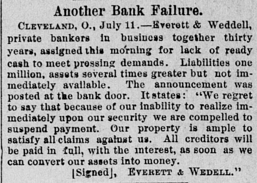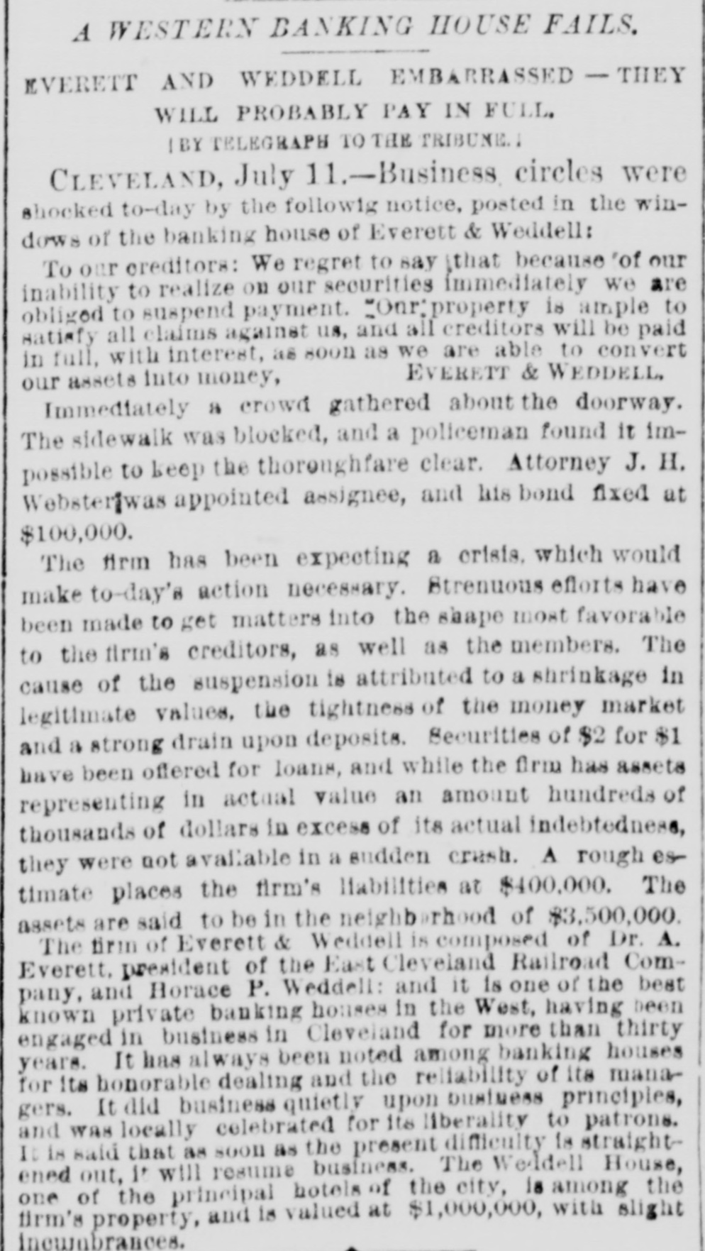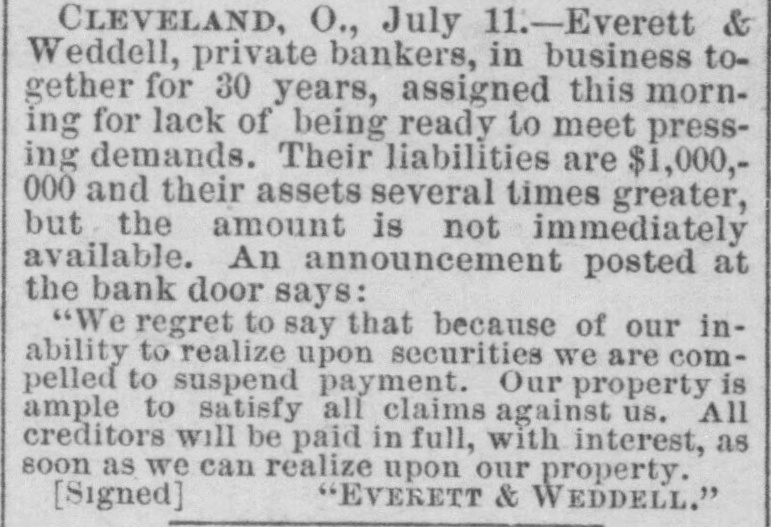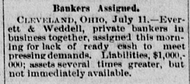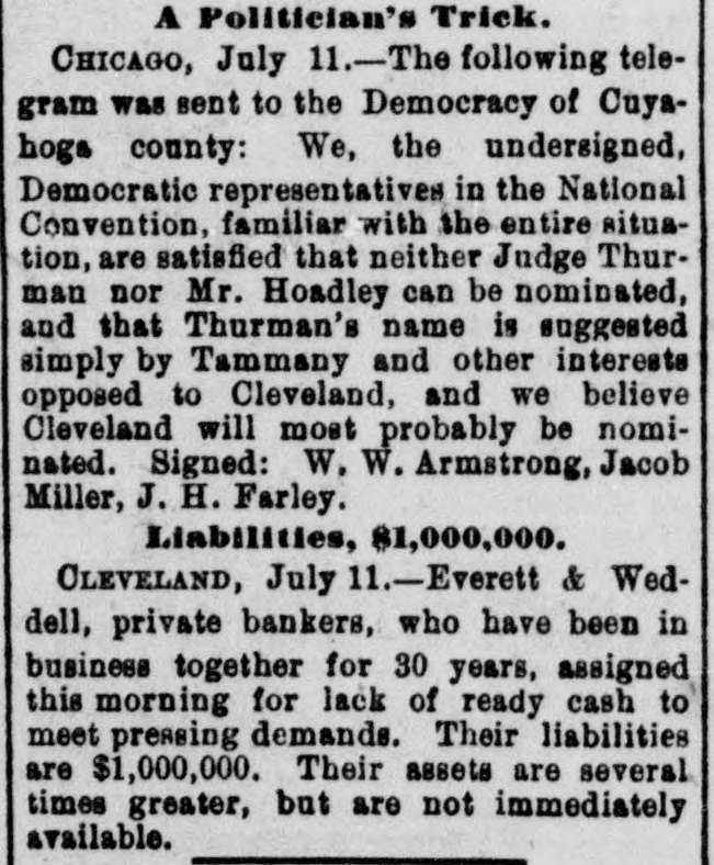 THE Comptroller of the Currency on the 10th ordered an assessment of one hundred per cent. on the stockholders of the Marino National Bank of New York. THE Louisiana Board of Health on the 10th instructed quarantine officers to detain all vessels coming from Toulon, Marseilles or other cholera-infected ports. Two CHILDREN of David Rollands, a boy of seven and a girl of five, were killed on the 10th at their homea few miles northwest of Victor, Ia. A derrick had been made to stack hay, which fell, killing the boy instantly. The girl died two hours after. A FIRE which broke out in Mrs. Charles Reibly's bakery at Bradford, Pa., early on the morning of the 11th, destroyed ten structures. Two children of Mrs. Reibly and a domestic perished in the flames, and the frenzied mother received such burns in attempts to rescue her babe that she died in a short time. Four other persons were injured, two being girls who jumped from upper stories, one receiving a fatal hurt. Charles Reibly, the husband and father of the victims, was drowned two weeks ago, and now the entire family has perished. THE following executions took place on the 11th: Charles and William Hamilton, brothers, at Warrensburg, Mo., for the murder of Carl Steidle: "Shine" Forrest, at Paris, Tenn, for killing his mother and grandmother, and Thomas L. Thompson, a white man, John Davis, a full-blooded Choctaw Indian, and Jack Womankiller, a Cherokee, at Fort Smith, Ark., for murders committed in Indian Territory. A RAIN and thunder-storm prevailed at Baltimore for two hours on the 11th, the water falling in sheets, flooding the cellars and first floors of business and dwelling houses, and doing $100,000 damage. The removal of furniture and merchandise to upper floors was a necessity in some cases. During the storm an infant child of Mrs. Williams was killed by lightning while lying in bed. A SANITARY circular, urging that precautions be taken to prevent and counteract the inroads of cholera, and suggesting the cleansing of streets, alleys, etc., has been issued by the Illinois State Board of Health to cities, towns and villages. A RECENT fire among the oil tanks of the Cleveland (0.) Refining Company destroyed six hundred barrels of oil and other property. WHILE the three-year-old daughter of Cornelius Hudson, of Saratoga, N. Y., was playing with a small boy the other afternoon, he poured a shovel-full of hot coals down her back. Her clothing caught fire and she was fatally burned. WILLIAM HART, the only person indicted for the burning of the Cincinnati Courthouse during the late riot, was acquitted on the 11th. SECRETARY FRELINGHUYSEN states that no reciprocity treaty with Canada has recently been negotiated. IN a saloon quarrel at Baltimore early the other morning George W. Sanner, Jr., a gambler, shot and killed William J. Crump, son of a deceased Virginia Judge. THE estimated yield of wheat in Michican this year is 21,965,391 bushels-1,512,841 bushels less than the crop of 1883. EVERETT & WEDDELL, private bankers at Cleveland, O., made an assignment on the 11th for $1,000,000. It was thought the suspension would only be temporary. IN the United States and Canada there were 209 business failures during the seven days ended on the 11th, against 173 the previous seven days. The distribution was as follows: Middle States, 38; New England States, 31; Western, 59; Southern, 33; Pacific States and Territories, 33;
