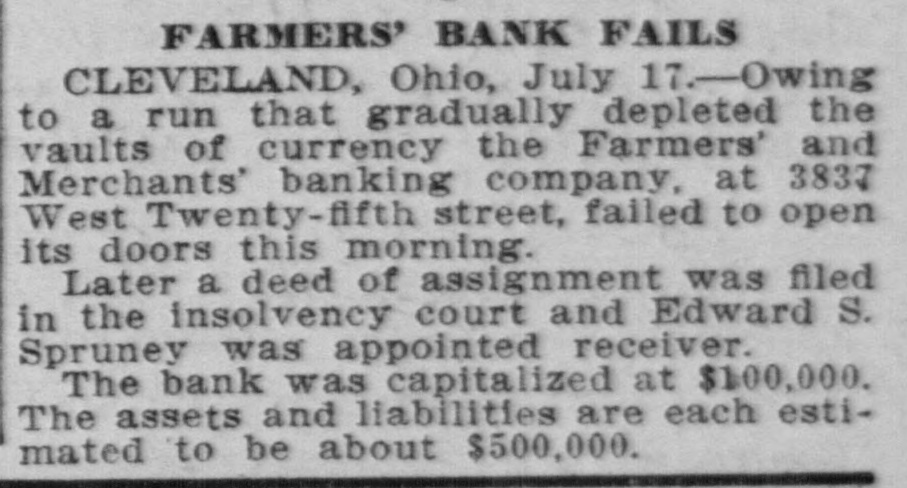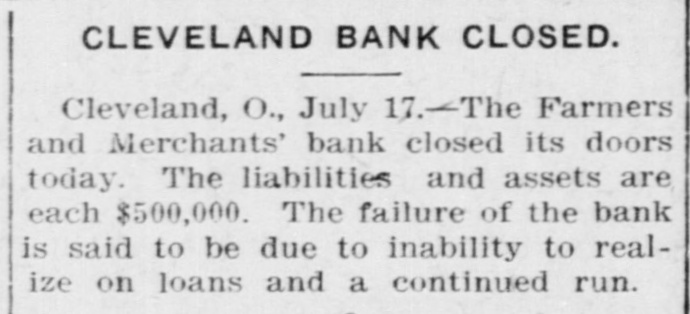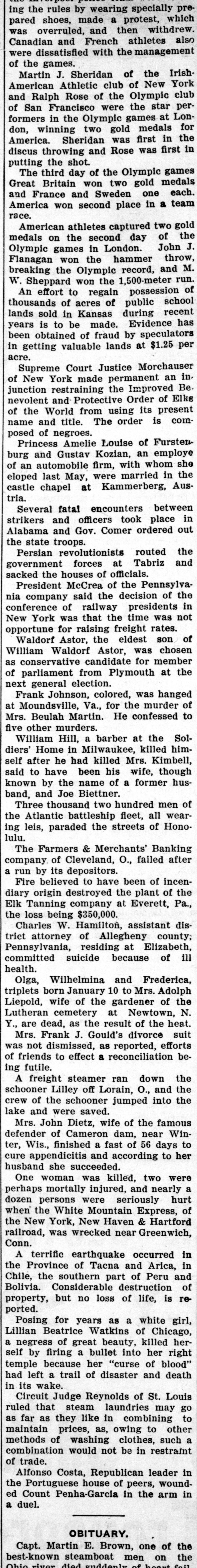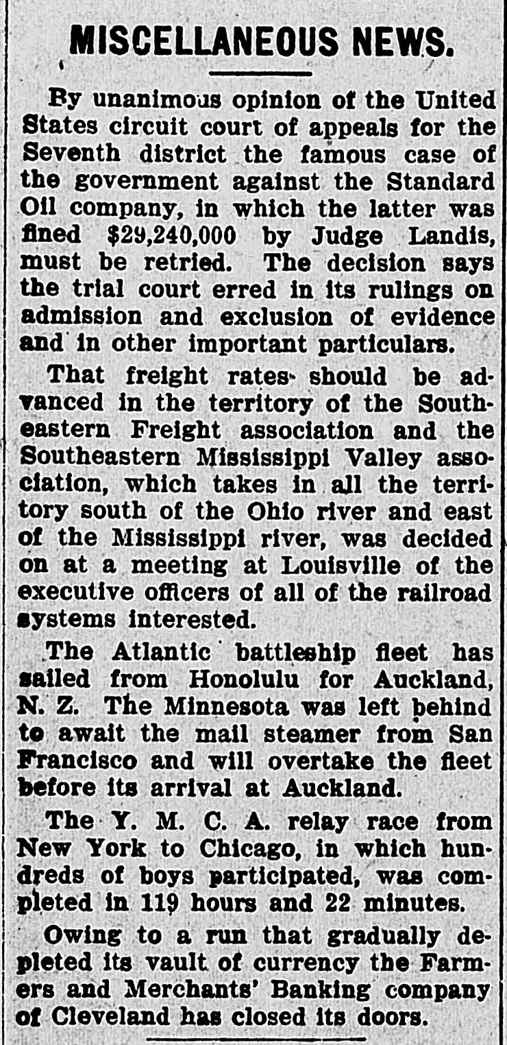 FINANCIAL Jan. 2-State Bank, Rockyford, Col., closed doors. 6-Four big New York diamond firms forced into trustee's hands; liabilities, $4,500,000. 8-Chicago Great Western railroad JOHN placed in hands of receivers. ROCKEFELLER 16-Western Bank and Trust Co., Dallas, Tex., largest Texas saving bank, placed in receiver's hands. 18-John R. Walsh, president Chicago National bank and several railroads, convicted of misappropriating institution's funds. 21-Capital State Bank, Boise, Idaho, suspended. 22-Traders and Mechanics' Bank, Pittsburg, Pa., closed doors. 25-National Bank of North America, New York, closed for liquidation, by order of government. 29-New Amsterdam National bank, capital $1,000,000, and Mechanics and Traders' bank, both of New York, taken in charge by comptroller of currency. 31-Oriental Bank of New York closed doors, following run. Feb. 13-W. B. Ridgely, comptroller of currency, accepted presidency of reorganized National Bank of Commerce, Kansas City, Mo. 26-International and Great Northern Railroad Co., a Gould line, placed in receivers' hands. 27-Financiers E. R. Thomas and O. F. Thomas indicted on charge of mismanagement of funds of Provident Savings Life Assurance society. Mar. 13-John R. Walsh denied new trial; sentenced to five years in federal prison. 16-People's National bank, Aspin, Col., closed. Apr. 1-Pike County Bank and Trust Co., Macomb City, Miss., placed in receiver's hands. 21-Bank of Wauseon, Wauseon, O., closed doors. 24-T. A. McIntyre & Co., with houses in many cities, failed for $1,000,000. May 8-Euclid Avenue Trust Co., Cleveland, O., assigned. 14-Reserve Trust Co., and American Savings bank, Cleveland, O., closed their doors. 28-G. W. MacMillen & Co., Pittsburg, Pa., stockbrokers, failed; liabilities, Jun. $1,800,000. 3-Kosciusko Company bank, Warsaw, Ind., closed by state auditor. 23-Citizens' bank, Dover, Ky., closed Jul. doors. -National Deposit bank, Philadelphia, Pa., closed by comptroller of cur17-Farmers rency. and Merchants' Banking Co., Cleveland, O., failed. 22-Standard Oil $29,240,000 fine dectsion unanimously reversed by United States court of appeals at ChiAug. engo. 6-First National bank, Belle Plaine, Minn., closed by order comptroller of currency; bank was insolvent; President J. G. Lund committed suicide. 25-A. O. Brown & Co., one of largest New York brokerage firms, failed; liabilities over $1,000,000. Sep. 10-A. Booth & Co., largest fish house in country, forced into receiver's Oct. hands. 16-Union National bank, Sommerville, Pa., closed by government. Nov. 5-Charles W. Morse and Alfred H. Curtis, great financiers, found guilty of misapplication of funds and falsifying books of National Bank of America, New York. 6-C. W. Morse sentenced to 15 years; Curtis given liberty on suspended sen23-Eldred tence. bank of Eldred, Pa., suspended; capital stock, $100,000. Dec. 7-National exchange bank at Springfield, Mo., closed; excitement caused by effort of W. O. Oldham, cashier of State Savings bank, to shoot President H. B. McDaniel, of Union National bank. 11-Springport, Mich., State Savings bank closed by bank examiner. 16-Somersworth, N. H., First National bank closed, following discovery of shortage of $85,000. 23-Thomas F. Ryan announced retirement from finance. 26-Henry W. Poor, New York broker, assigned for creditors.