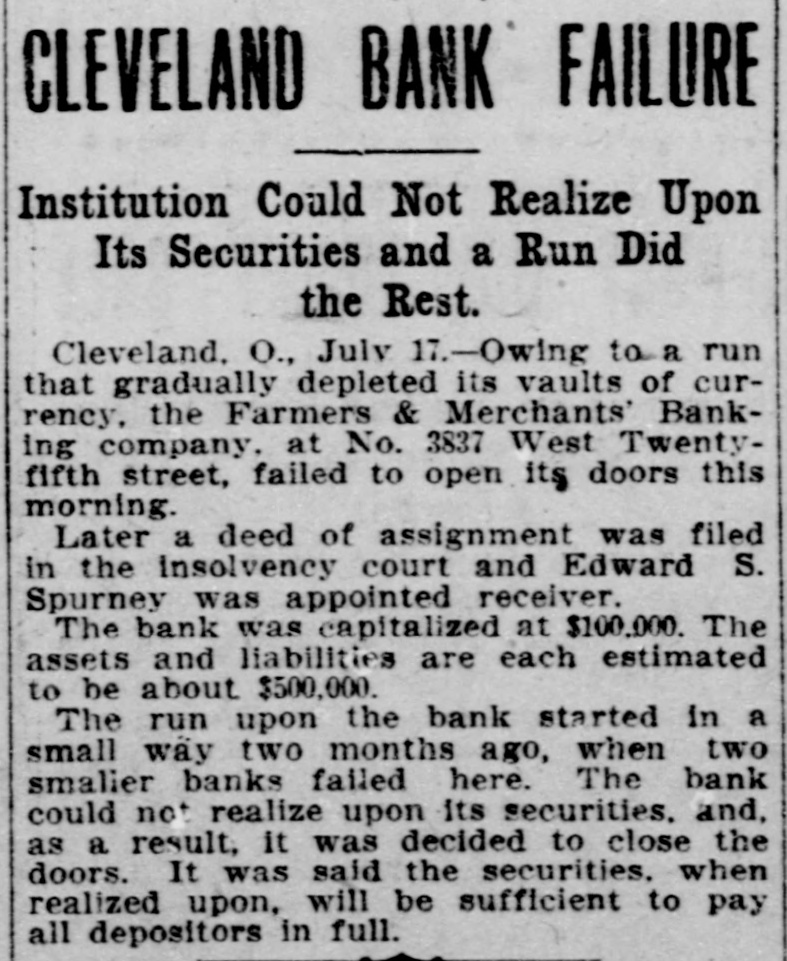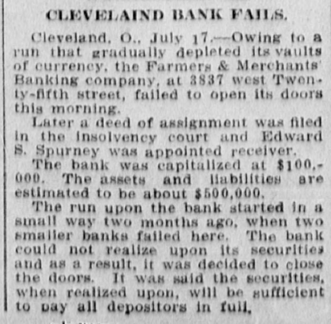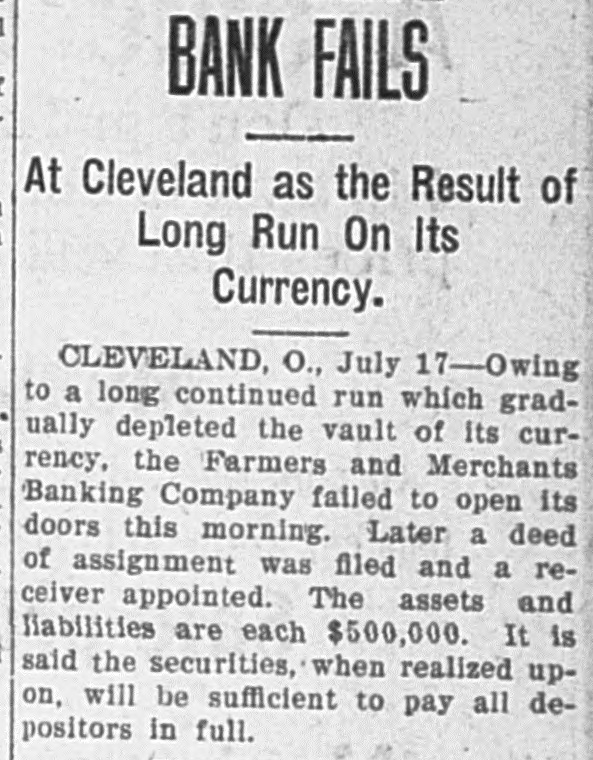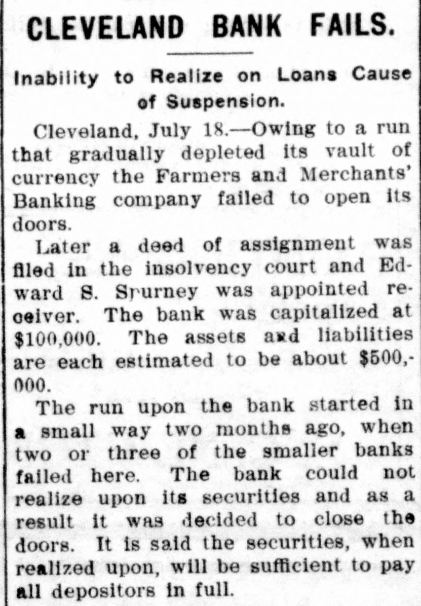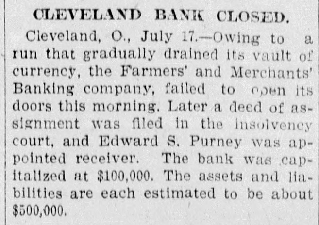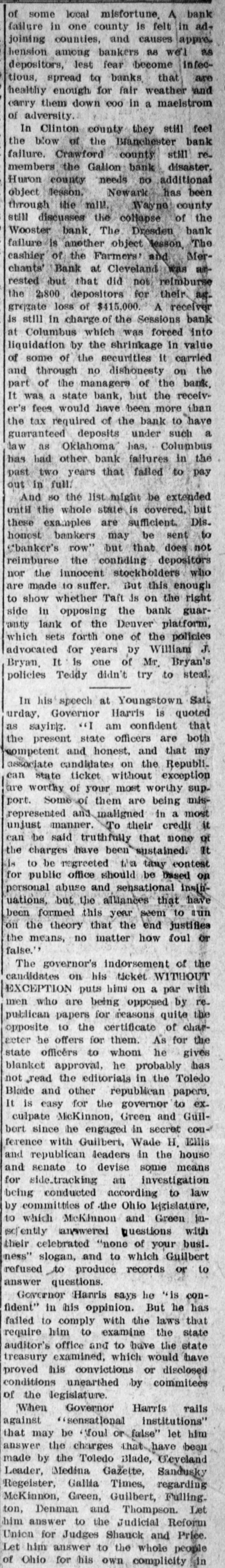 FINANCIAL Jan. 2-State Bank, Rockyford, Col., closed doors. 6-Four big New York diamond firms forced into trustee's hands; liabilities, $4,500,000. 8-Chicago Great Western railroad JOHN placed in hands of receivers. ROCKEFELLER 16-Western Bank and Trust Co., Dallas, Tex., largest Texas saving bank, placed in receiver's hands. 18-John R. Walsh, president Chicago National bank and several railroads, convicted of misappropriating institution's funds. 21-Capital State Bank, Boise, Idaho, suspended. 22-Traders and Mechanics' Bank, Pittsburg, Pa., closed doors. 25-National Bank of North America, New York, closed for liquidation, by order of government. 29-New Amsterdam National bank, capital $1,000,000, and Mechanics and Traders' bank, both of New York, taken in charge by comptroller of currency. 31-Oriental Bank of New York closed doors, following run. Feb. 13-W. B. Ridgely, comptroller of currency, accepted presidency of reorganized National Bank of Commerce, Kansas City, Mo. 26-International and Great Northern Railroad Co., a Gould line, placed in receivers' hands. 27-Financiers E. R. Thomas and O. F. Thomas indicted on charge of mismanagement of funds of Provident Savings Life Assurance society. Mar. 13-John R. Walsh denied new trial; sentenced to five years in federal prison. 16-People's National bank, Aspin, Col., closed. Apr. 1-Pike County Bank and Trust Co., Macomb City, Miss., placed in receiver's hands. 21-Bank of Wauseon, Wauseon, O., closed doors. 24-T. A. McIntyre & Co., with houses in many cities, failed for $1,000,000. May 8-Euclid Avenue Trust Co., Cleveland, O., assigned. 14-Reserve Trust Co., and American Savings bank, Cleveland, O., closed their doors. 28-G. W. MacMillen & Co., Pittsburg, Pa., stockbrokers, failed; liabilities, Jun. $1,800,000. 3-Kosciusko Company bank, Warsaw, Ind., closed by state auditor. 23-Citizens' bank, Dover, Ky., closed Jul. doors. -National Deposit bank, Philadelphia, Pa., closed by comptroller of cur17-Farmers rency. and Merchants' Banking Co., Cleveland, O., failed. 22-Standard Oil $29,240,000 fine dectsion unanimously reversed by United States court of appeals at ChiAug. engo. 6-First National bank, Belle Plaine, Minn., closed by order comptroller of currency; bank was insolvent; President J. G. Lund committed suicide. 25-A. O. Brown & Co., one of largest New York brokerage firms, failed; liabilities over $1,000,000. Sep. 10-A. Booth & Co., largest fish house in country, forced into receiver's Oct. hands. 16-Union National bank, Sommerville, Pa., closed by government. Nov. 5-Charles W. Morse and Alfred H. Curtis, great financiers, found guilty of misapplication of funds and falsifying books of National Bank of America, New York. 6-C. W. Morse sentenced to 15 years; Curtis given liberty on suspended sen23-Eldred tence. bank of Eldred, Pa., suspended; capital stock, $100,000. Dec. 7-National exchange bank at Springfield, Mo., closed; excitement caused by effort of W. O. Oldham, cashier of State Savings bank, to shoot President H. B. McDaniel, of Union National bank. 11-Springport, Mich., State Savings bank closed by bank examiner. 16-Somersworth, N. H., First National bank closed, following discovery of shortage of $85,000. 23-Thomas F. Ryan announced retirement from finance. 26-Henry W. Poor, New York broker, assigned for creditors.
