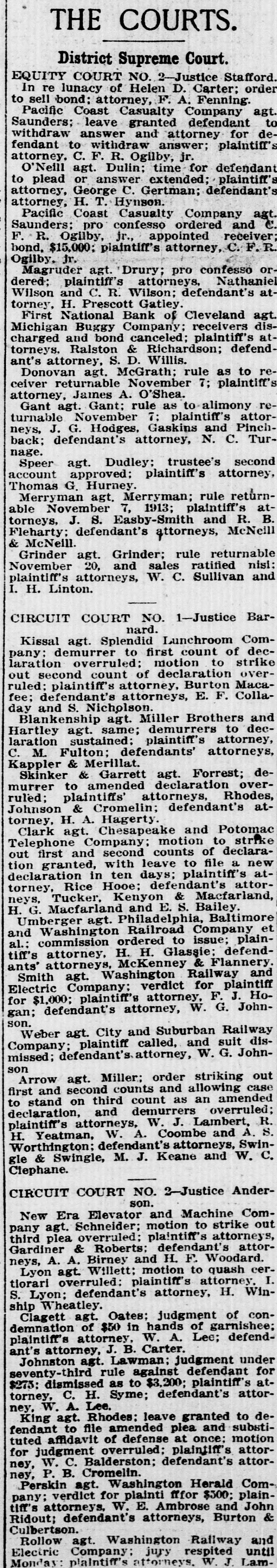 District Supreme Court. EQUITY COURT NO. -Justice Stafford. In re lunacy of Helen D. Carter; order to sell bond; attorney, F. A. Fenning. Pacific Coast Casualty Company agt. Saunders: leave granted defendant to withdraw answer and attorney for defendant to withdraw answer; plaintiff's attorney. C. F. R. Ogilby, jr. O'Neill agt. Dulin; time for defendant to plead or answer extended; plaintiff's attorney, George C. Gertman; defendant's attorney, H. T. Hynson. Pacific Coast Casualty Company agt. Saunders: pro confesso ordered and C. F. R. Ogilby, jr., appointed receiver; bond, $15,000; plaintiff's attorney, C. F. R. Ogilby, Jr. Magruder agt. Drury; pro confesso ordered; plaintiff's attorneys, Nathaniel Wilson and C. R. Wilson; defendant's attorney, H. Prescott Gatley. First National Bank of Cleveland agt. Michigan Buggy Company; receivers discharged and bond canceled; plaintiff's attorneys. Ralston & Richardson; defendant's attorney, S. D. Willis. Donovan agt. McGrath: rule as to receiver returnable November 7; plaintiff's attorney, James A. O'Shea. Gant agt. Gant; rule as to-alimony returnable November 7: plaintiff's attorneys, J. G. Hodges, Gaskins and Pinchback; defendant's attorney, N. C. Turnage. Speer agt. Dudley; trustee's second account approved: plaintiff's attorney, Thomas G. Hurney. Merryman agt. Merryman; rule returnable November 7, 1913; plaintiff's attorneys, J. S. Easby-Smith and R. B. Fleharty: defendant's attorneys, McNeill & McNeill. Grinder agt. Grinder: rule returnable November 20, and sales ratified nisi: plaintiff's attorneys, W. C. Sullivan and I. H. Linton. CIRCUIT COURT NO. 1-Justice Barnard. Kissal agt. Splendid Lunchroom Company: demurrer to first count of declaration overruled: motion to strike out second count of declaration overruled: plaintiff's attorney, Burton Macafee; defendant's attorneys, E. F. Colladay and S. Nicholson. Blankenship agt. Miller Brothers and Hartley agt. same; demurrers to declaration sustained: plaintiff's attorney, C. M. Fulton; defendants' attorneys, Kappler & Merillat. Skinker & Garrett agt. Forrest; demurrer to amended declaration overruled; plaintiffs' attorneys, Rhodes, Johnson & Cromelin; defendant's attorney, H. A. Hagerty. Clark agt. Chesapeake and Potomac Telephone Company; motion to strike out first and second counts of declaration granted, with leave to file a new declaration in ten days; plaintiff's attorney, Rice Hooe; defendant's attorneys, Tucker, Kenyon & Macfarland, H. G. Macfarland and E. S. Bailey. Umberger agt. Philadelphia, Baltimore and Washington Railroad Company et al.: commission ordered to issue; plaintiff's attorney, H. H. Glassie: defendants' attorneys, McKenney & Flannery. Smith agt. Washington Railway and Electric Company: verdict for plaintiff for $1,000; plaintiff's attorney, F. J. Hogan; defendant's attorney, W. G. Johnson. Weber agt. City and Suburban Railway Company; plaintiff called, and suit dismissed; defendant's attorney, W. G. Johnson Arrow agt. Miller: order striking out first and second counts and allowing case to stand on third count as an amended declaration, and demurrers overruled; plaintiff's attorneys, W. J. Lambert, R. H. Yeatman, W. A. Coombe and A. S. Worthington: defendant's attorneys, Swingle & Swingle, M. J. Keane and W. C. Clephane. CIRCUIT COURT NO. 2-Justice Anderson. New Era Elevator and Machine Company agt. Schneider; motion to strike out third plea overruled; plaintiff's attorneys, Gardiner & Roberts: defendant's attorneys, A. A. Birney and H. F. Woodard. Lyon agt. Willett: motion to quash certiorari overruled: plaintiff's attorney. I. S. Lyon; defendant's attorney, H. Winship Wheatley. Clagett agt. Oates; judgment of condemnation of $50 in hands of garnishee; plaintiff's attorney, W. A. Lee; defendant's attorney, J. B. Carter. Johnston agt. Lawman; judgment under rule against defendant for
