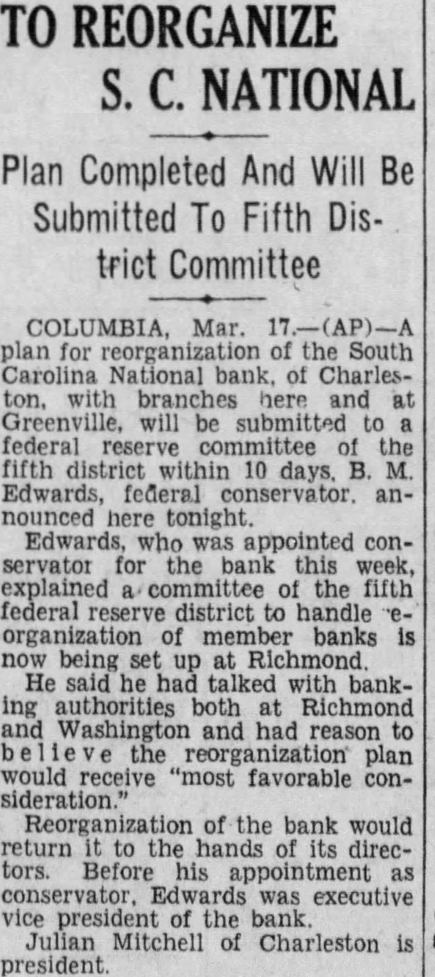 COLUMBIA, Mar. the South Carolina National Charlesbranches here and at Greenville, will be to federal reserve committee district within 10 Edwards, federal conservator. announced here tonight. Edwards, who conservator for this week, explained the federal district to handle organization member banks being set at He said he talked with banking authorities both Richmond Washington and had reason to the reorganization plan would "most favorable sideration. Reorganization of the bank would return to the hands its direcBefore his Edwards was executive vice president of the bank Julian Mitchell of Charleston