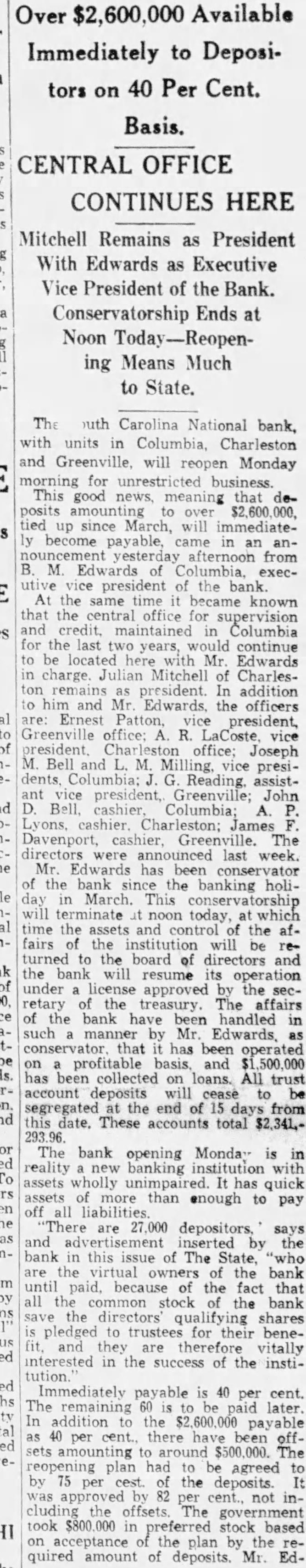 The outh Carolina National bank, with units Columbia, Charleston and Greenville, will reopen Monday morning for business This meaning that up since will immediateanM execof the the same time became known the central office for and credit, maintained Columbia for the last years, continue be Mr. Edwards Charlespresident. addition and Edwards the officers Greenville LaCoste Joseph Bell M. vice presiassistJohn Columbia; James last Mr Edwards has been the since the banking holiMarch. terminate noon today and the fairs the board and the bank resume operation under approved the the The affairs the bank have handled Edwards, that has loans. All trust deposits end of date. These accounts total $2,341.The bank opening Monday banking than enough to pay There are depositors inserted bank this issue of The the owners the bank paid, the fact that stock the bank the shares their benethey vitally interested in the of the institution Immediately payable 40 per cent The remaining later. In the payable per The reopening plan had agreed the deposits cent. not inoffsets. took $800.000 in preferred stock based acceptance quired amount of deposits. Mr.