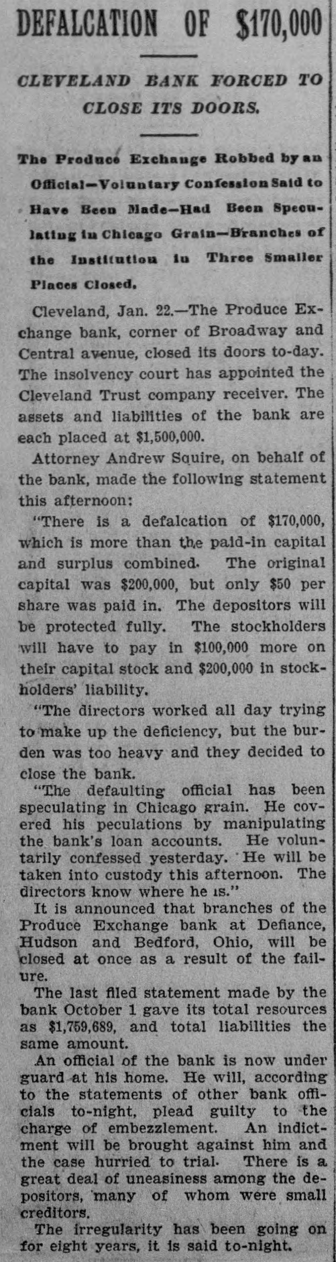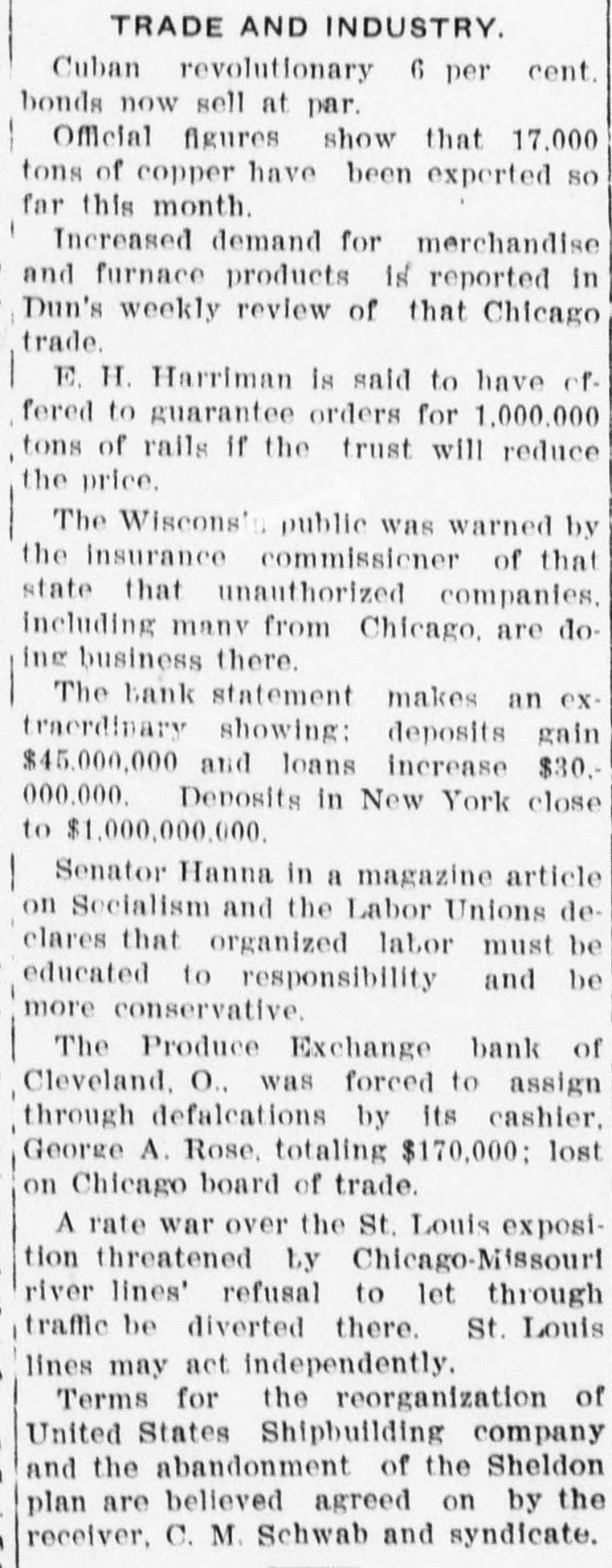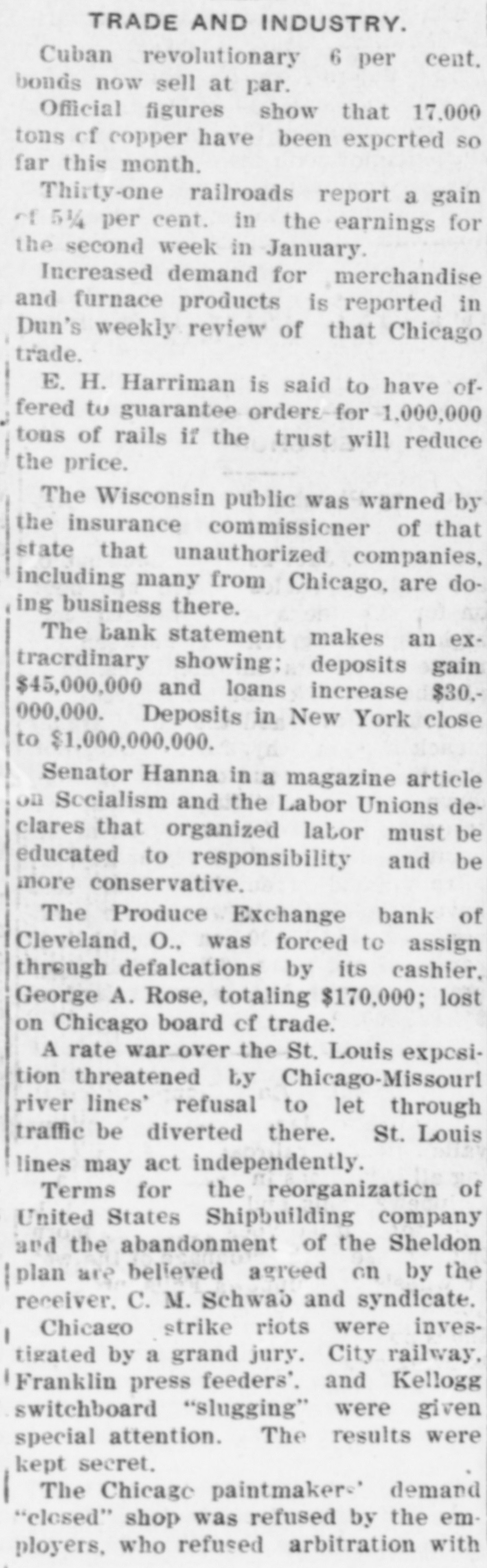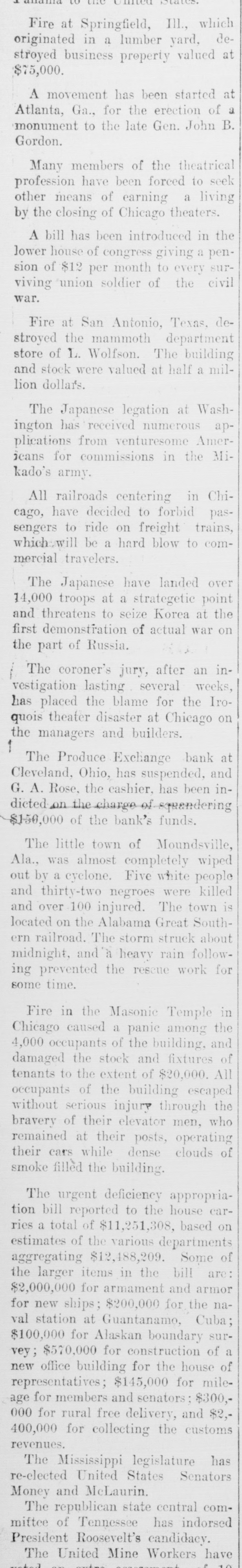 IC4 A the Fire at Springfield, Ill., which originated in a lumber yard, destroyed business property valued at $75,000. A movement has been started at Atlanta, Ga., for the erection of a monument to the late Gen. John B. Gordon. Many members of the theatrical profession have been forced to seek other means of earning a living by the closing of Chicago theaters. A bill has been introduced in the lower house of congress giving a pension of $12 per month to every surviving union soldier of the civil war. Fire at San Antonio, Texas, destroyed store of the L. Wolfson. mammoth The department building and stock were valued at half a million dollars. The Japanese legation at Washington has received numerous apventuresome plications from Americans for commissions in the Mikado's army. All railroads centering in Chicago, have decided to forbid passengers to ride on freight trains, whichewill be a hard blow to commercial travelers. The Japanese have landed over 14,000 troops at a strategetic point and threatens to seize Korea at the first demonstration of actual war on the part of Russia. / The coroner's jury, after an in vestigation lasting several weeks, has placed the blame for the Iroquois theater disaster at Chicago on the managers and builders. 1 The Produce Exchange bank at Cleveland, Ohio, has suspended, and G.A. Rose, the cashier, has been indicted on the charge of squandering $150,000 of the bank's funds. The little town of Moundsville, Ala., was almost completely wiped out by a cyclone. Five white people and thirty-two negroes were killed and over 100 injured. The town is located on the Alabama Great Southern railroad. The storm struck about midnight, and'à heavy rain following prevented the rescue work for some time. Fire in the Masonic Temple in Chicago caused a panic among the 4,000 occupants of the building, and damaged the stock and fixtures of tenants to the extent of $20,000. All occupants of the building escaped without serious injury through the bravery of their elevator men, who remained at their posts, operating their cars while dense clouds of smoke filled the building. The urgent deficiency appropriation bill reported to the house carries a total of $11,251,308, based on estimates of the various departments aggregating $12,488,209. Some of the larger items in the bill are: $2,000,000 for armament and armor for new ships; $200,000 for the naval station at Guantanamo, Cuba; $100,000 for Alaskan boundary survey; $570,000 for construction of a new office building for the house of representatives; $145,000 for mileage for members and senators: $300,000 for rural free delivery, and $2,400,000 for collecting the customs revenues. The Mississippi legislature has re-elected United States Senators Money and McLaurin. The republican state central committee of Tennessee has indorsed President Roosevelt's candidacy. The United Mine Workers have