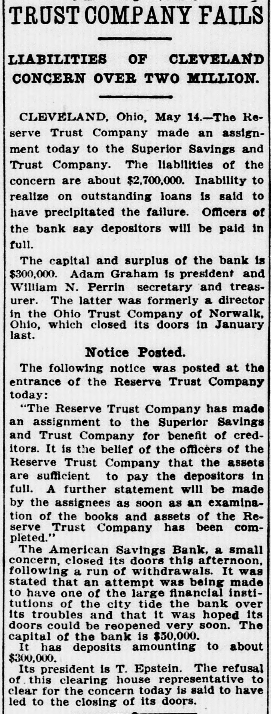 TRUST COMPANY FAILS LIABILITIES OF CLEVELAND CONCERN OVER TWO MILLION. CLEVELAND, Ohio, May 14.-The Reserve Trust Company made an assignment today to the Superior Savings and Trust Company. The liabilities of the concern are about $2,700,000. Inability to realize on outstanding loans is said to have precipitated the failure. Officers of the bank say depositors will be paid in full. The capital and surplus of the bank is $300,000. Adam Graham is president and William N. Perrin secretary and treasurer. The latter was formerly a director in the Ohio Trust Company of Norwalk, Ohio, which closed its doors in January last. Notice Posted. The following notice was posted at the entrance of the Reserve Trust Company today: "The Reserve Trust Company has made an assignment to the Superior Savings and Trust Company for benefit of creditors. It is the belief of the officers of the Reserve Trust Company that the assets are sufficient to pay the depositors in full. A further statement will be made by the assignees as soon as an examination of the books and assets of the Reserve Trust Company has been completed." The American Savings Bank, a small concern, closed its doors this afternoon, following a run of withdrawals. It was stated that an attempt was being made to have one of the large financial institutions of the city tide the bank over its troubles and that it was hoped its doors could be reopened very soon. The capital of the bank is $30,000. It has deposits amounting to about $300,000. Its president is T. Epstein. The refusal of this clearing house representative to clear for the concern today is said to have led to the closing of its doors.