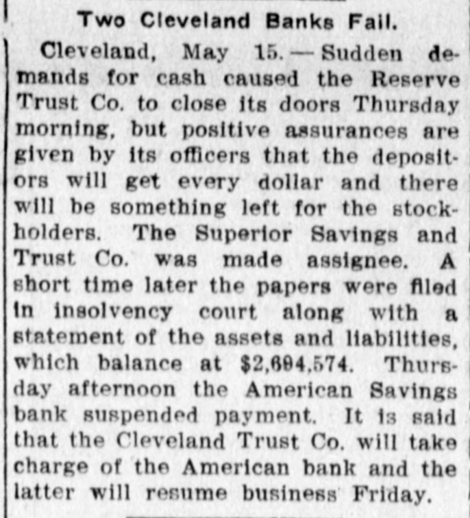 Two Cleveland Banks Fail. Cleveland, May 15. - Sudden demands for cash caused the Reserve Trust Co. to close its doors Thursday morning, but positive assurances are given by its officers that the depositors will get every dollar and there will be something left for the stockholders. The Superior Savings and Trust Co. was made assignee. A short time later the papers were filed in insolvency court along with a statement of the assets and liabilities, which balance at $2,694,574. Thursday afternoon the American Savings bank suspended payment. It is said that the Cleveland Trust Co. will take charge of the American bank and the latter will resume business Friday.