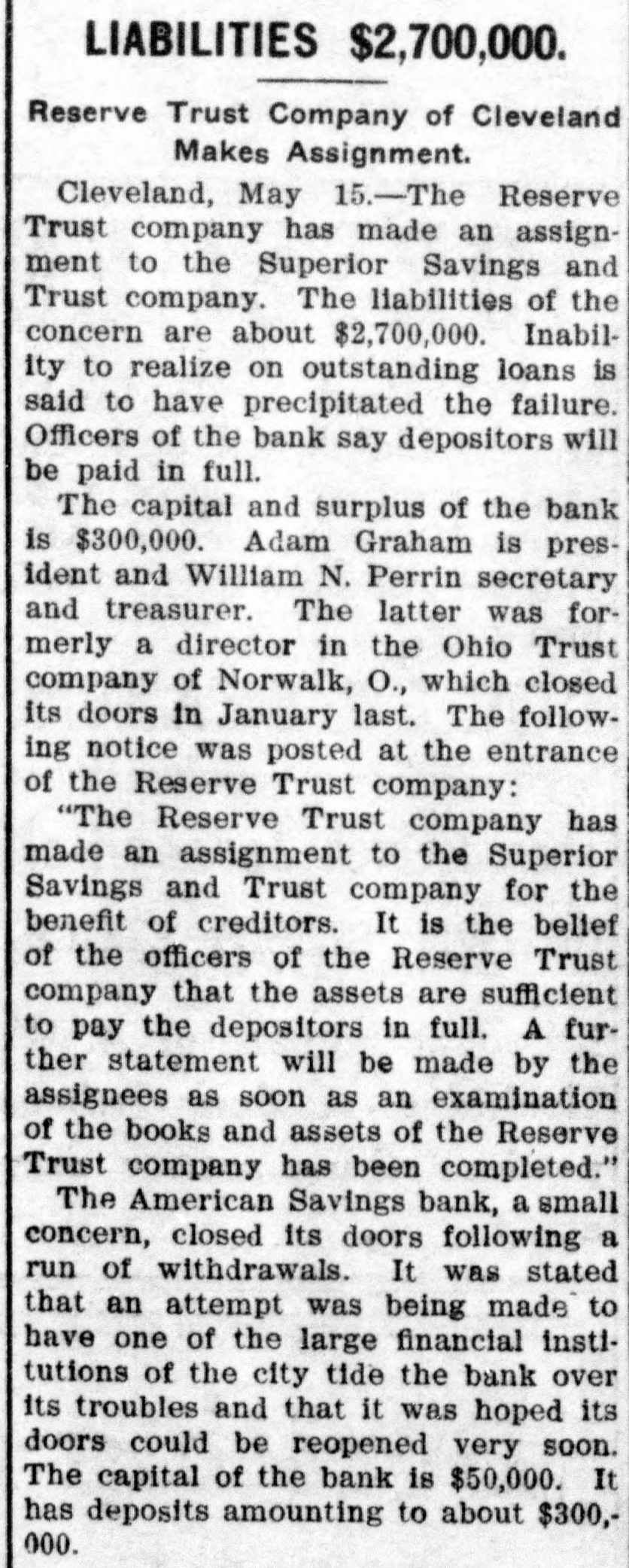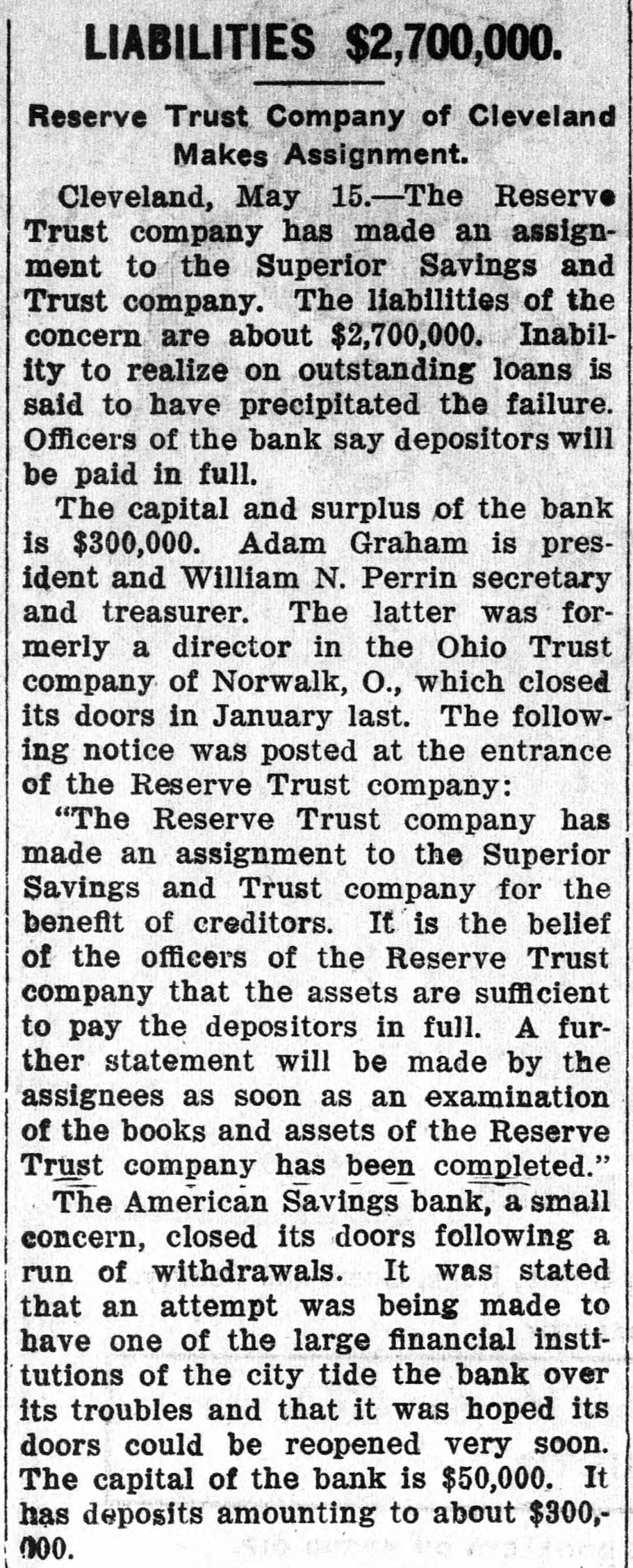 LIABILITIES $2,700,000. Reserve Trust Company of Cleveland Makes Assignment. Cleveland, May 15.-The Reserve Trust company has made an assignment to the Superior Savings and Trust company. The liabilities of the concern are about $2,700,000. Inability to realize on outstanding loans is said to have precipitated the failure. Officers of the bank say depositors will be paid in full. The capital and surplus of the bank is $300,000. Adam Graham is president and William N. Perrin secretary and treasurer. The latter was formerly a director in the Ohio Trust company of Norwalk, O., which closed its doors in January last. The following notice was posted at the entrance of the Reserve Trust company: "The Reserve Trust company has made an assignment to the Superior Savings and Trust company for the benefit of creditors. It is the belief of the officers of the Reserve Trust company that the assets are sufficient to pay the depositors in full. A further statement will be made by the assignees as soon as an examination of the books and assets of the Reserve Trust company has been completed." The American Savings bank, a small concern, closed its doors following a run of withdrawals. It was stated that an attempt was being made to have one of the large financial institutions of the city tide the bank over its troubles and that it was hoped its doors could be reopened very soon. The capital of the bank is $50,000. It has deposits amounting to about $300,000.