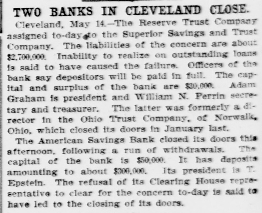TWO BANKS IN CLEVELAND CLOSE. Cleveland, May 14.-The Reserve Trust Company assigned to-day to the Superior Savings and Trust Company. The liabilities of the concern are about $2,700,000. Inability to realize on outstanding loans is said to have caused the failure. Officers of the bank say depositors will be paid in full. The capital and surplus of the bank are $30,000. Adam Graham is president and William N. Perrin secretary and treasurer. The latter was formerly & director in the Ohio Trust Company, of Norwalk, Ohio, which closed its doors in January last. The American Savings Bank closed its doors this afternoon, following a run of withdrawals. The capital of the bank is $50,000. It has deposits amounting to about $300,000. Its president is T. Epstein. The refusal of its Clearing House representative to clear for the concern to-day is said to have led to the closing of its doors.