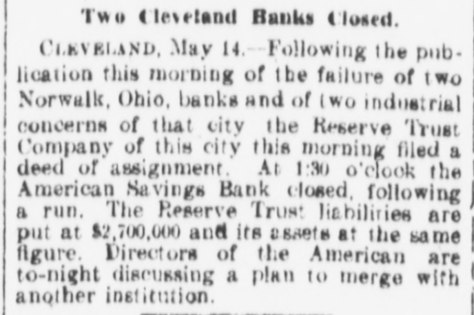 Two Cleveland Banks Closed. CLEVELAND, May 14.-Following the publication this morning of the failure of two Norwalk, Ohio, banks and of two industrial concerns of that city the Reserve Trust Company of this city this morning filed a deed of assignment. At 1:30 o'clook the American Savings Bank closed, following a run. The Reserve Trust liabilities are put at $2,700,000 and its assets at the same figure. Directors of the American are to-night discussing a plan to merge with another institution.