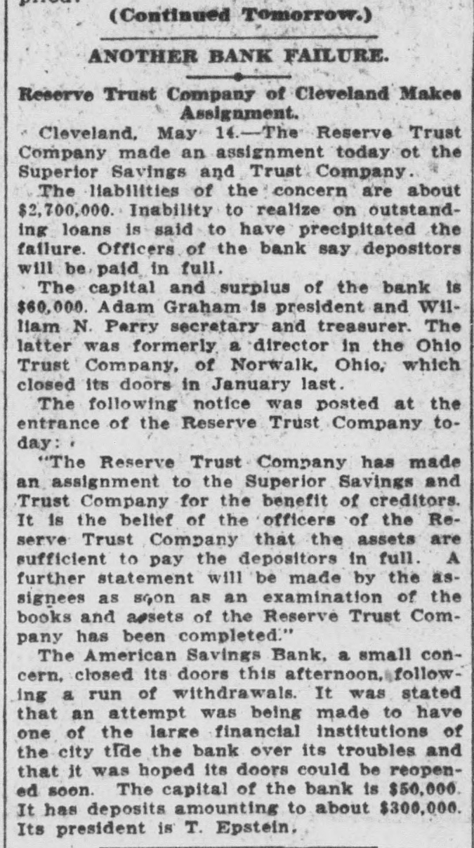 (Continued Tomorrow.) ANOTHER BANK FAILURE. . Reserve Trust Company of Cleveland Makes Assignment. Cleveland, May 14.-The Reserve Trust Company made an assignment today ot the Superior Savings and Trust Company The liabilities of the concern are about $2,700,000. Inability to realize on outstanding loans is said to have precipitated the failure. Officers of the bank say depositors will be. paid in full. The capital and surplus of the bank is $60,000. Adam Graham is president and William N. Perry secretary and treasurer. The latter was formerly a director in the Ohio Trust Company, of Norwalk, Ohio, which closed its doors in January last. The following notice was posted at the entrance of the Reserve Trust Company today: "The Reserve Trust Company has made an assignment to the Superior Savings and Trust Company for the benefit of creditors. It is the beltef of the officers of the Reserve Trust Company that the assets are sufficient to pay the depositors in full. A further statement will be made by the assignees as sion as an examination of the books and assets of the Reserve Trust Company has been completed." The American Savings Bank, a small concern. closed its doors this afternoon, following a run of withdrawals. It was stated that an attempt was being made to have one of the large financial institutions of the city tide the bank over its troubles and that it was hoped its doors could be reopened soon. The capital of the bank is $50,000. It has deposits amounting to about $300,000. Its president is T. Epstein.