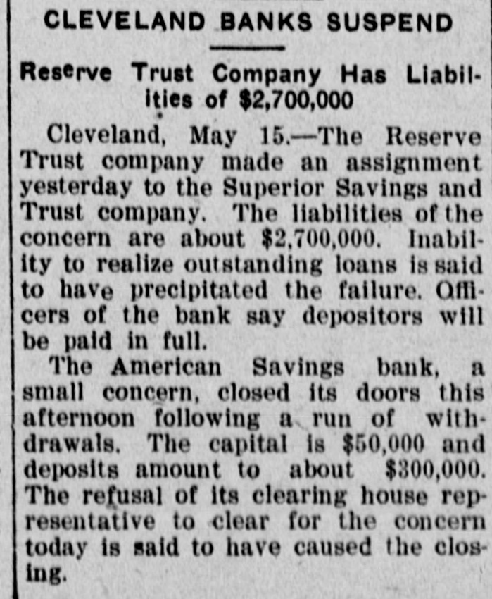 Multiple contemporaneous newspaper accounts (May 14–15, 1908) report the Reserve Trust Company of Cleveland made an assignment to the Superior Savings & Trust Co. because of inability to realize on loans; depositors were said likely to be paid. The articles describe an assignment/closing (i.e., suspension leading to permanent closure/assignment). Separate articles mention a run on the American Savings Bank (different institution) — that run is not for the Reserve Trust Company.