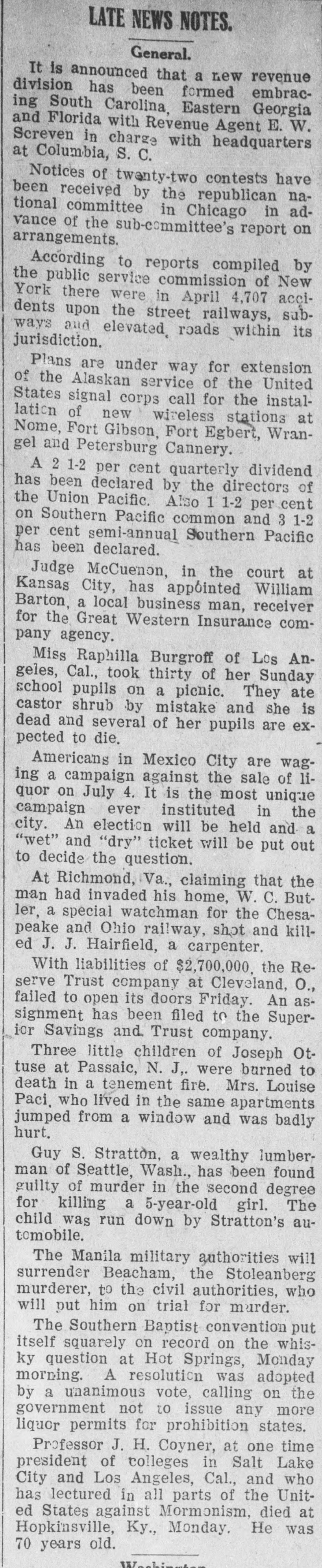 LATE NEWS NOTES. General. It is announced that a new revenue division has been formed embracing South Carolina. Eastern Georgia and Florida with Revenue Agent E. W. Screven in charge with headquarters at Columbia, S. C. Notices of twenty-two contests have been received by the republican national committee in Chicago in adarrangements. vance of the sub-committee's report on According to reports compiled by the public service commission of New York there were in April 4,707 accidents upon the street railways, subjurisdiction. ways and elevated. roads within its Plans are under way for extension of the Alaskan service of the United States signal corps call for the installation of new wireless stations at Nome, Fort Gibson, Fort Egbert, Wrangel and Petersburg Cannery. A 2 1-2 per cent quarterly dividend has been declared by the directors of the Union Pacific. Also 1 1-2 per cent on Southern Pacific common and 3 1-2 per cent semi-annual Southern Pacific has been declared. Judge McCuenon, in the court at Kansas City, has appointed William Barton, a local business man, receiver for the Great Western Insurance company agency. Miss Raphilla Burgroff of Los Angeles, Cal., took thirty of her Sunday school pupils on a picnic. They ate castor shrub by mistake and she is dead and several of her pupils are expected to die. Americans in Mexico City are waging a campaign against the sale of liquor on July 4. It is the most unique campaign ever instituted in the city. An election will be held and a "wet" and "dry" ticket will be put out to decide the question. At Richmond, Va., claiming that the man had invaded his home, W. C. Butler, a special watchman for the Chesapeake and Ohio railway, shot and killed J. J. Hairfield, a carpenter. With liabilities of $2,700,000. the Reserve Trust company at Cleveland, O., failed to open its doors Friday. An assignment has been filed to the Superior Savings and Trust company. Three little children of Joseph Ottuse at Passaic, N. J,, were burned to death in a tenement fire. Mrs. Louise Paci. who lived in the same apartments jumped from a window and was badly hurt. Guy S. Stratton, a wealthy lumberman of Seattle, Wash., has been found guilty of murder in the second degree for killing a 5-year-old girl. The child was run down by Stratton's automobile. The Manila military authorities will surrender Beacham, the Stoleanberg murderer, to the civil authorities, who will put him on trial for murder. The Southern Baptist convention put itself squarely on record on the whisky question at Hot Springs, Monday morning. A resolution was adopted by a unanimous vote, calling on the government not to issue any more liquor permits for prohibition states. Professor J. H. Coyner, at one time president of colleges in Salt Lake City and Los Angeles, Cal., and who has lectured in all parts of the United States against Mormonism. died at Hopkinsville, Ky., Monday. He was 70 years old. Weshinuton